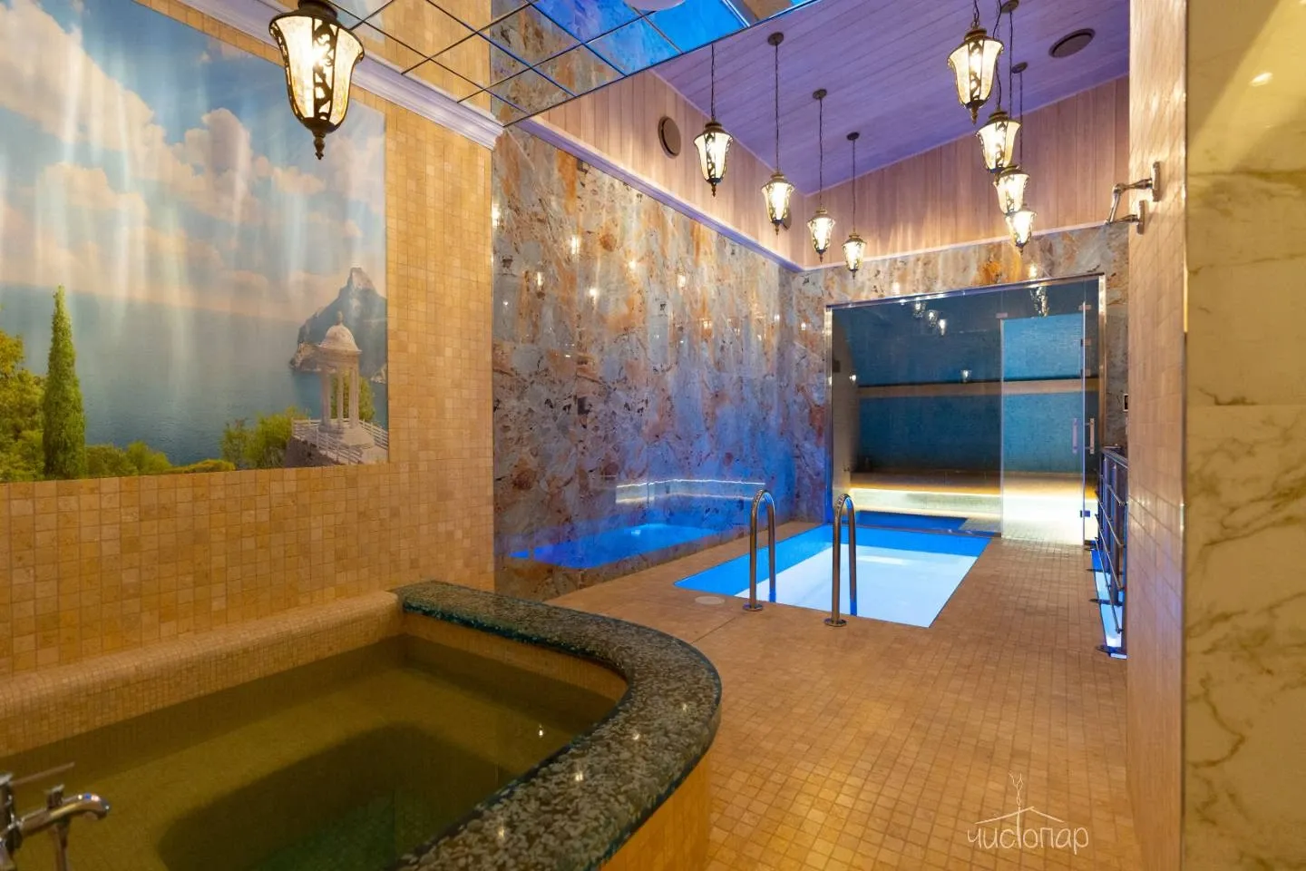 Опытный банщик готов организовать на ваш выбор как сухой пар (вроде финской сауны), так и влажный (наподобие турецкого хаммама). В комплекс предлагаемых услуг по желанию клиента возможно также включение ароматических пропарок и массажа. После посещения парилки у каждого посетителя имеется великолепная возможность окунуться в бассейне, оснащенном гидромассажем и функцией подогрева воды. Для тех, кто желает вновь подышать горячим паром, оборудован специальный подныр, прямиком ведущий обратно в парную. Для обеспечения полной релаксации на территории расположено джакузи.Читать далее