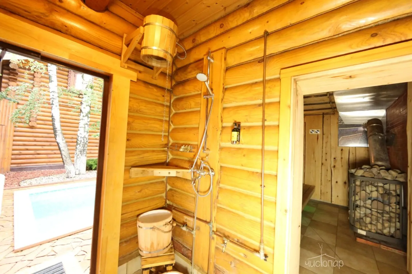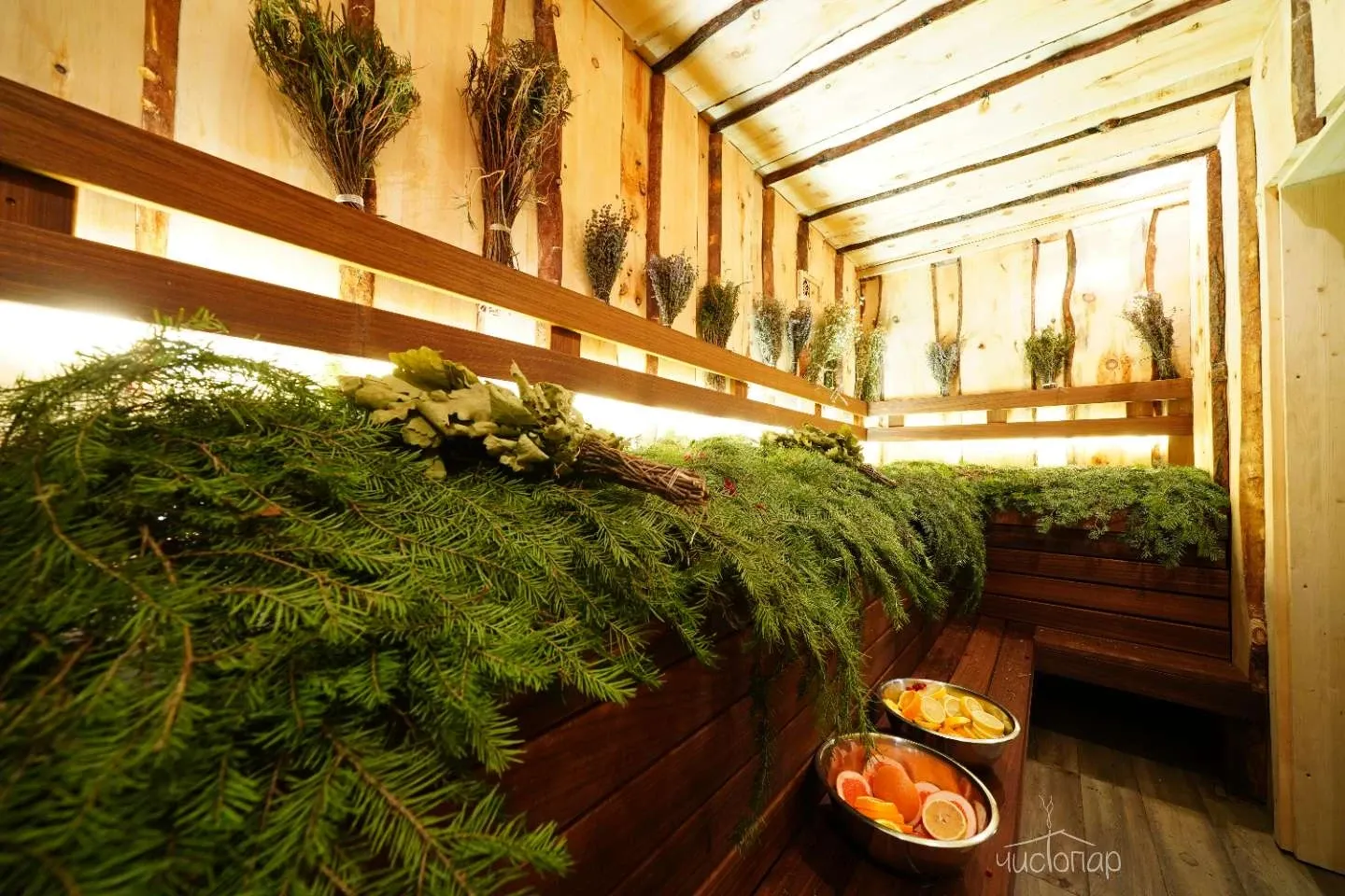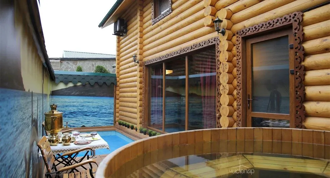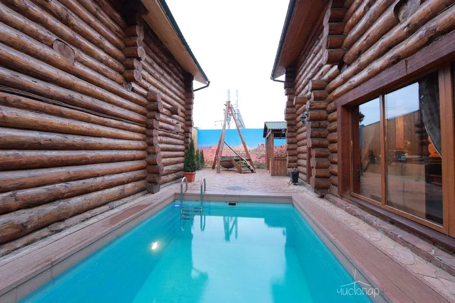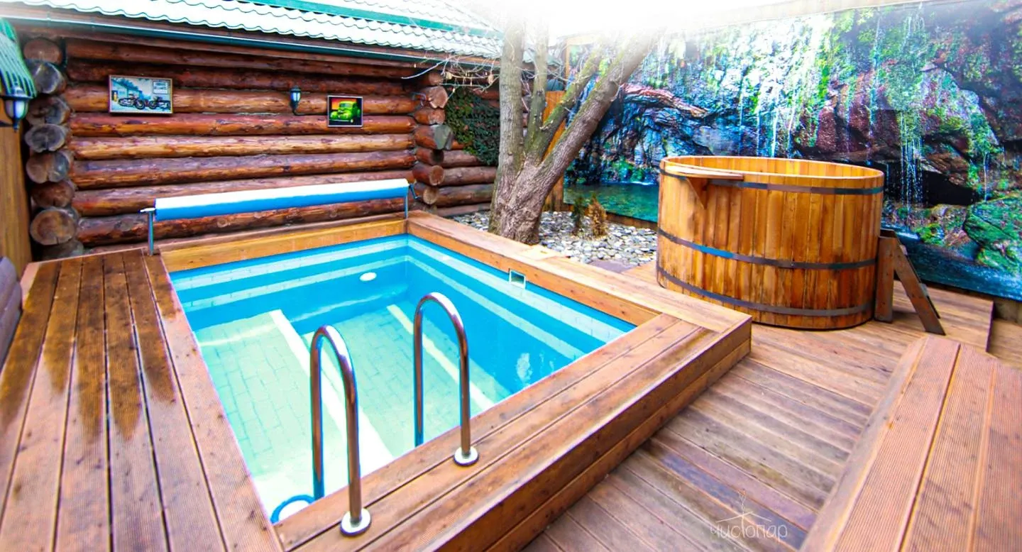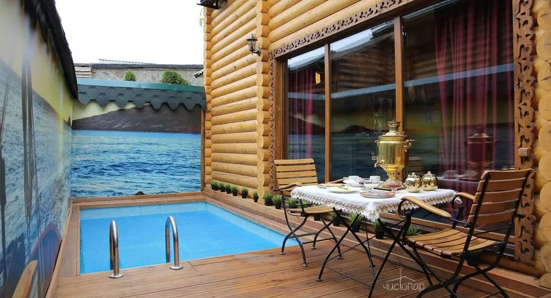 11 срубов вместимостью от 8 до 15 человек полностью автономны, оборудованы собственными саунами, парными, бассейнами и бочками-купелями;
