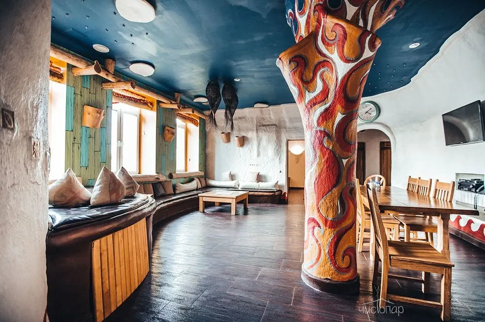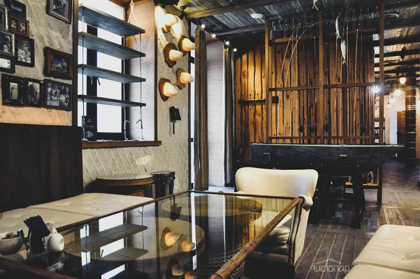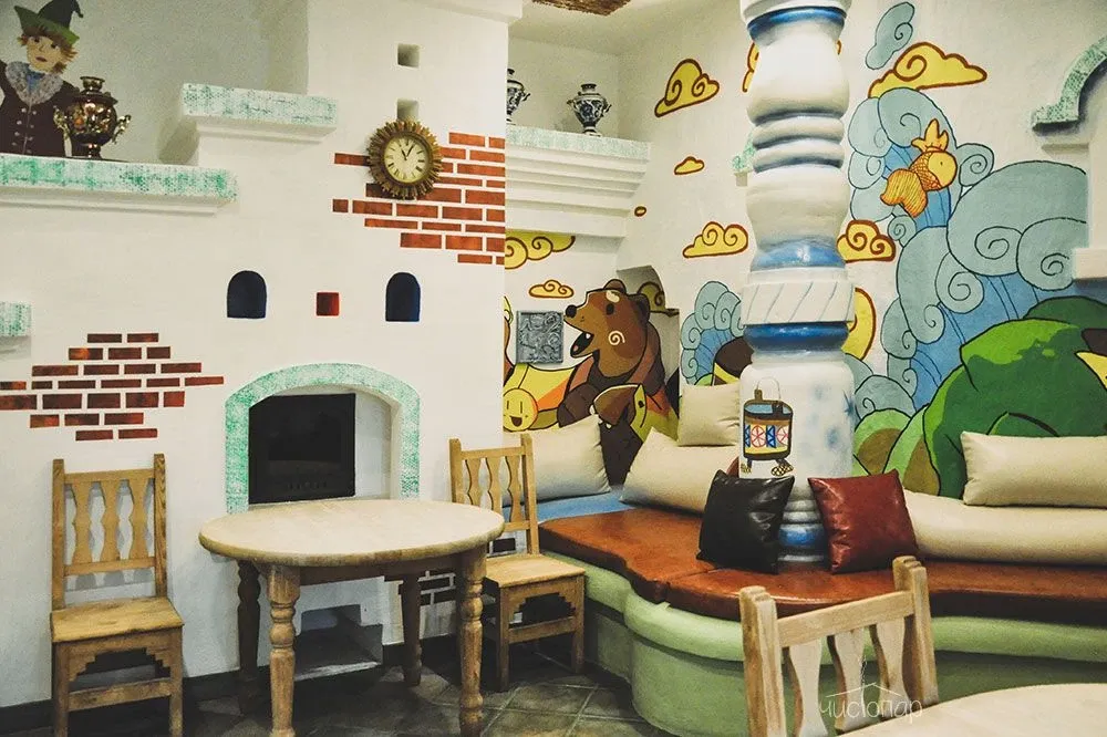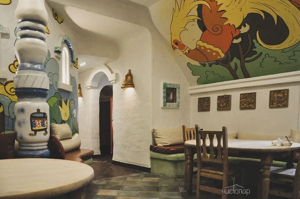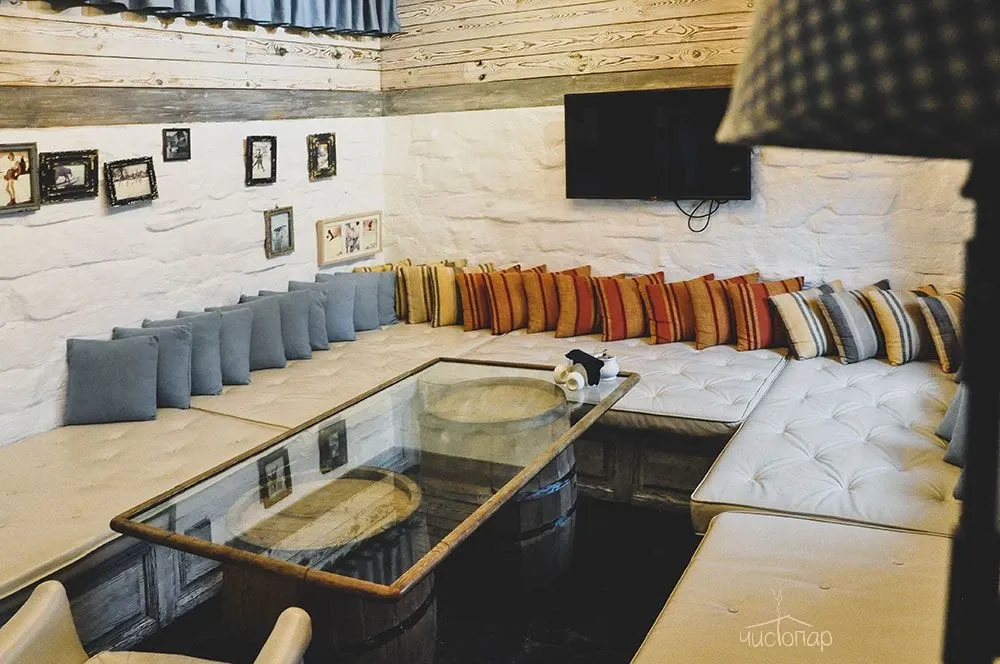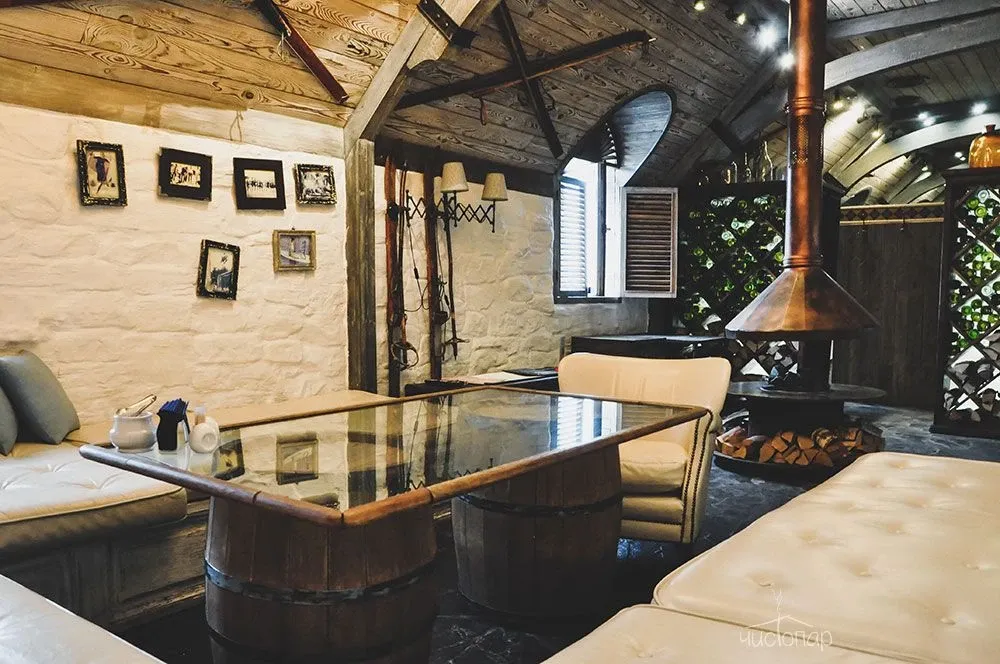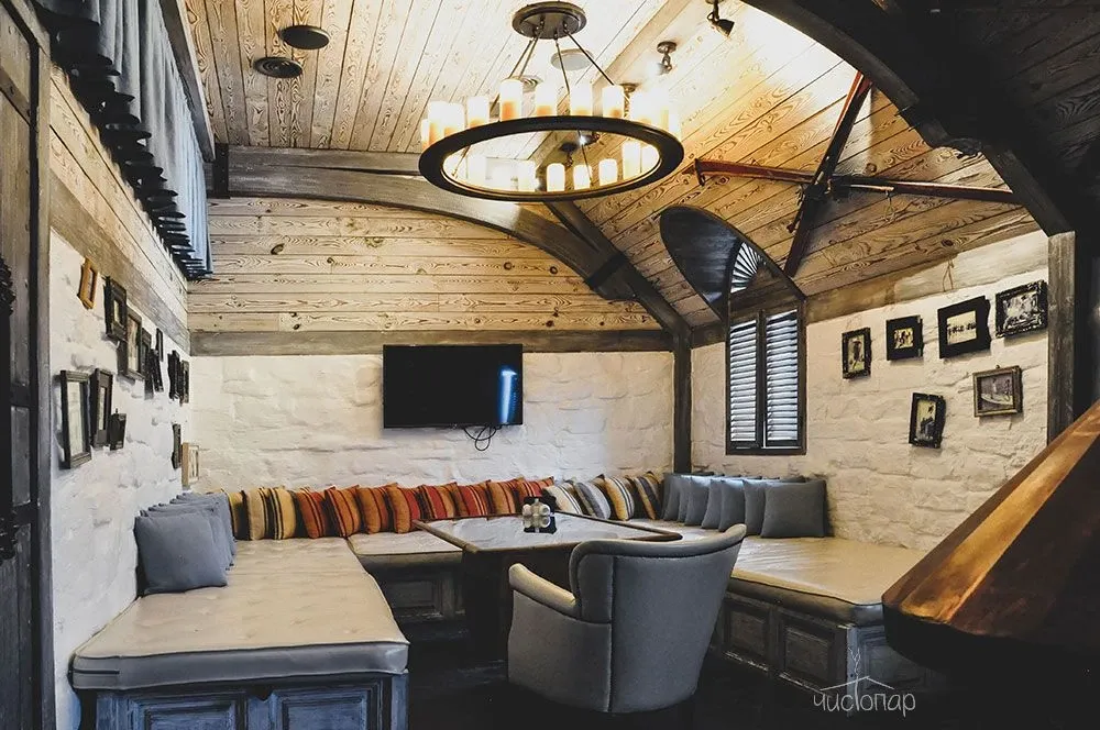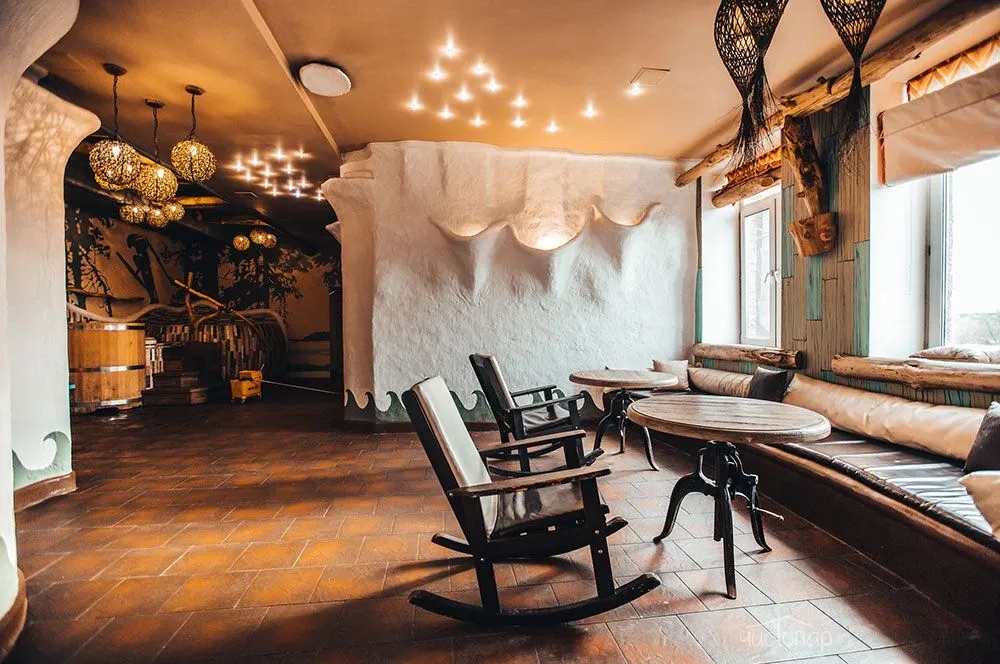 Напоминает маленький уютный домик в альпийских горах. Интерьер погружает нас в тёплую атмосферу спокойствия безмятежности. Мягкий приглушенный свет дарит умиротворение и помогает расслабиться.