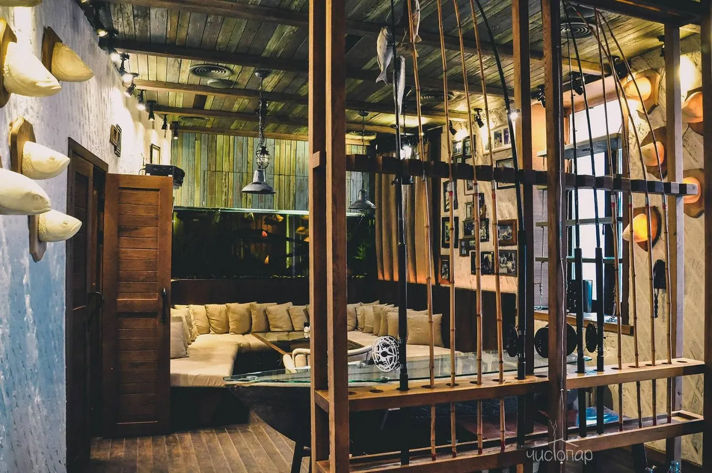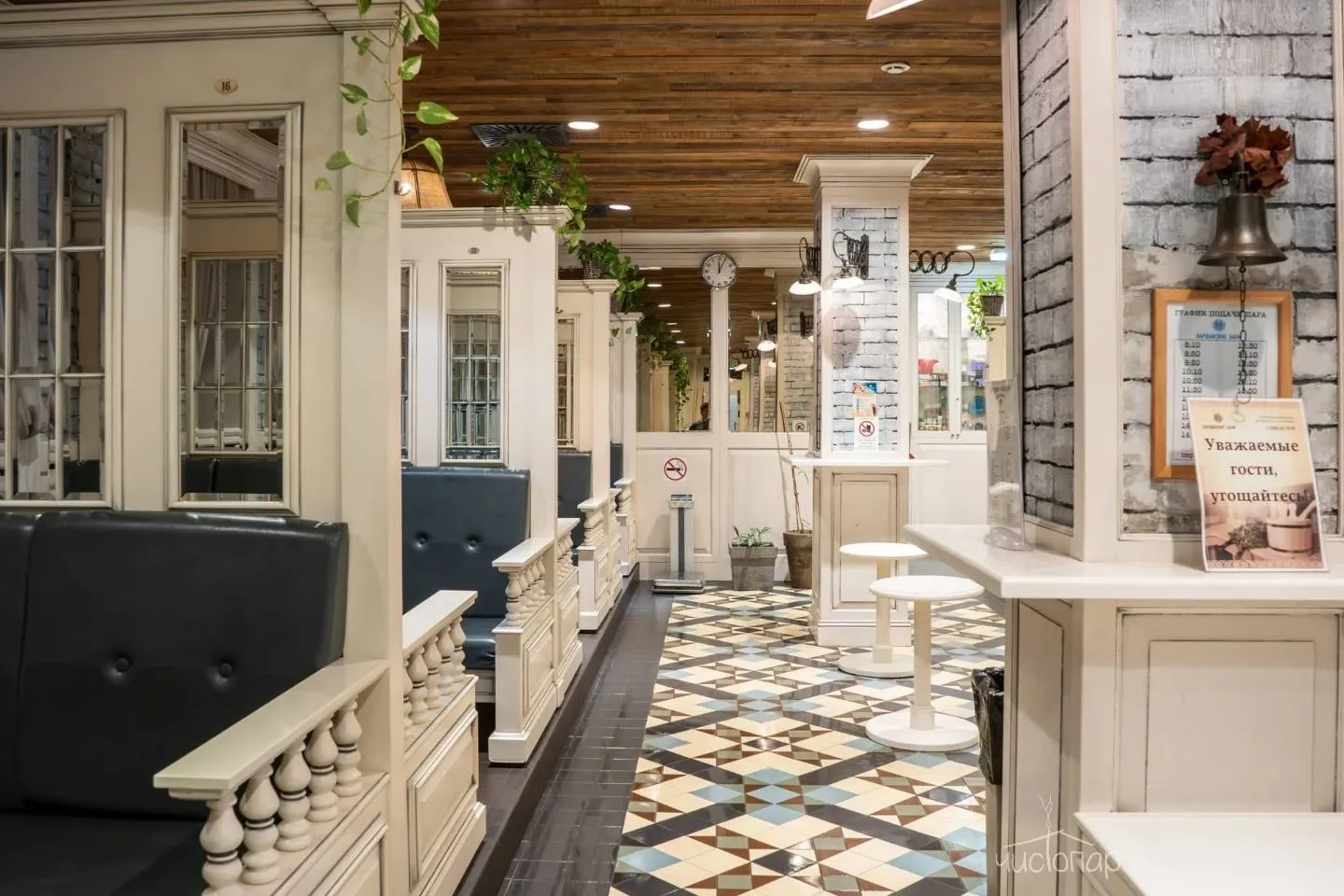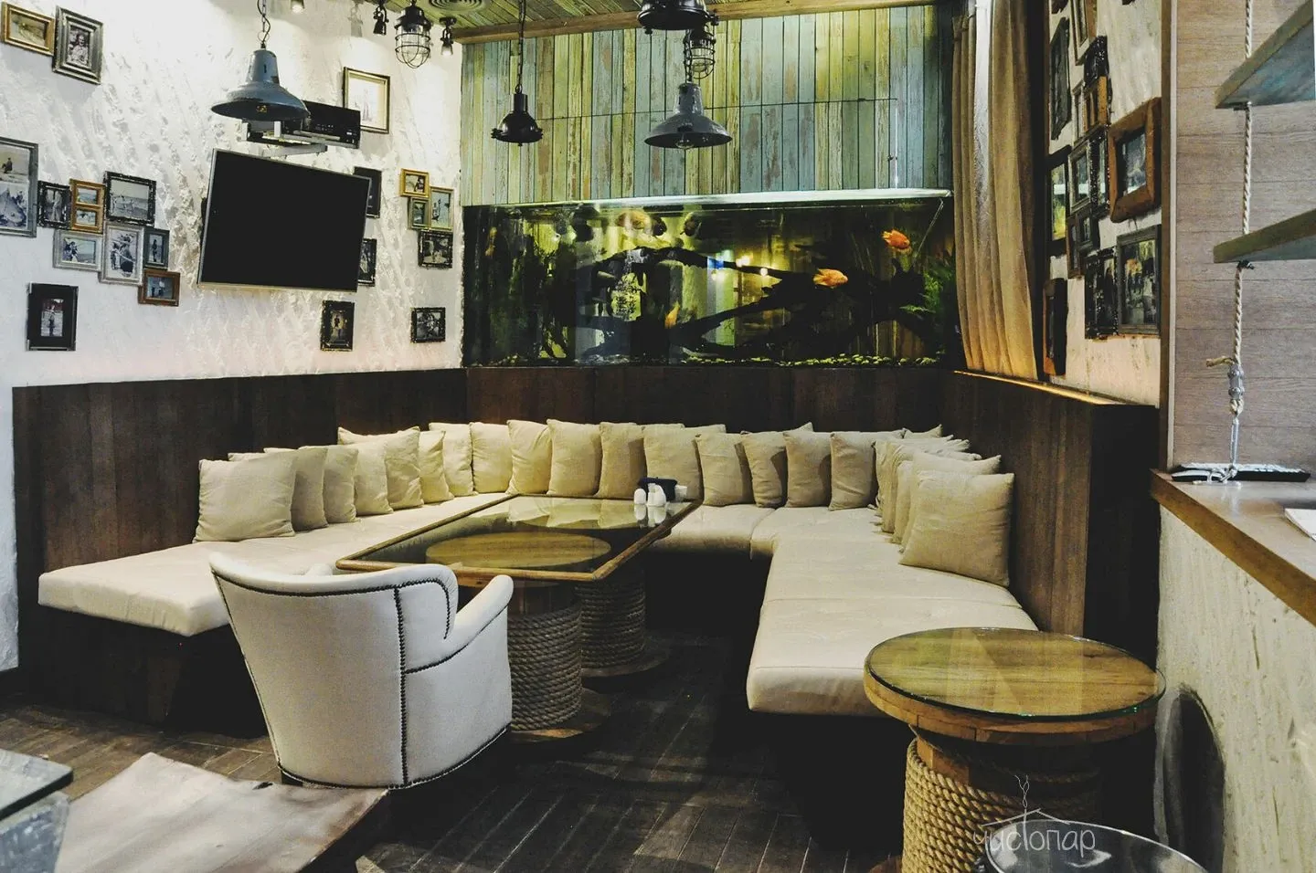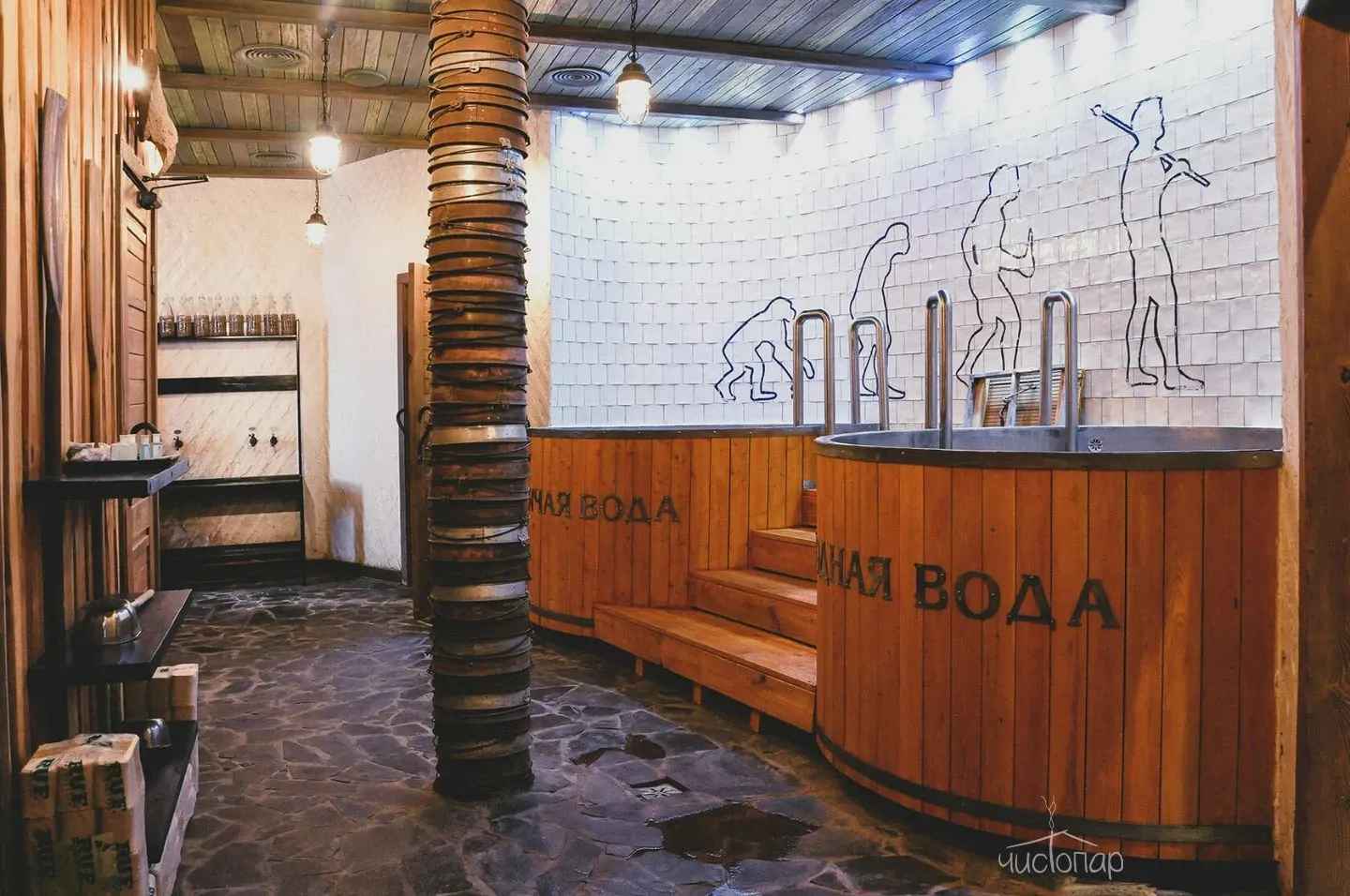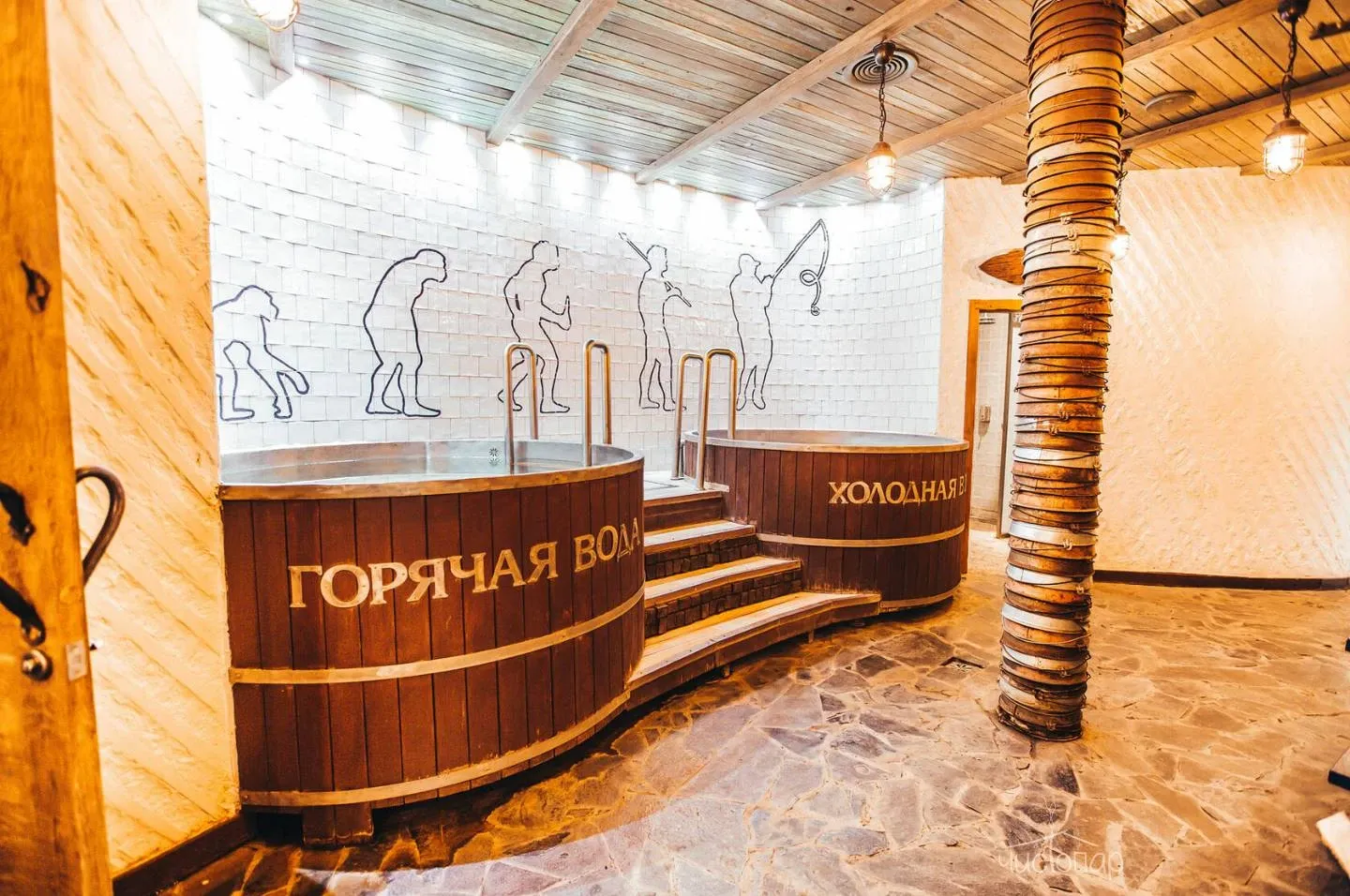 Напоминает маленький уютный домик в альпийских горах. Интерьер погружает нас в тёплую атмосферу спокойствия безмятежности. Мягкий приглушенный свет дарит умиротворение и помогает расслабиться.