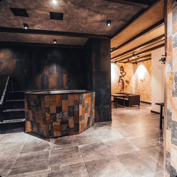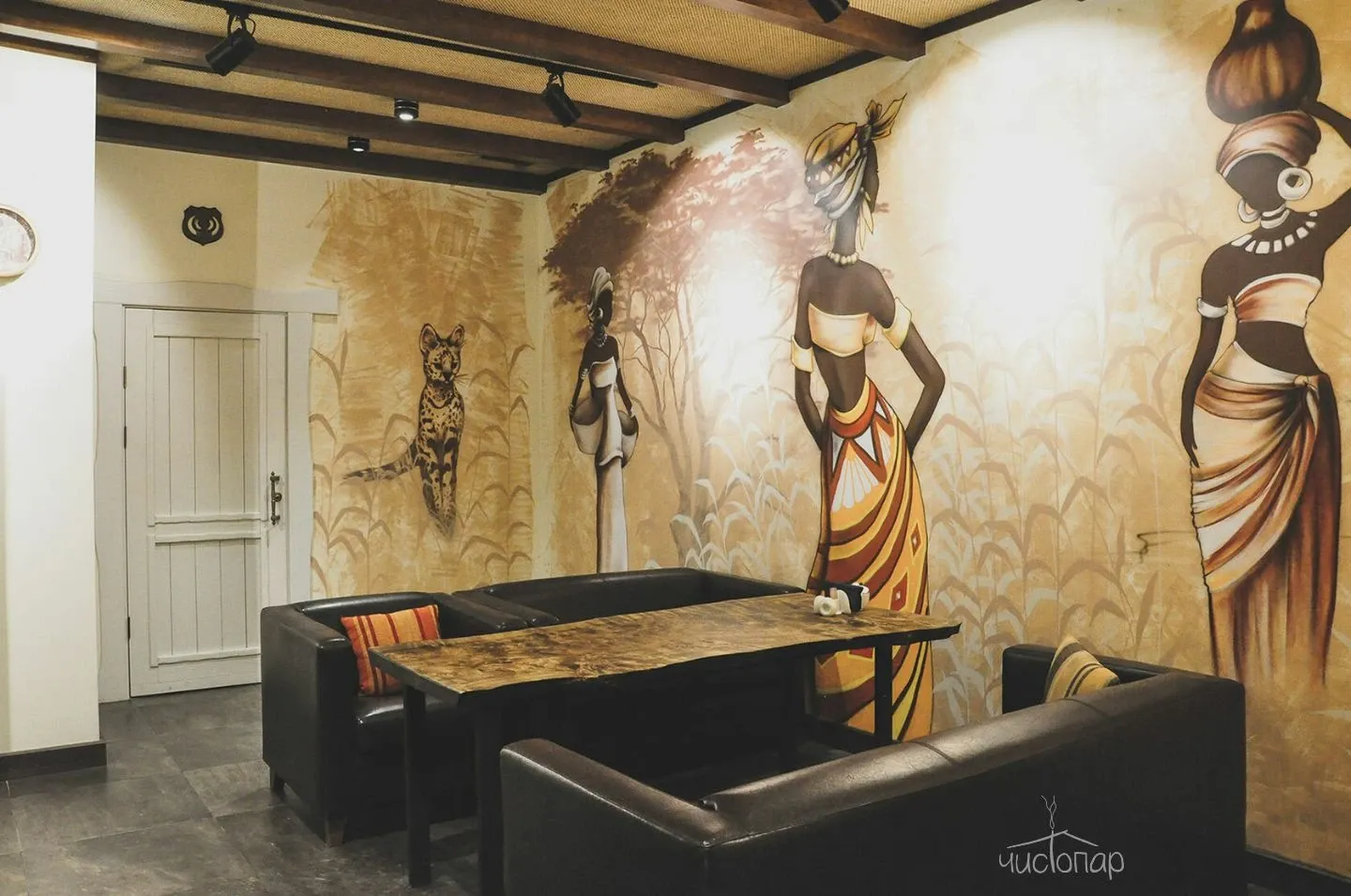 Новый комплекс а Банях Мира. В атмосферу загадочной, далекой Африки гостей погружают великолепные рисунки на стенах и отделка в теплых оттенках. Уютный и очень теплый по настроению номер подойдтет для небольшой компании.