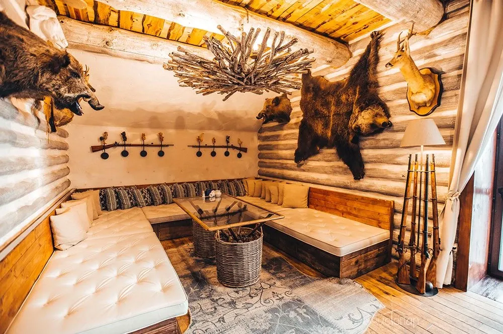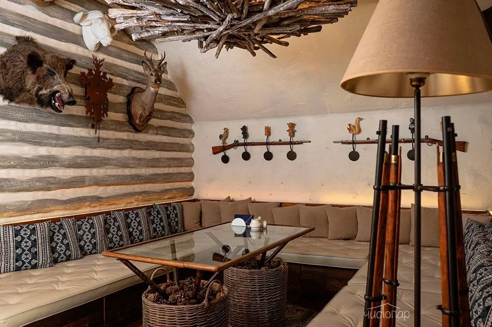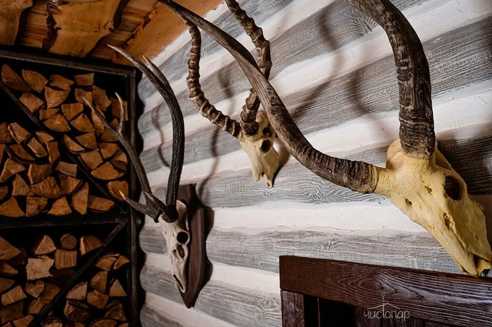 Комплекс в стиле охотничьего домика для любителей дикой природы. Украшен настоящими чучелами животных, наполнен интересными "охотничьими" деталями. Это создает особую атмосферу, которую ценят мужчины.