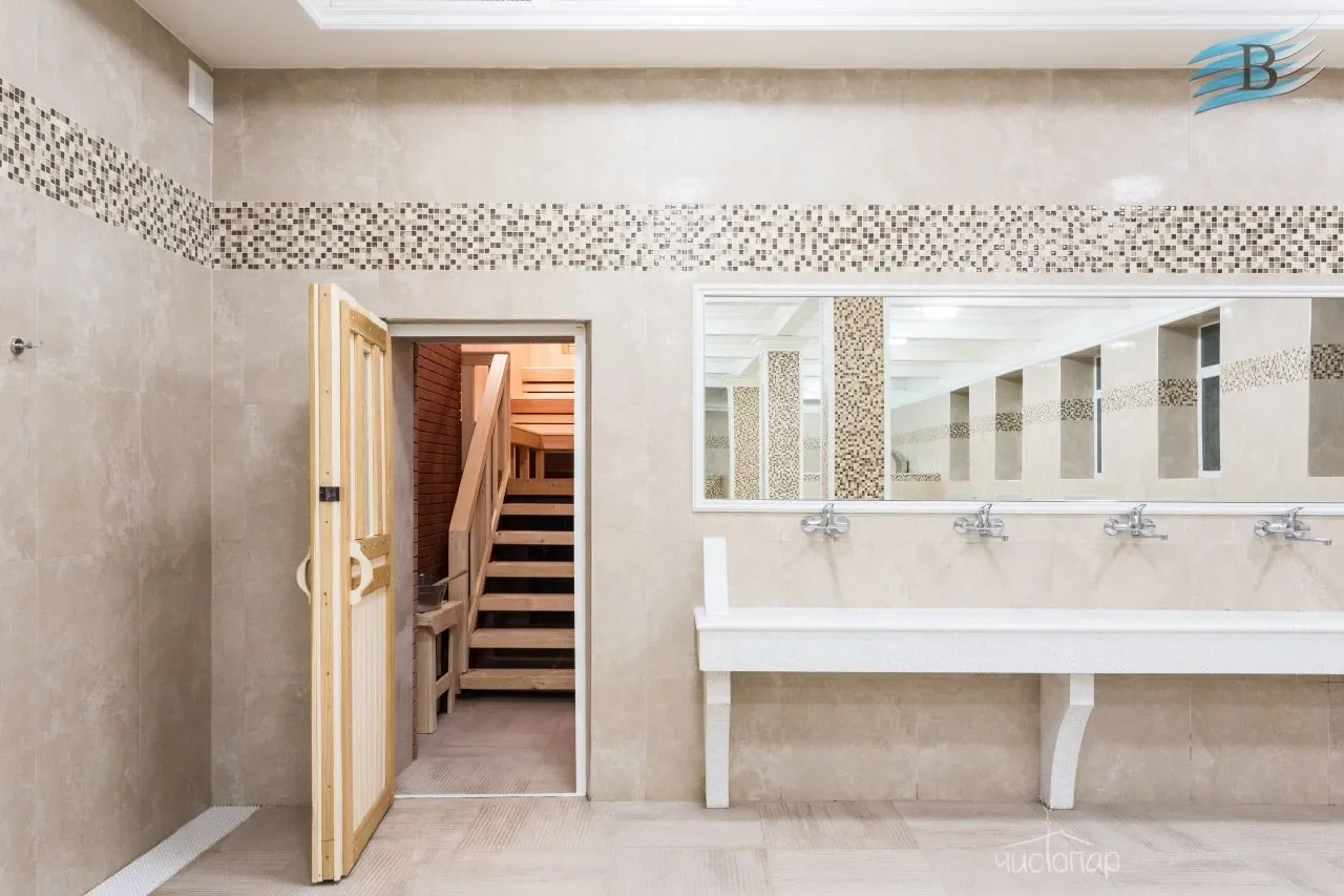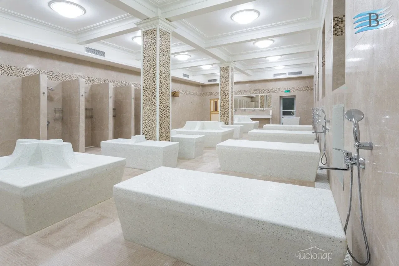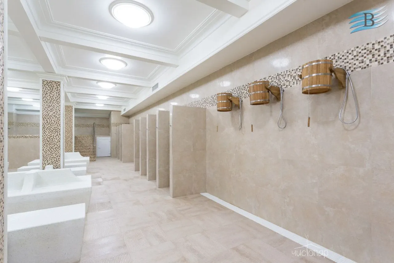 Общественные мужские и женские разряды, тематические залы с саунами, мини-сауны, бассейны, ресторан, отель и прачечная.