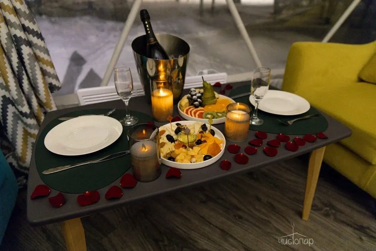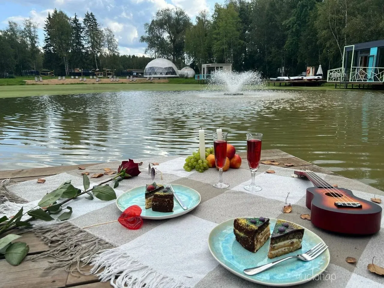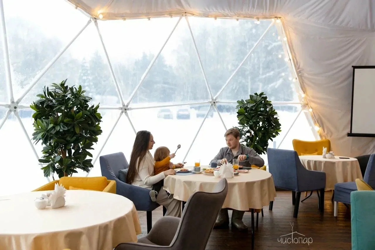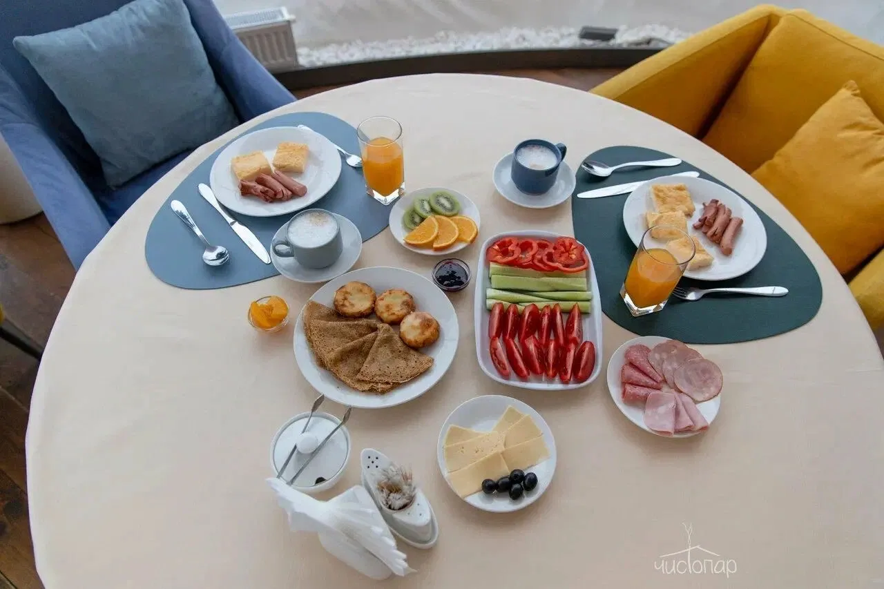 На территории работает купольный ресторан с разнообразными блюдами от шеф-повара, которые также можно заказать и в номер. Есть возможность самостоятельно приготовить барбекю. Помимо этого, в апартаментах имеется чайник, посуда и столовые приборы, а в отдельных категориях есть кухня со всей необходимой техникой для комфортной готовки.