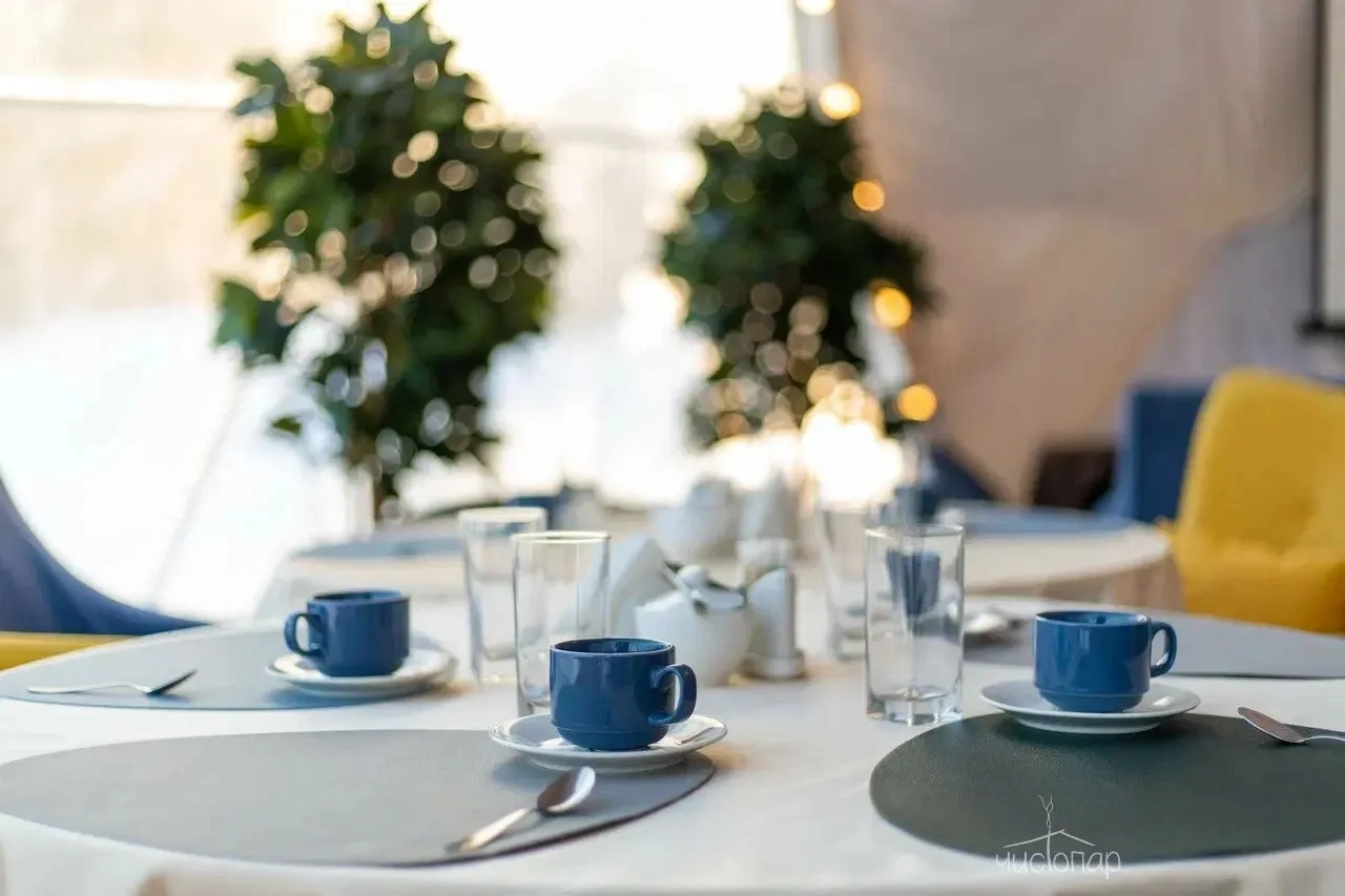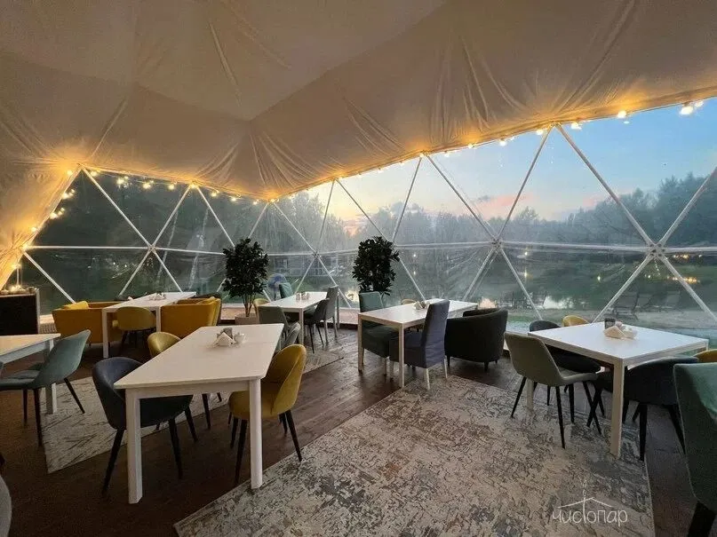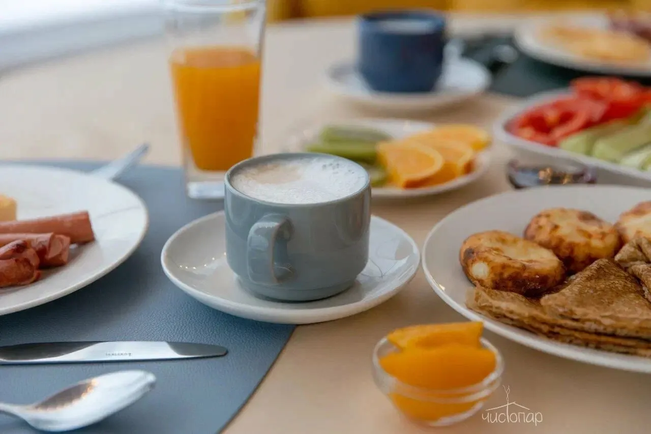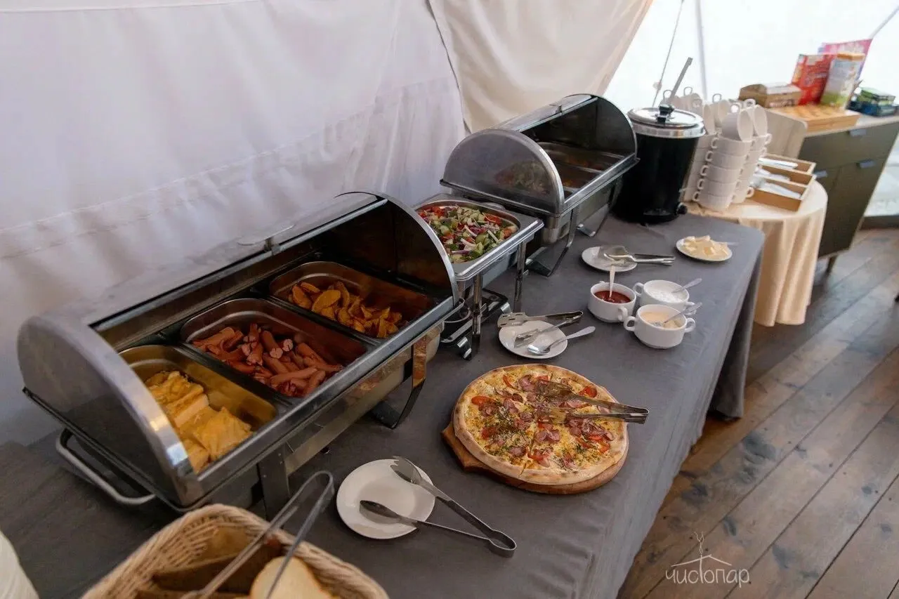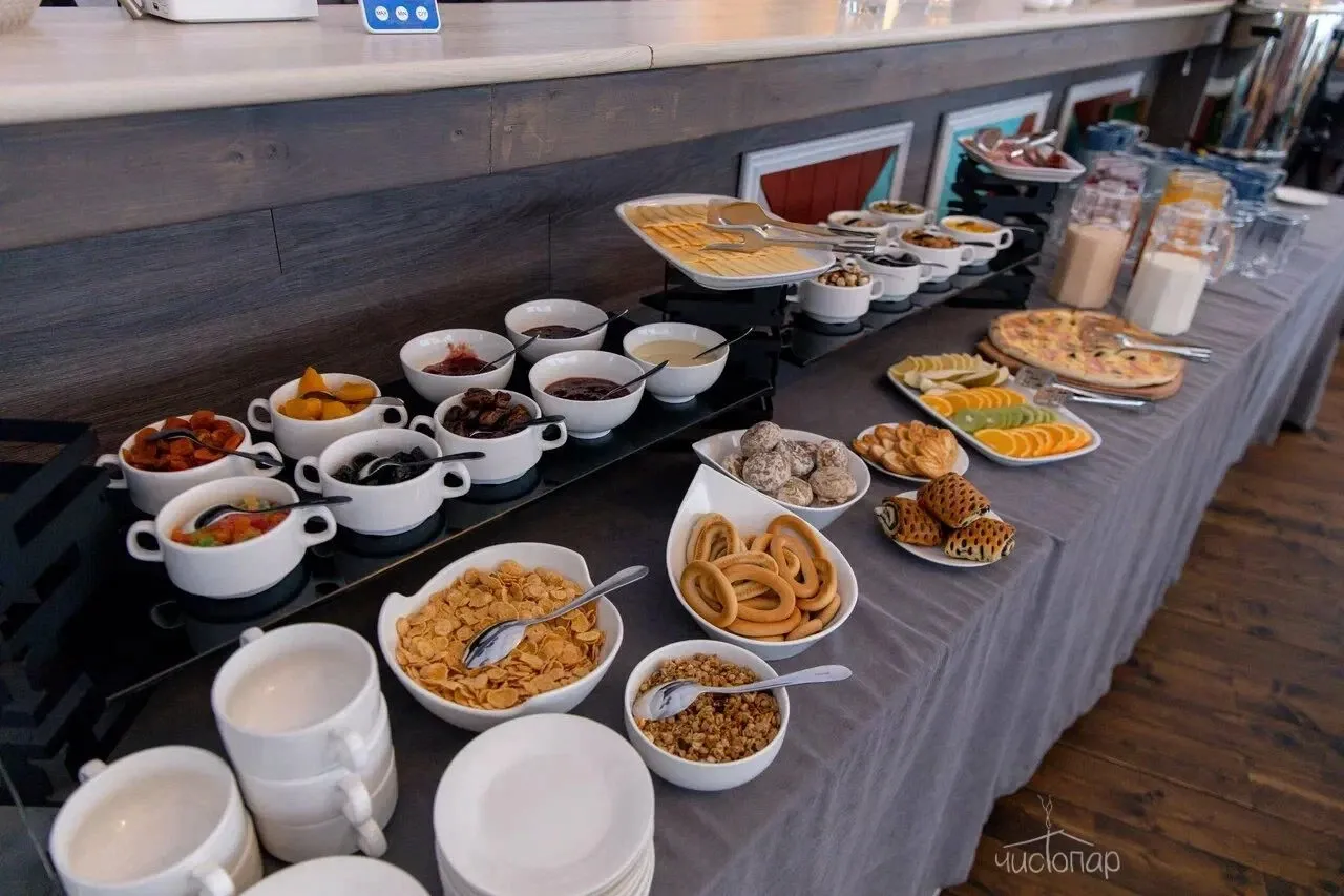 На территории работает купольный ресторан с разнообразными блюдами от шеф-повара, которые также можно заказать и в номер. Есть возможность самостоятельно приготовить барбекю. Помимо этого, в апартаментах имеется чайник, посуда и столовые приборы, а в отдельных категориях есть кухня со всей необходимой техникой для комфортной готовки.