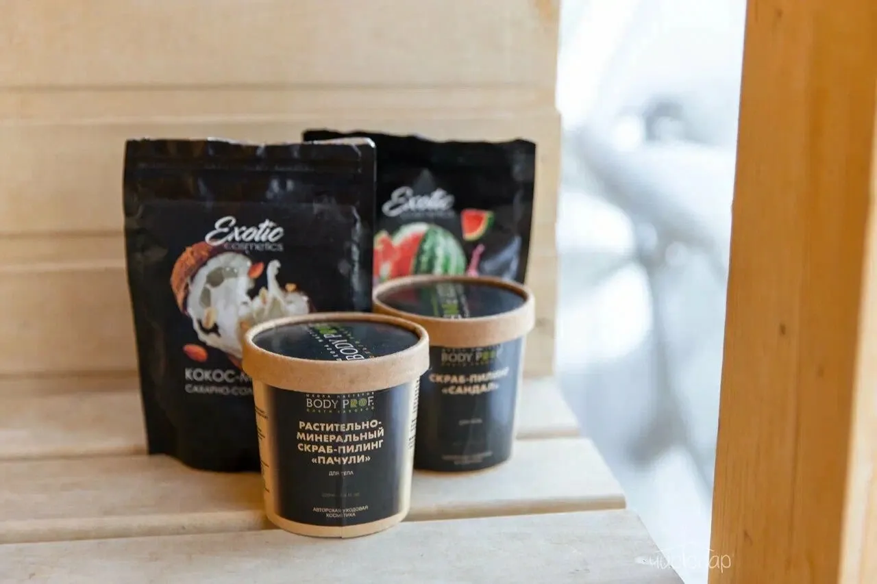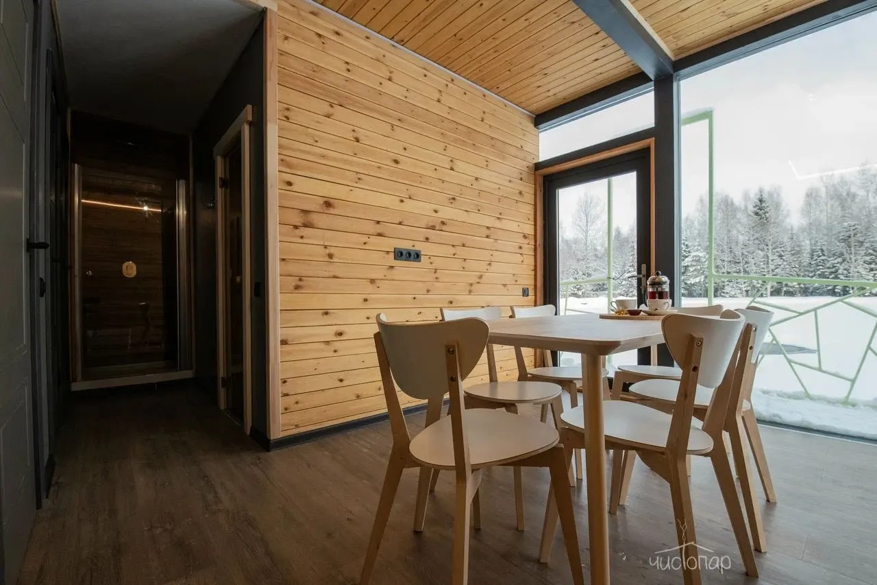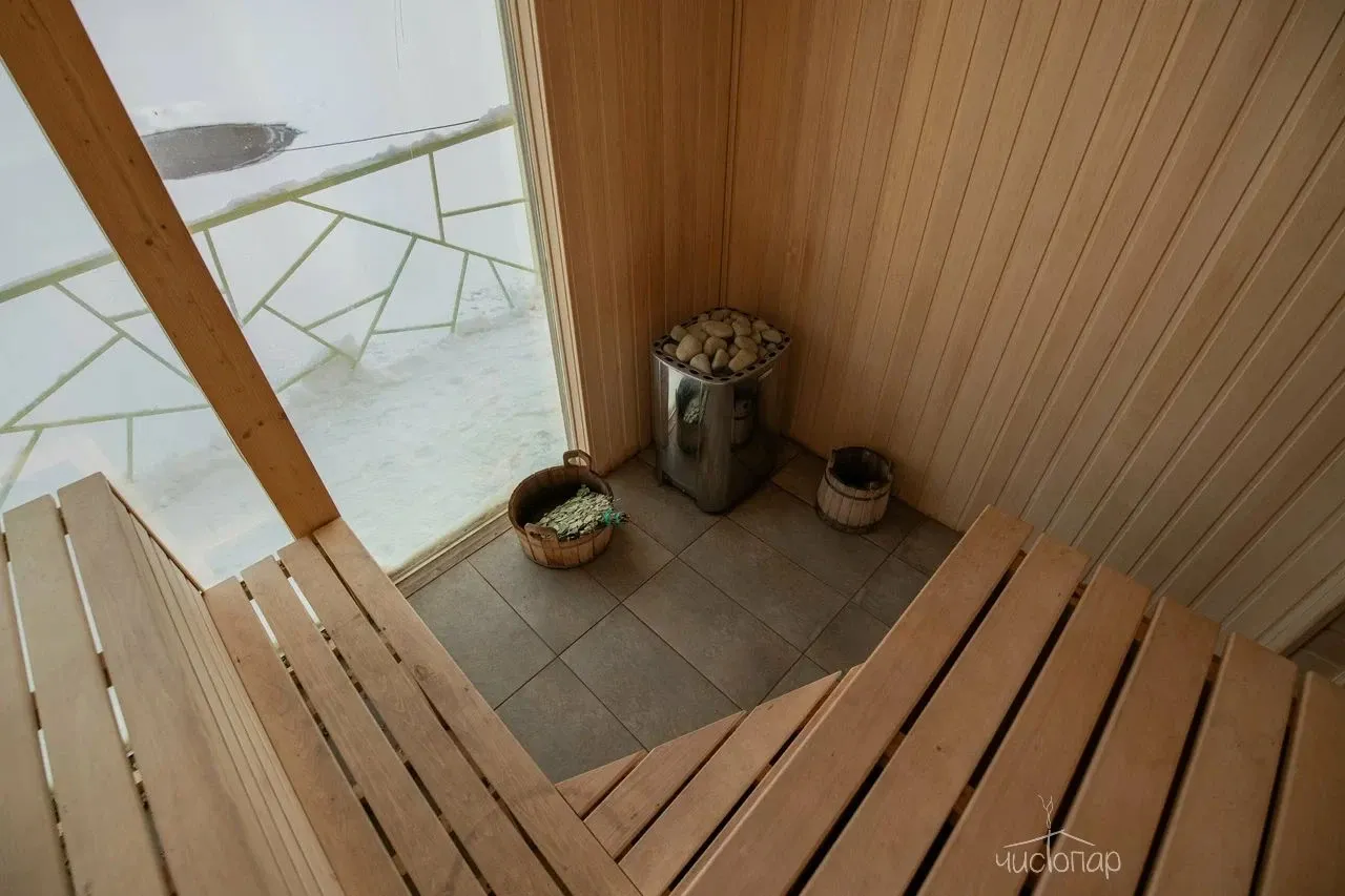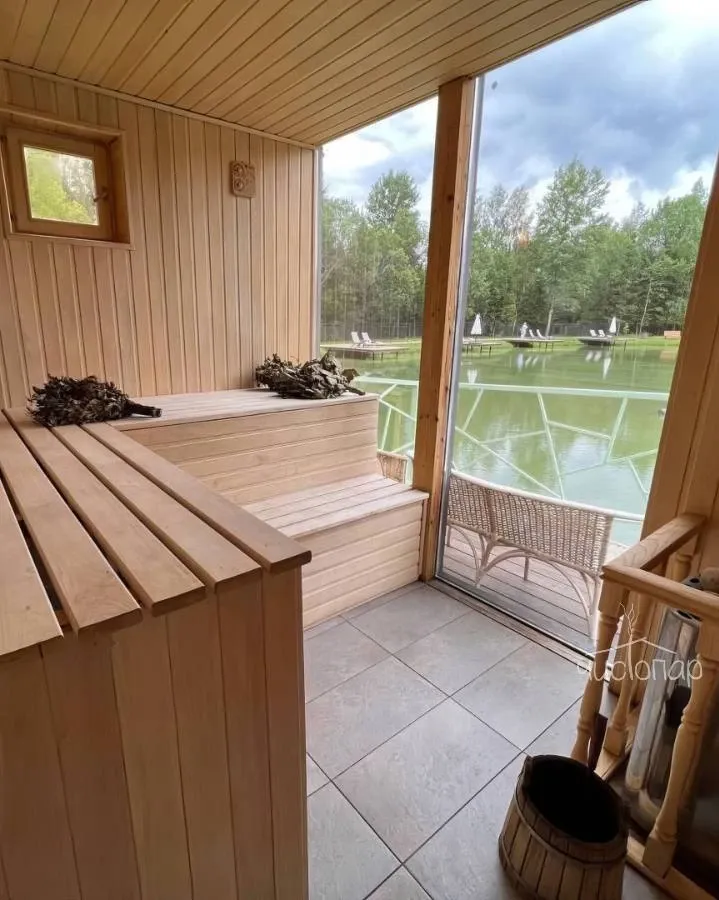 Финская сауна на 6 человек с панорамным видом на пруд, комнатой отдыха с массажным столом. Можно заказать услуги скрабирования или массажа.