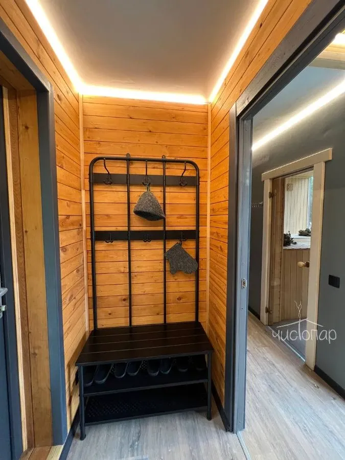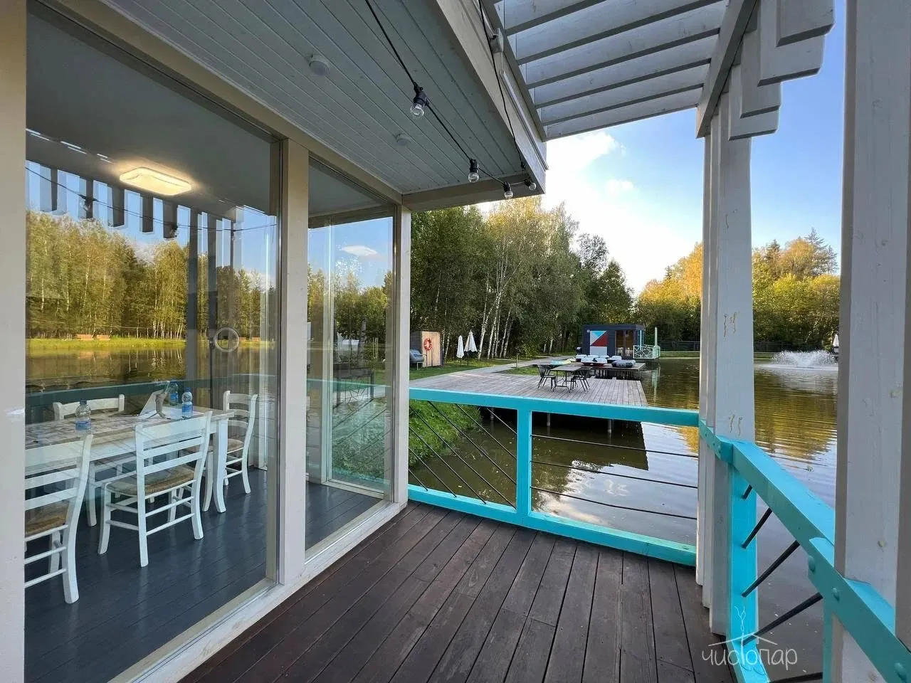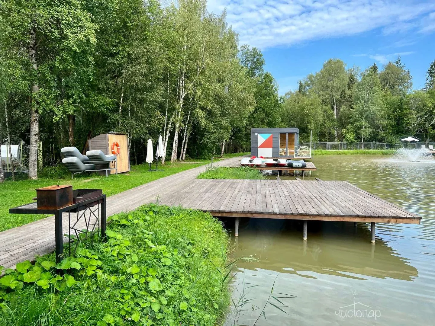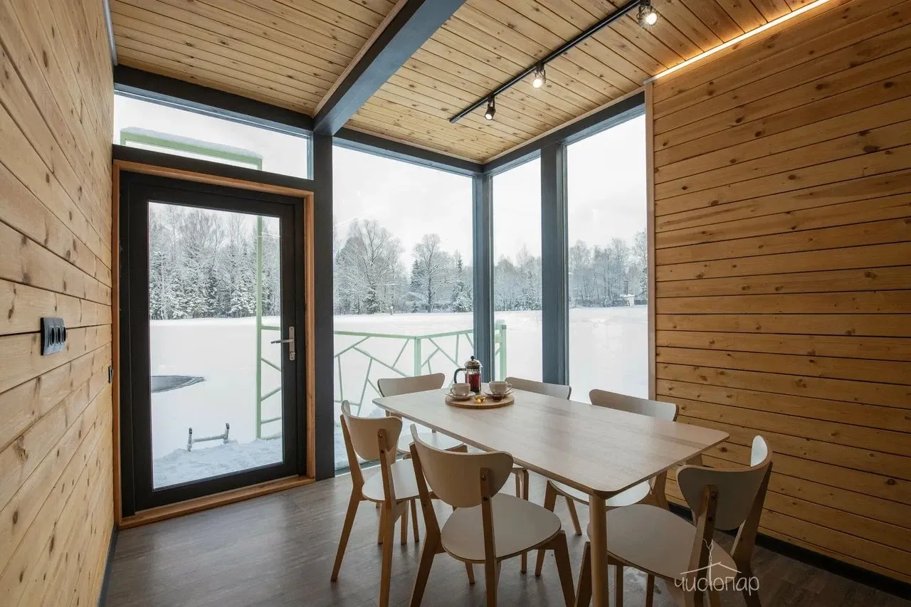 Финская сауна на 6 человек с панорамным видом на пруд, комнатой отдыха с массажным столом. Можно заказать услуги скрабирования или массажа.