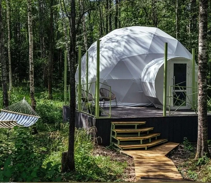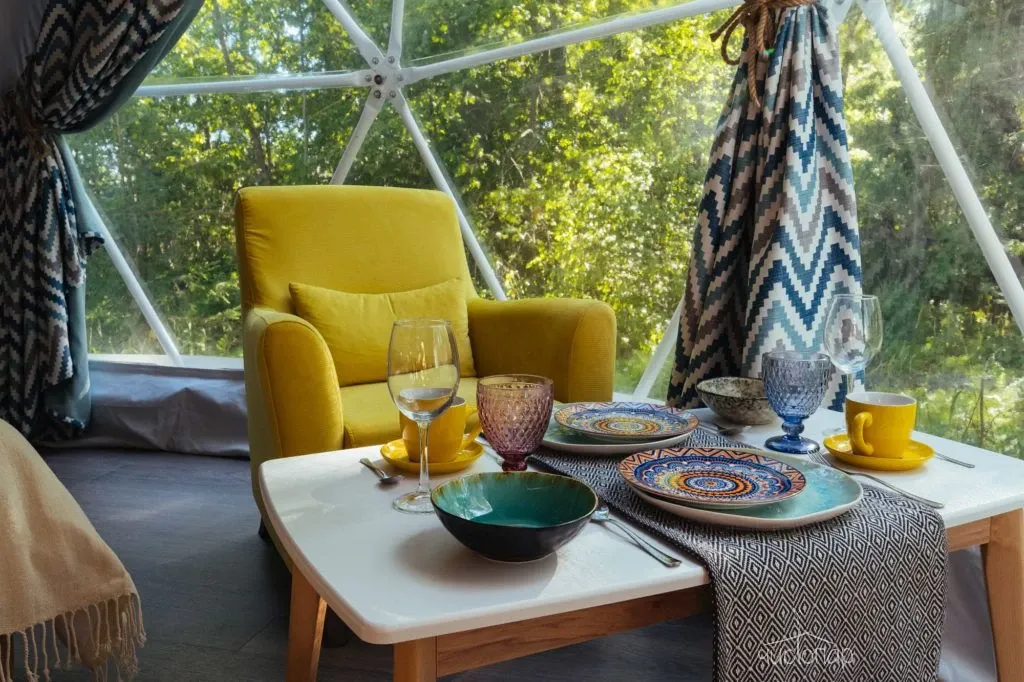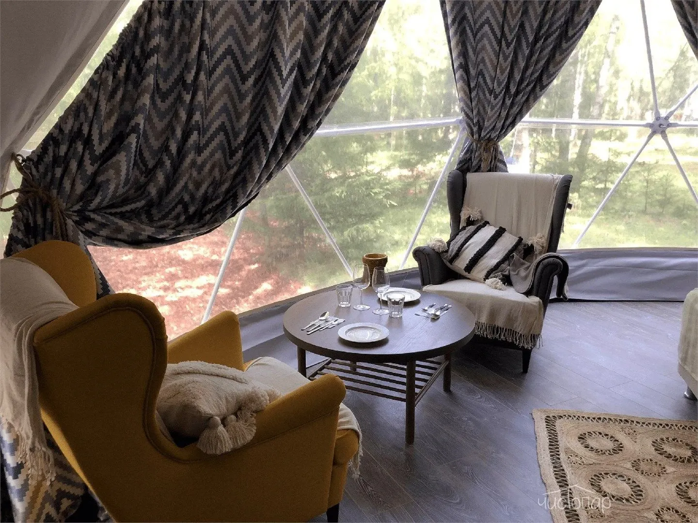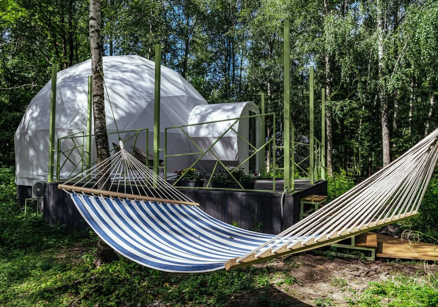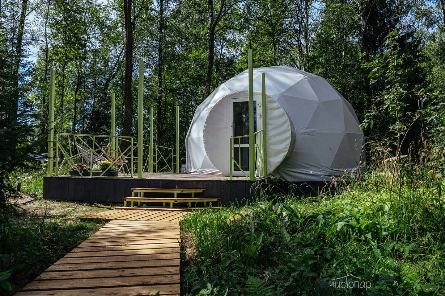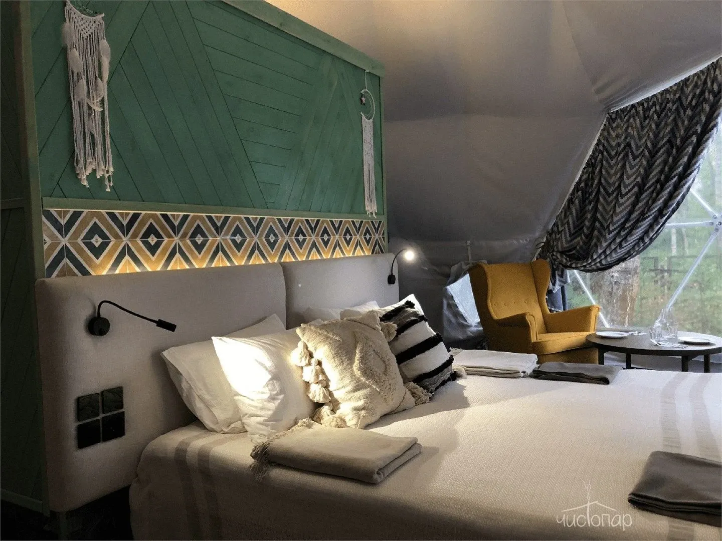 Гостям предлагают расположиться в уютных домиках, а также имеются глэмпы. Каждый оснащен комфортным спальным местом, теплыми полами и собственной ванной комнатой с полотенцами, махровыми халатами и гигиеническими средствами. В домах установлены телевизор и кондиционер, и имеется беспроводной интернет.