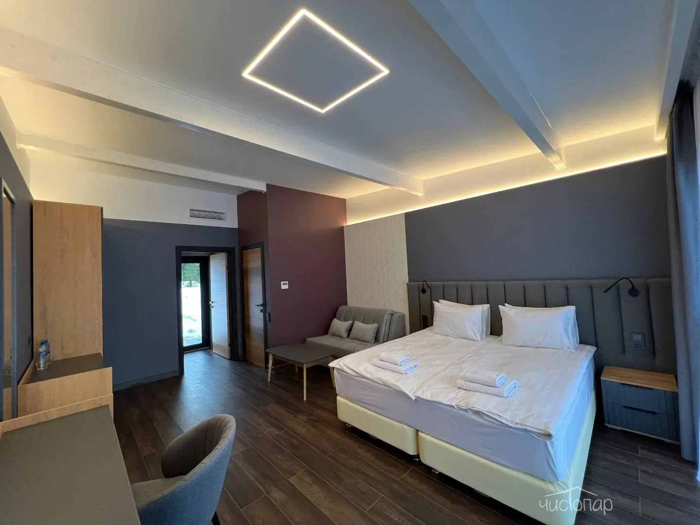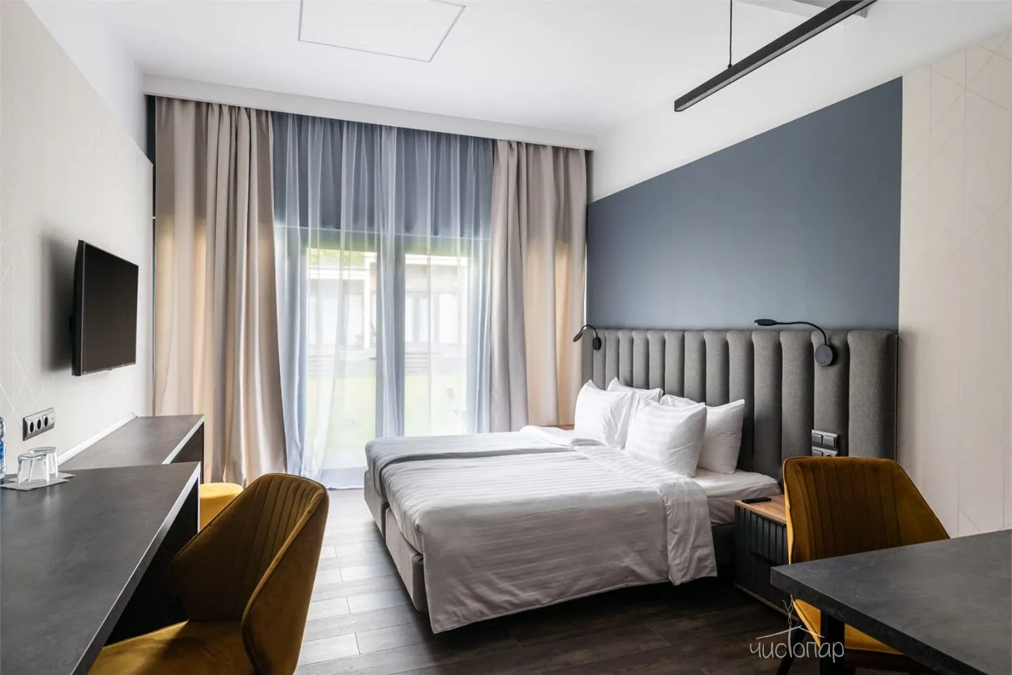 Однокомнатный номер 27-32 кв.м. в составе таунхауса, с удобной кроватью и раскладным диваном, небольшой рабочей зоной, ванной комнатой и мини-террасой. Если вы планируете отдыхать большой семьей или компанией, мы можем предложить сообщающиеся между собой номера данной категории, имеющие общую дверь. Это удобно: не нужно выходить в коридор, чтобы попасть в соседний номер. Этот стильный номер — идеальное место для размещения небольшой семьи с ребенком или двумя или трех взрослых. Кровать размером 180х200 см с фирменными матрасами и белоснежное постельное белье — отличная возможность выспаться и восстановить силы. В ванной комнате - теплый пол, фен, современная душевая и туалетные принадлежности. В каждом номере есть выход на мини-террасу с садовой мебелью, где можно отдохнуть на свежем воздухе.