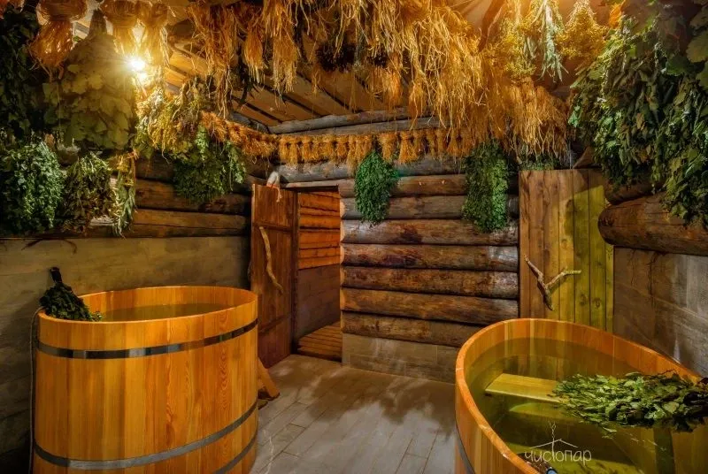 душевно попариться в бане на дровах с дубовыми, березовыми, пихтовыми, липовыми и можжевеловыми вениками;