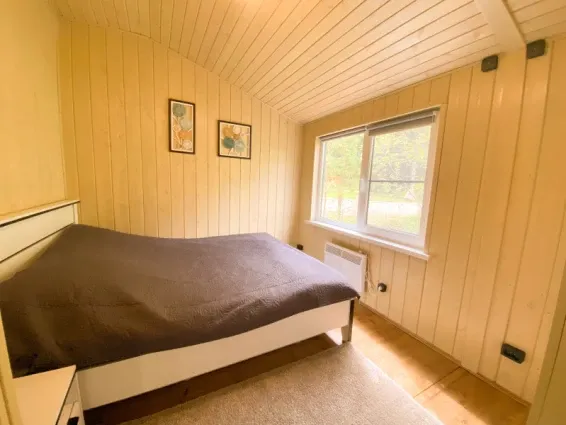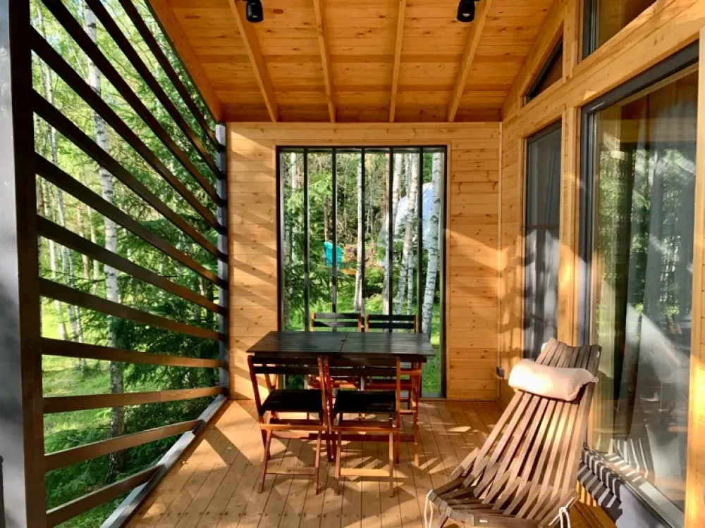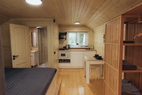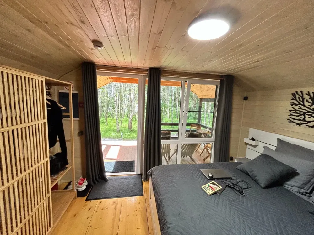 В доме большие панорамные окна с видом на озеро, большая двуспальная кровать с ортопедическим матрацем, диван-кровать на 2 спальных места, кухня, холодильник, микроволновая печь, индукционная плита с набором посуды, чайник, чайный набор, обеденный стол, стулья, набор столовой посуды. Отопление – электрические конвекторы с памятью режимов настроек. Бесплатный Wi-Fi. Размещение 2 взрослых места, 1 или 2 дополнительных места по запросу за доплату, детская кроватка – по запросу. Площадь дома 28 м2.