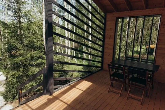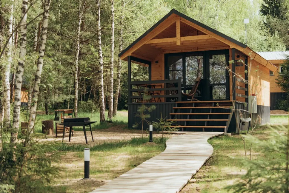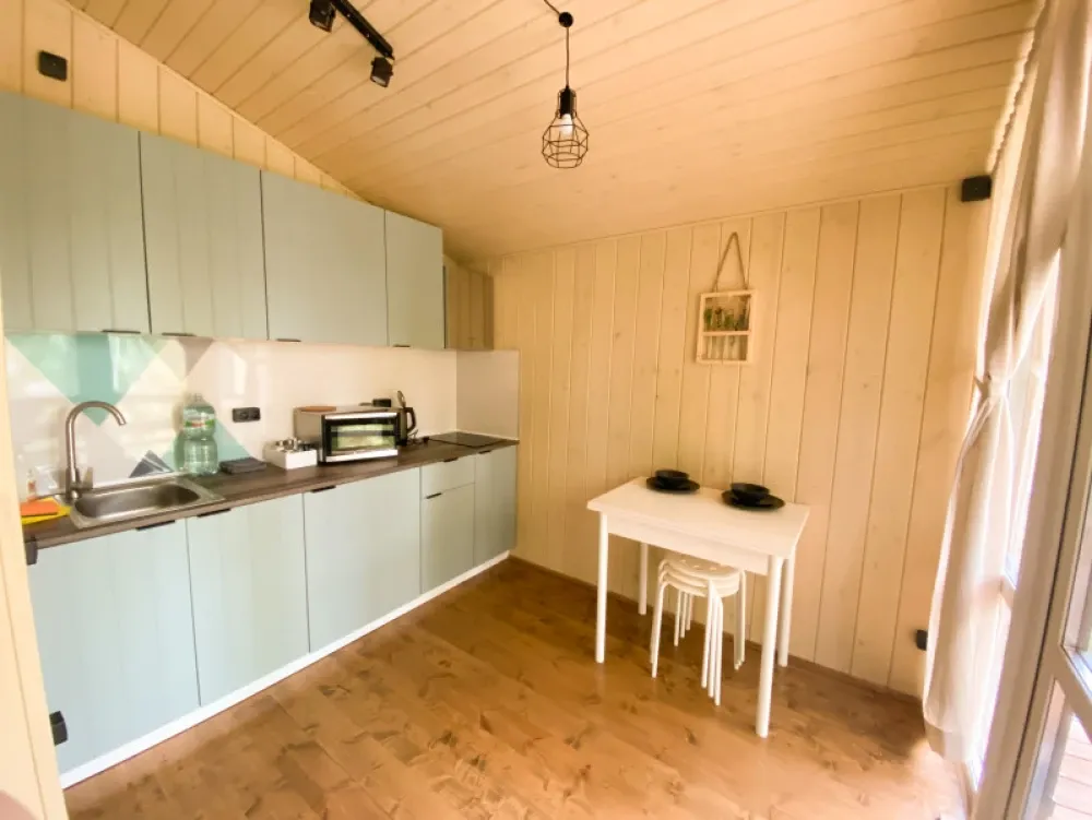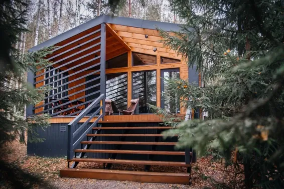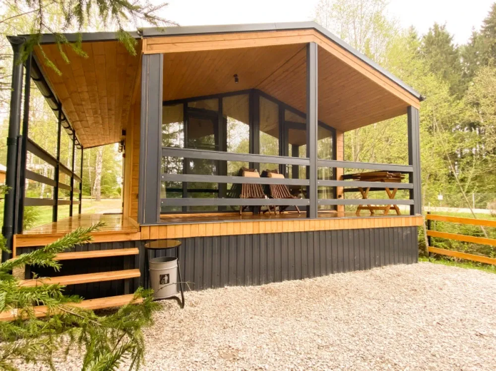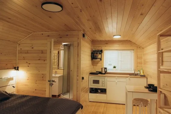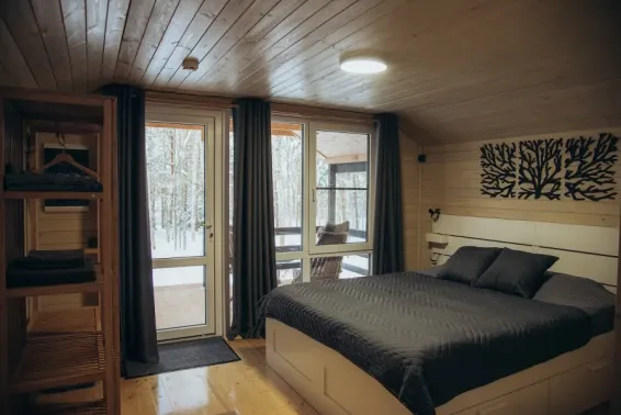 Для размещения гостям предлагаются уютные гостевые домики разной конфигурации, в том числе с панорамными окнами, просторной террасой, гостиной-студией, собственной зоной для барбекю. Каждый домик оборудован ванной комнатой с душевой кабиной. Отопление – электрический конвектор с памятью режимов настроек.