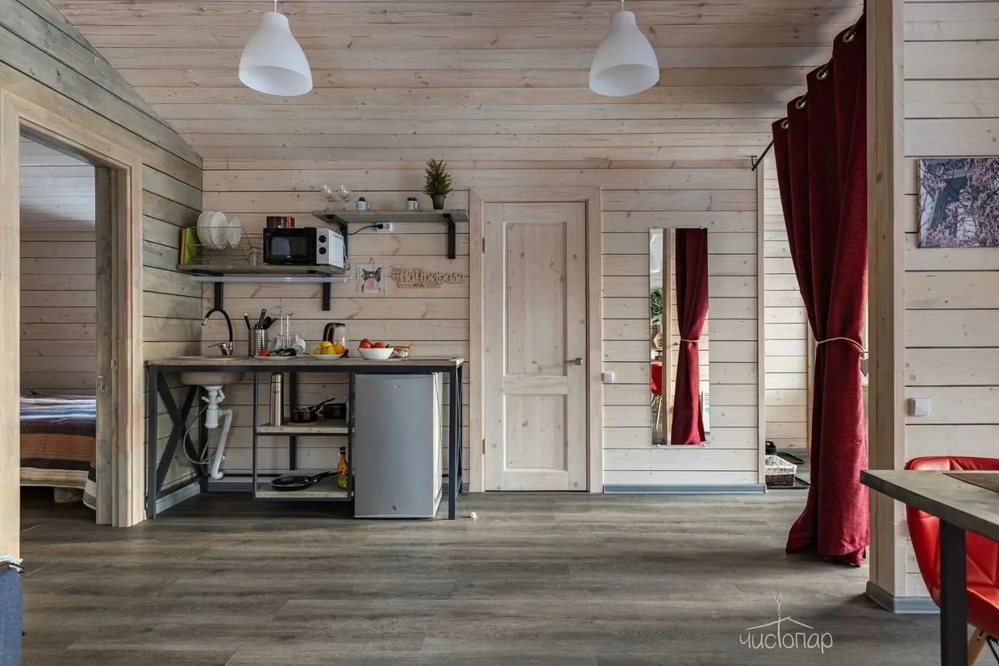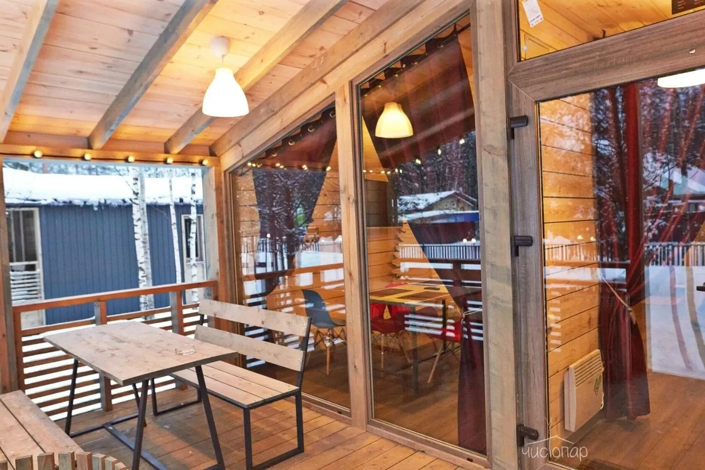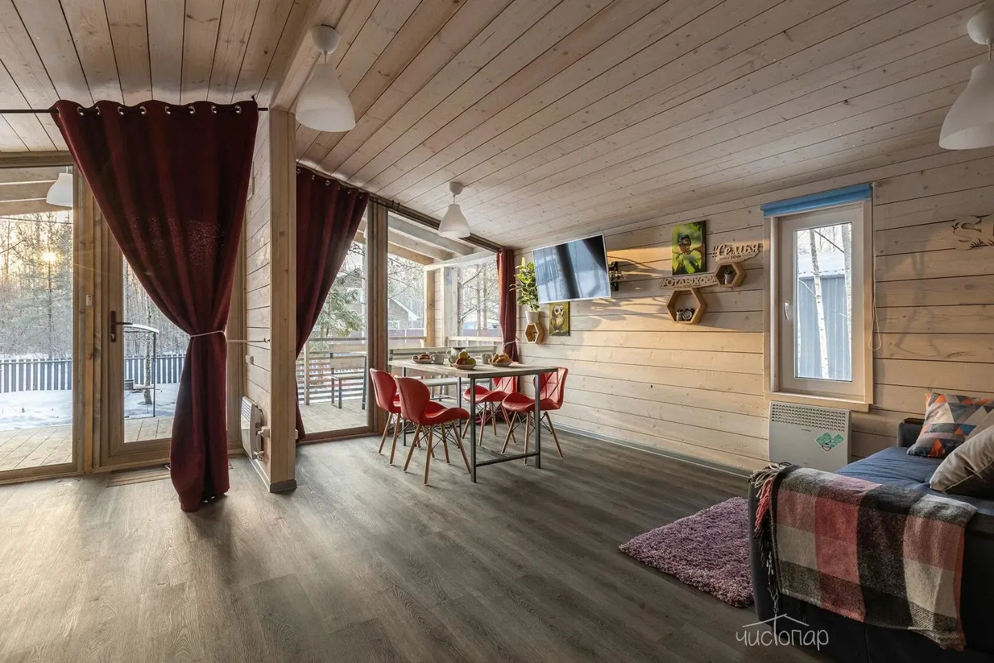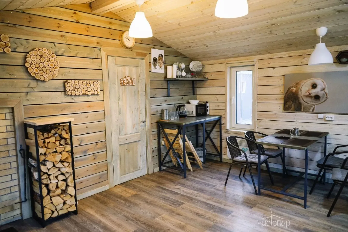 В банном доме есть кухонная зона с кулером, микроволновой печью, чайником и посудой, гостиная зона с панорамными окнами, столом, диваном и телевизором. Совмещенный санузел. Крытая терраса с уличной мебелью.