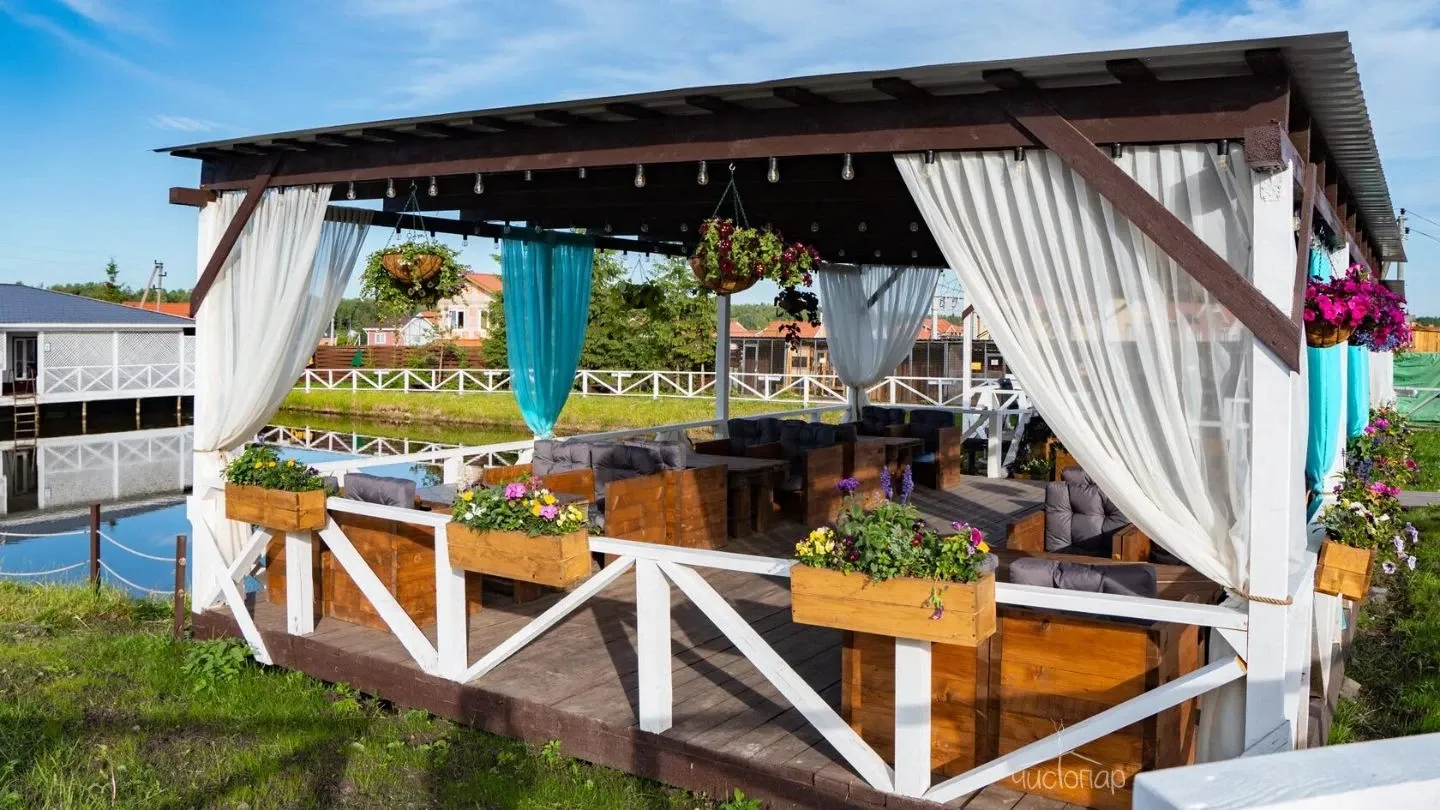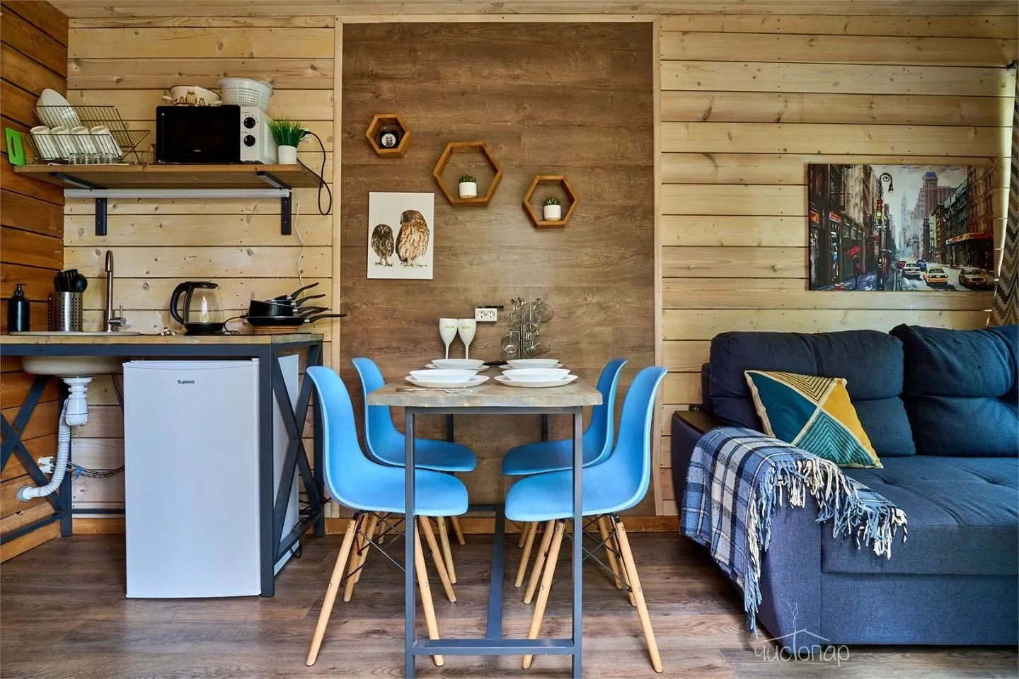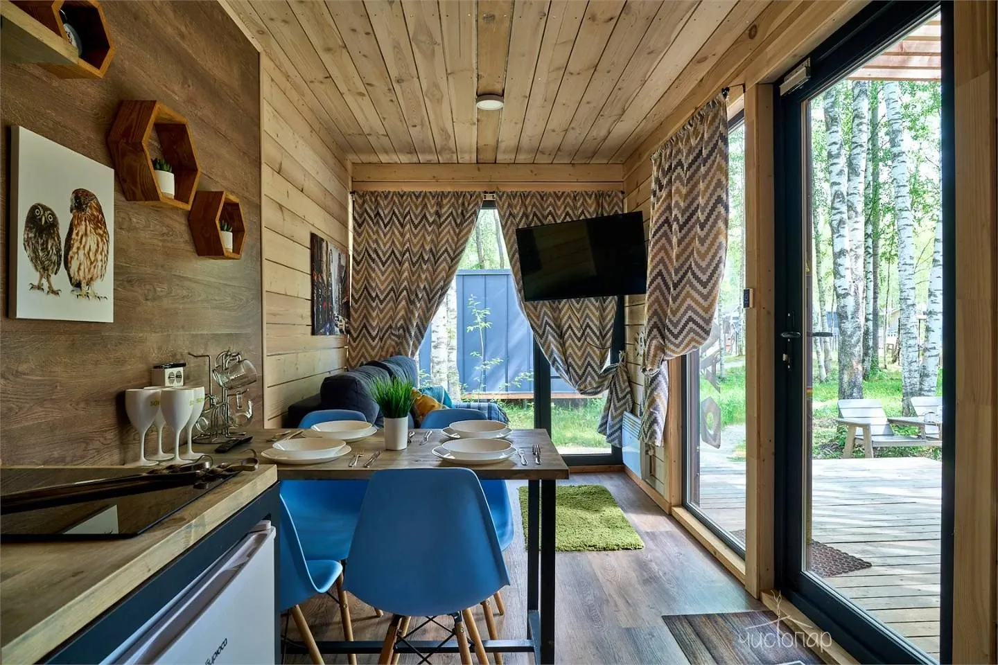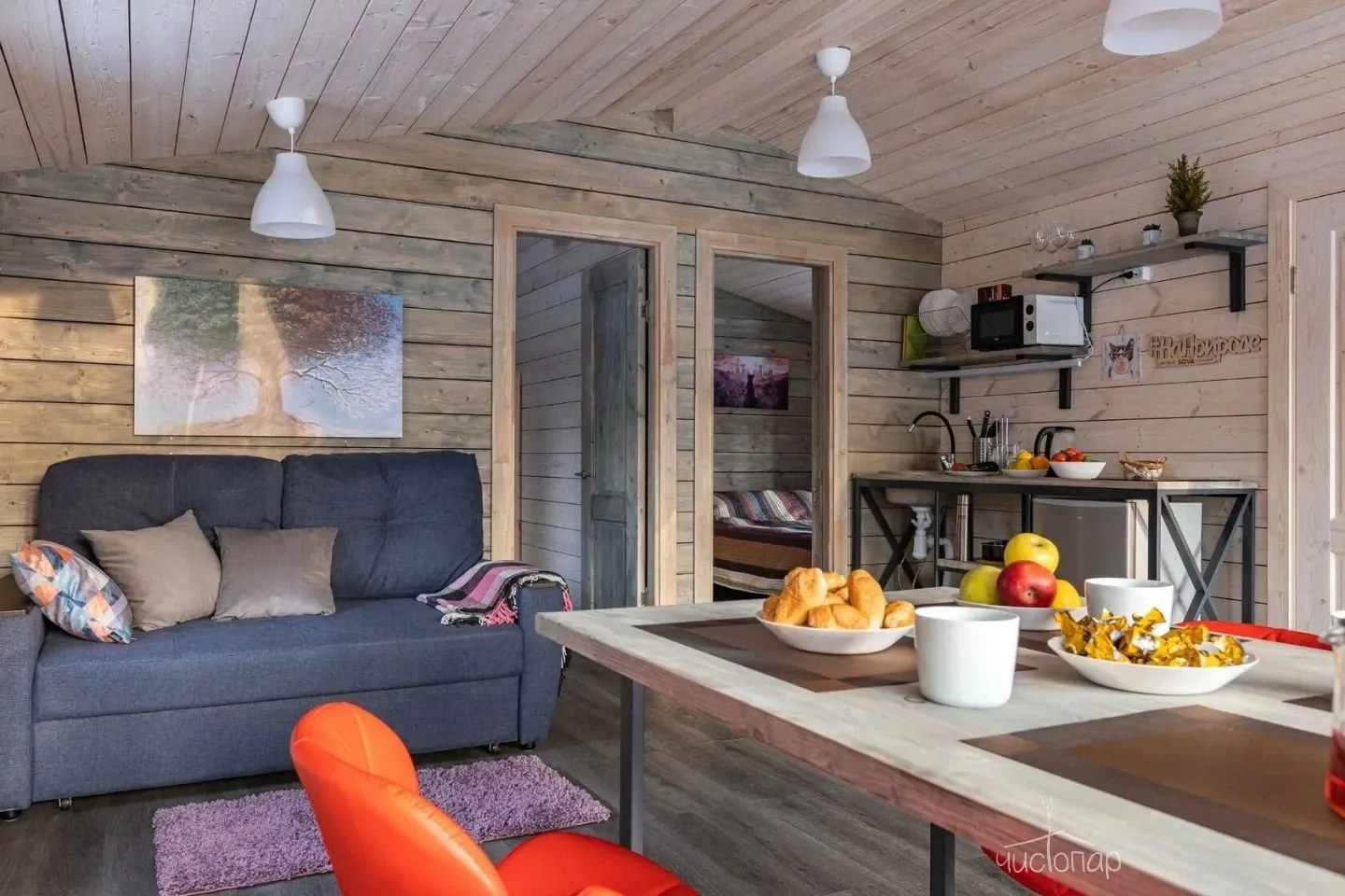 В банном доме есть кухонная зона с кулером, микроволновой печью, чайником и посудой, гостиная зона с панорамными окнами, столом, диваном и телевизором. Совмещенный санузел. Крытая терраса с уличной мебелью.