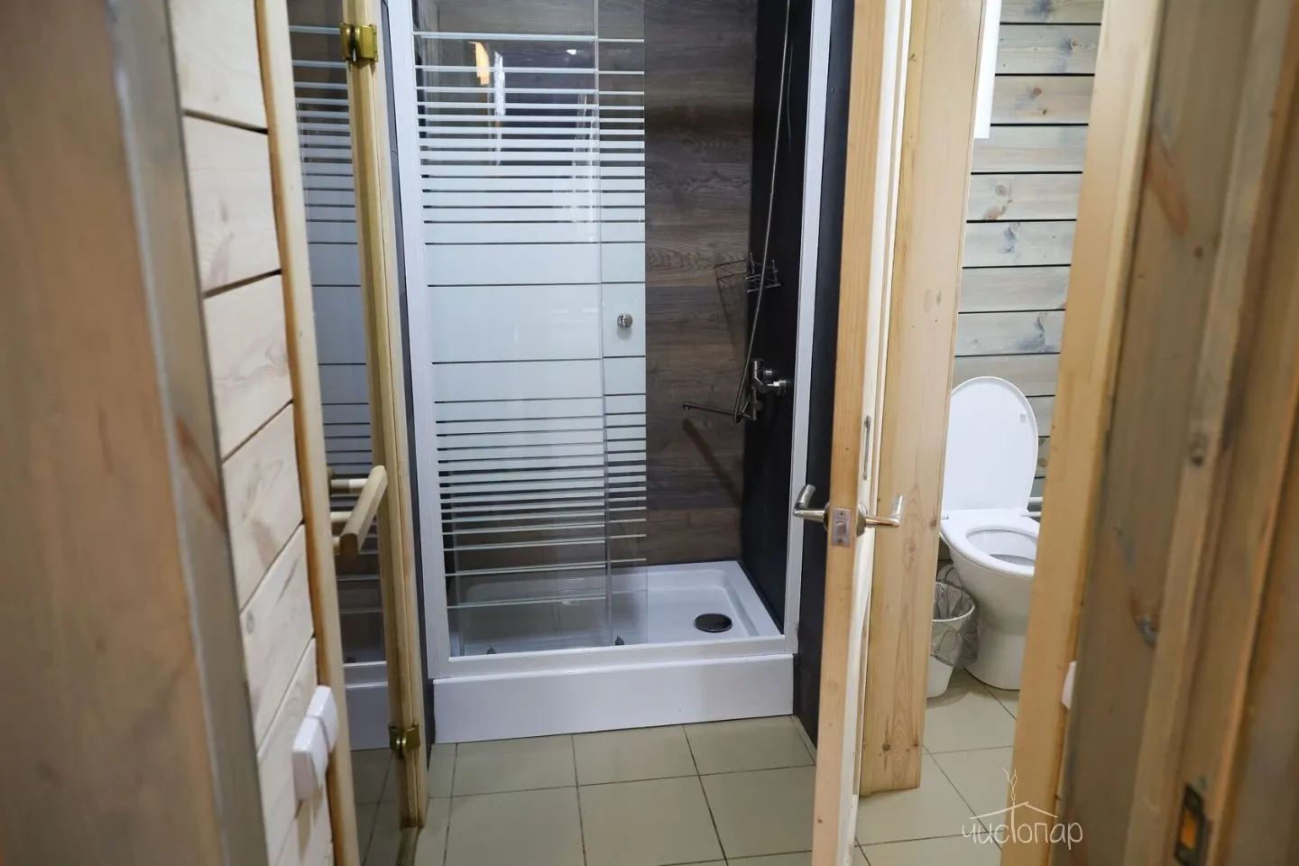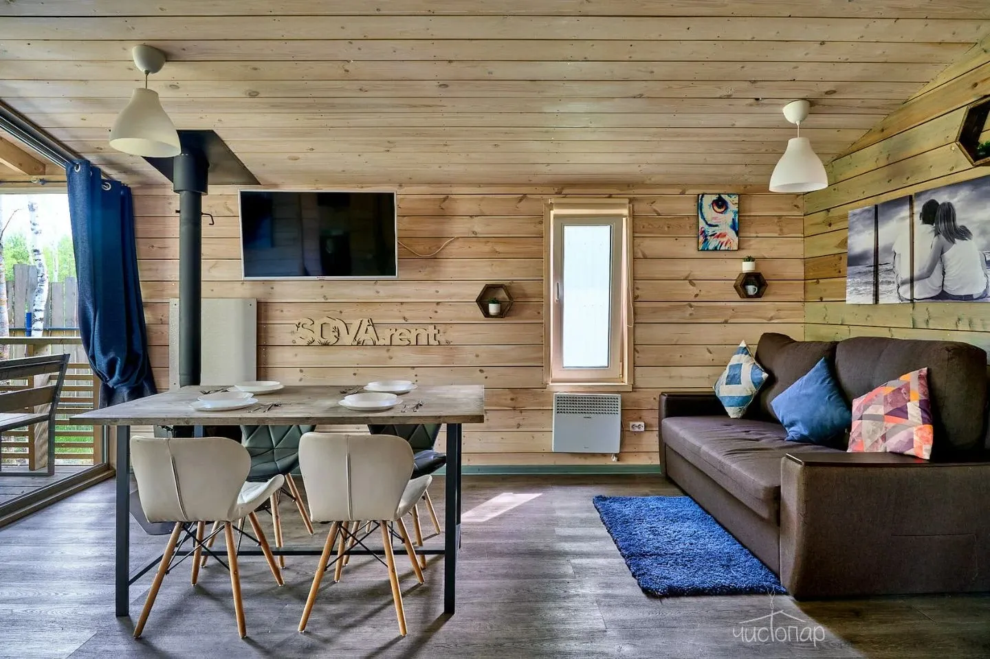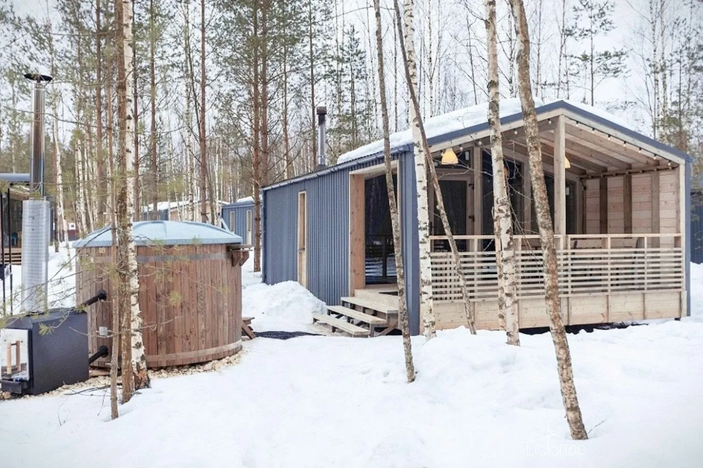 Гостей ждут коттеджи «Смарт» с панорамными окнами, баня на дровах, банный чан с подогревом для водных процедур под открытым небом, фотозоны, детская площадка и зона отдыха у костра. В каждом доме имеются отдельная спальня и удобный диван-кровать. Панорамное остекление во всю стену позволит любоваться красивым видом, при этом находясь в тепле и комфорте.