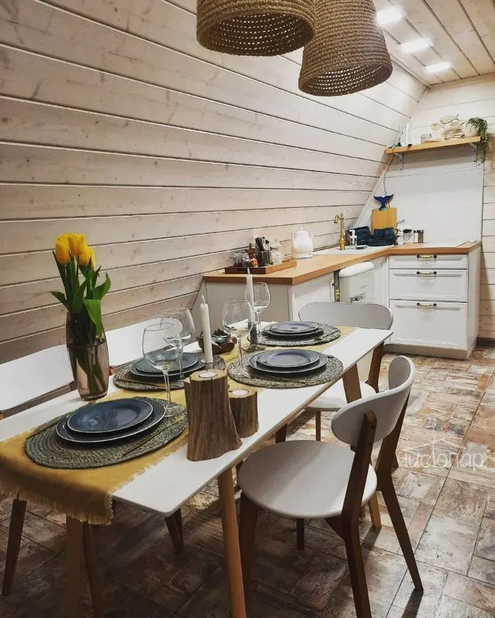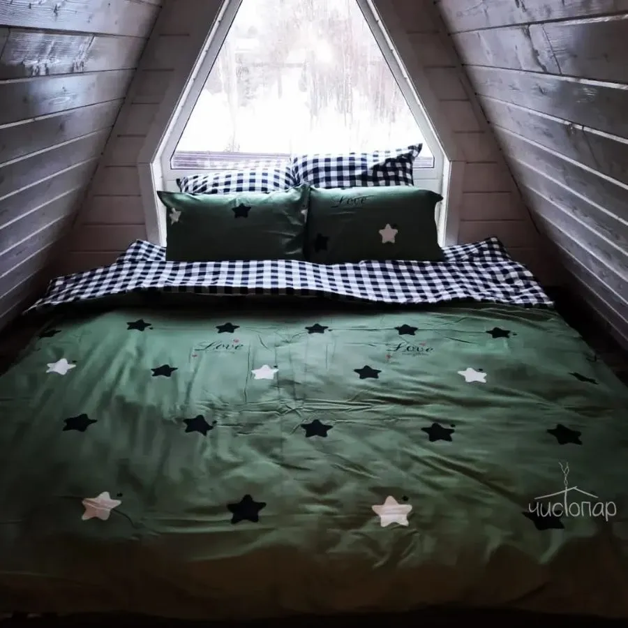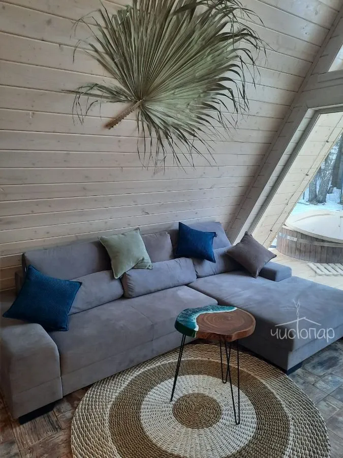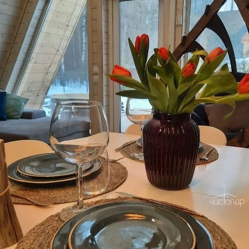В доме есть все необходимое для комфортного отдыха: оборудованная кухня, ванная комната с панорамным окном, ортопедический матрас в спальной зоне на втором этаже, раскладной двуспальный диван в гостиной, настольные игры, виниловый проигрыватель и многое другое.