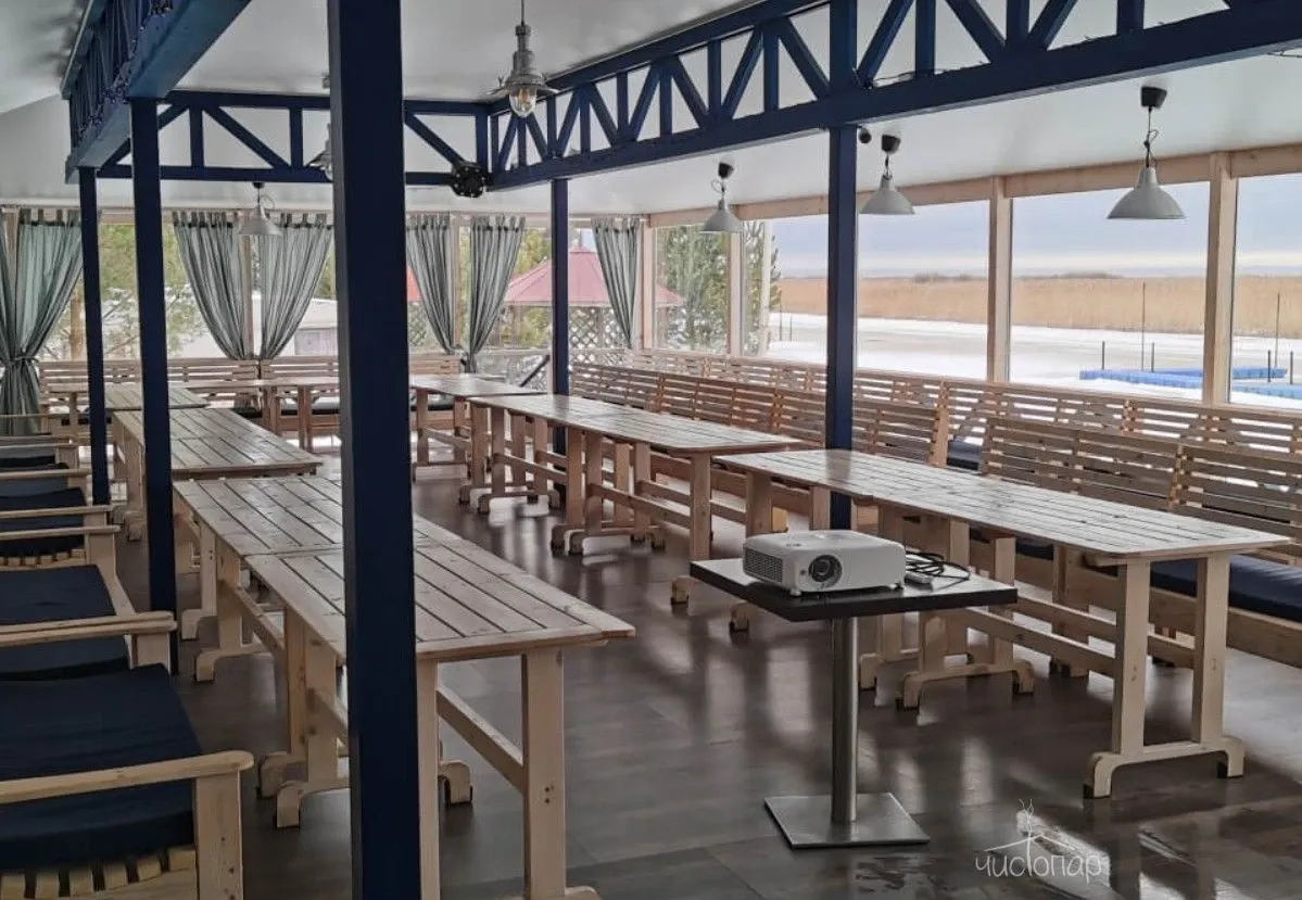 Уютные апартаменты, панорамное кафе с красивым камином, детская площадка, причал.
