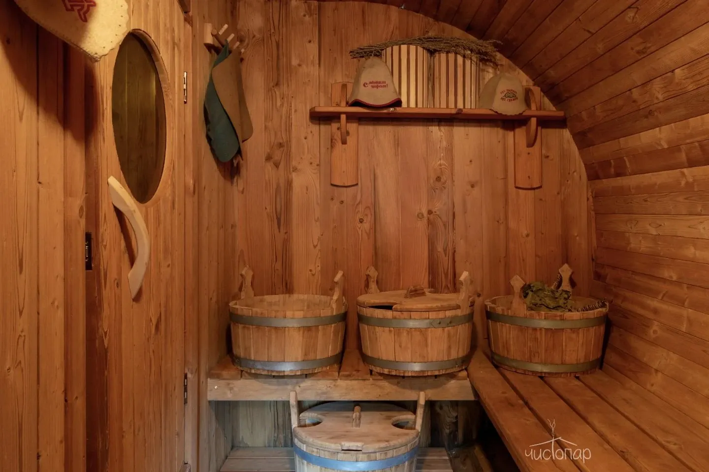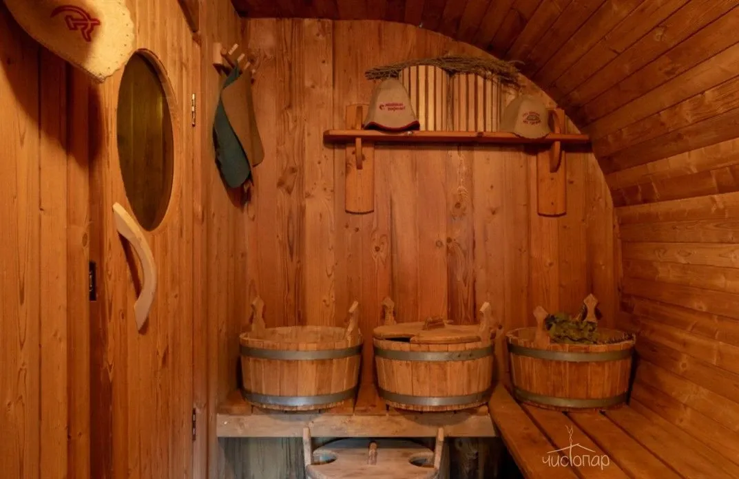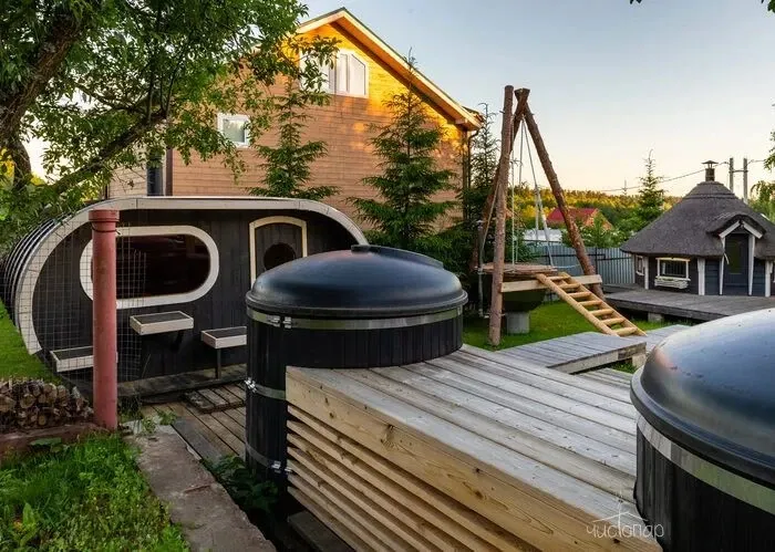 На территории имеется: банный комплекс: баня на дровах, купель с горячей и холодной водой, банный чан.