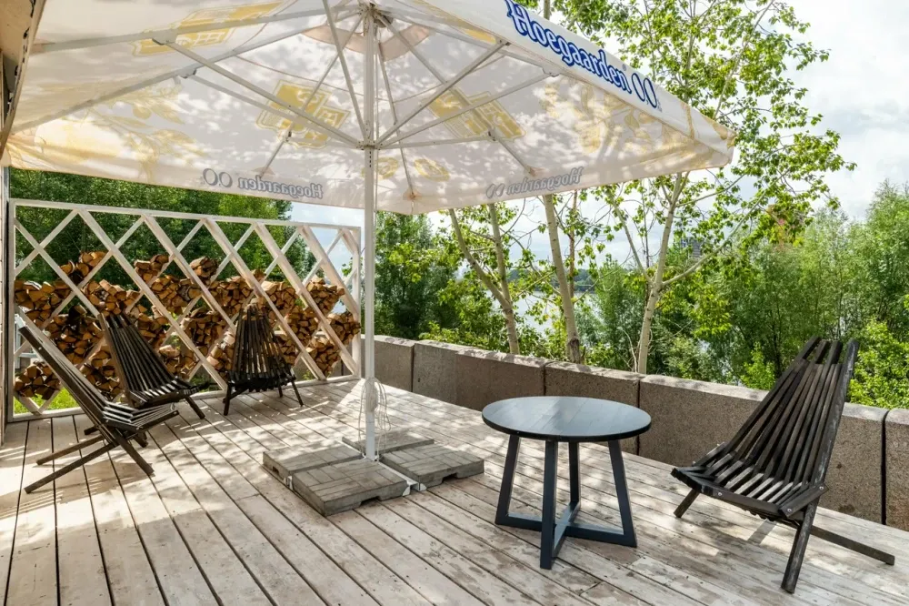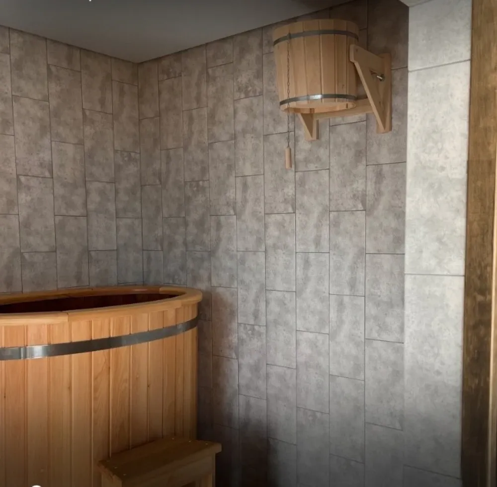 В бане есть все удобства: теплый пол, сан. узел с горячей водой, душ, купели, терраса и восхитительный вид на Обь.