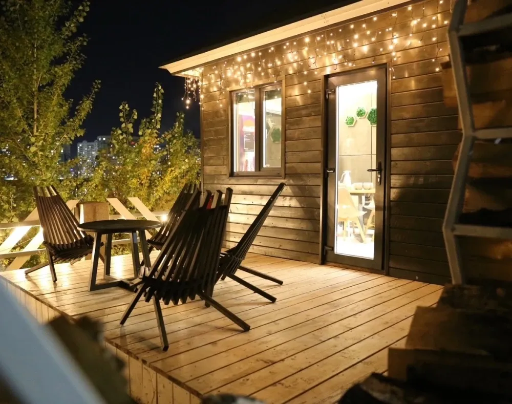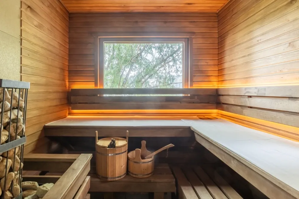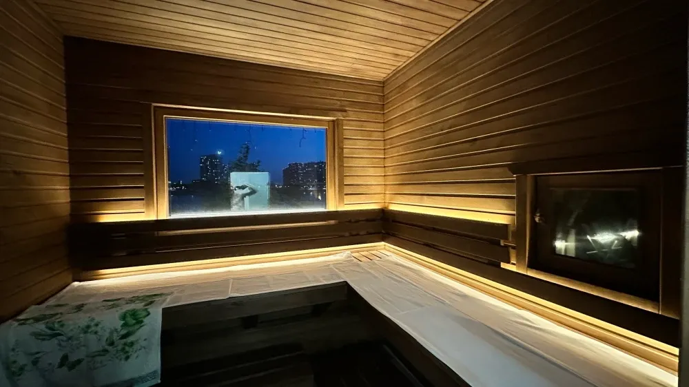 Баня ПремиумГлавное преимущество Бани Премиум - это особая печь, дарящая мягкий мелкодисперсный пар. Прекрасная атмосфера, великолепный пар, веники для парения и травы, приветственный чай с баранками и мёдом — сделают отдых прекрасным. Три вида банных камней. Шикарнейшая чугунная печь. Форточка в парной для подачи свежего воздуха и панорамный вид.