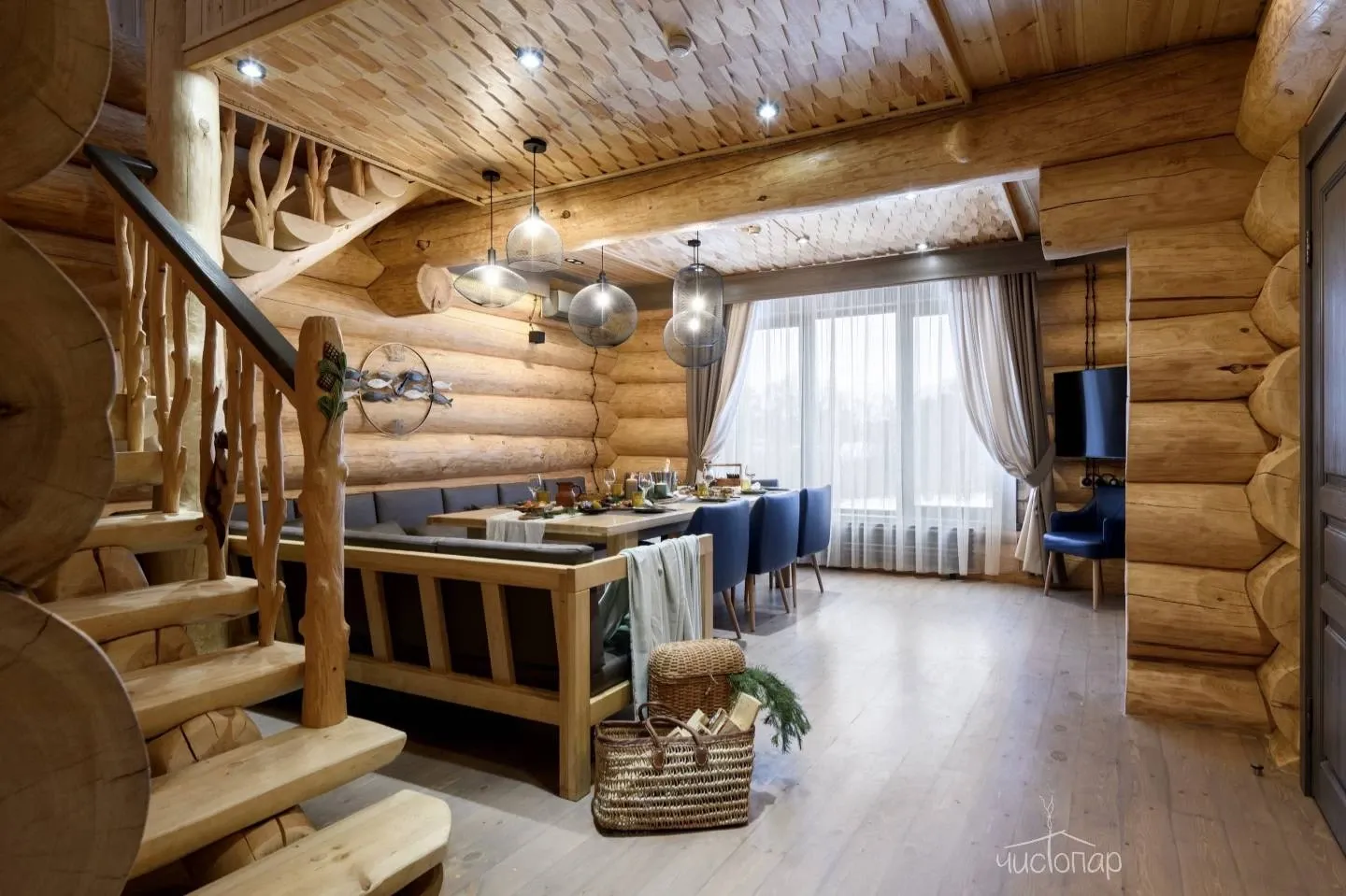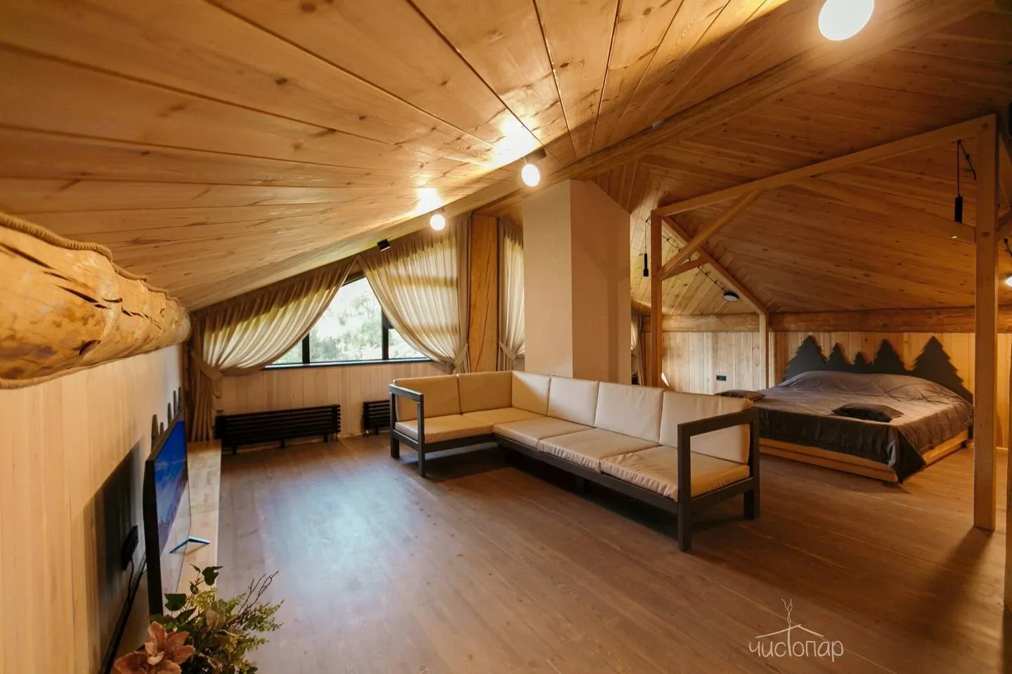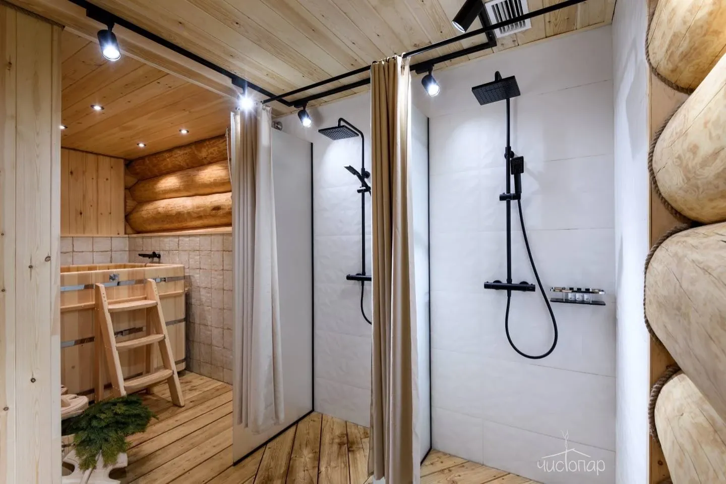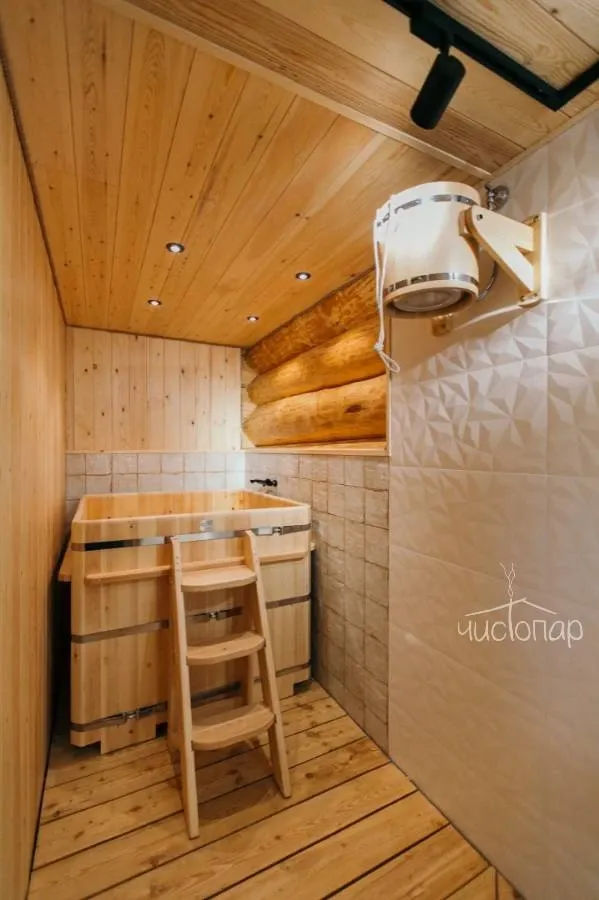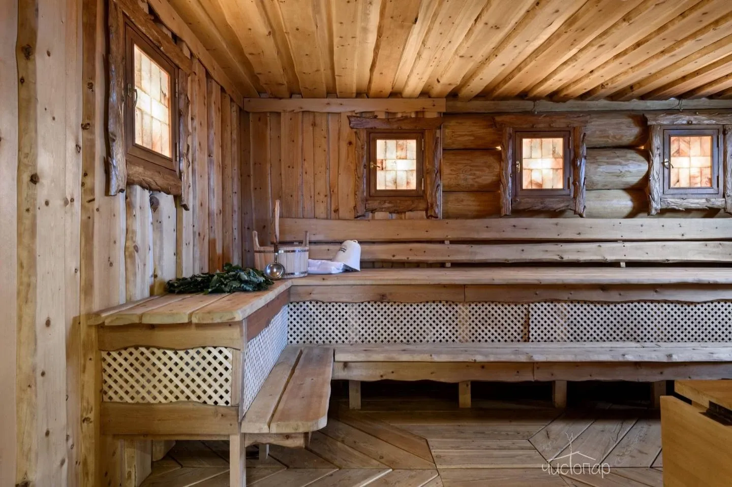 На первом этаже бани «Горы» расположены парная, общая комната, душевая и бассейн. На втором: две спальни, где созданы все условия для великолепного отдыха, а также бильярд. Прекрасное дополнение — купель на территории бани. Купель топится дровами и температуру воды можно регулировать по вашему желанию. В зоне отдыха предусмотрены Wi-Fi, плазменная панель и современная аудиоаппаратура. Особенность бани – большой бассейн со встроенной системой гидромассажа и чистой прохладной водой. Традиционная парная с натуральными камнями и насыщенным паром, помещение которой выполнено полностью в уникальном дизайнерском стиле из массива кедра, позволит вам максимально провести время с пользой для вашего тела. Также особенностью парной является полное отсутствие химических пропиток. Дерево «дышит» а значит, создается максимально оздоровительный эффект.