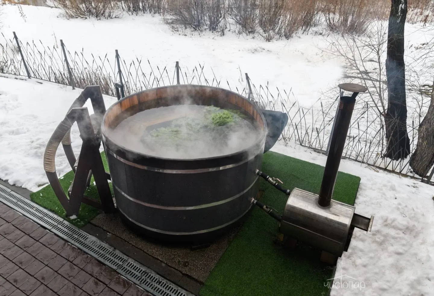 На первом этаже бани, расположены парилка, общая комната и душевая. На втором – две спальни и комната отдыха (здесь же можно сразиться в настольный футбол). Помещение бани оснащено современной аудиоаппаратурой и большой плазменной панелью. Две террасы с шезлонгами, вид на реку и Бугринский мост, уникальная кухня, караоке и ТВ, бесплатный wifi и настольный футбол станут приятным дополнением для вашего отдыха. Русская печь с закрытой каменкой – гордость бани «Тайга», она дает насыщенный пар, который дарит силы и избавляет от мышечного напряжения. Печь отделана талькомагнезитом (одна из главных особенностей — его способность при нагревании излучать инфракрасное тепло, сходное во многом с солнечным). Вот почему люди воспринимают тепло, как мягкое, комфортное, расслабляющее. Существует мнение, что такие банные процедуры не только приятны, но и чрезвычайно полезны, поскольку прогревают мышцы и суставы, стимулируют кровоток, способствуют очищению сосудов и выводу шлаков и токсинов, улучшают тонус кожи, повышают иммунитет. Наличие купели, на территории бани «Тайга», делает ее еще более уникальной. Купель топится дровами и температуру воды можно регулировать по вашему желанию.