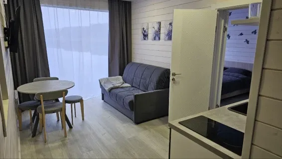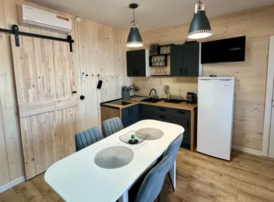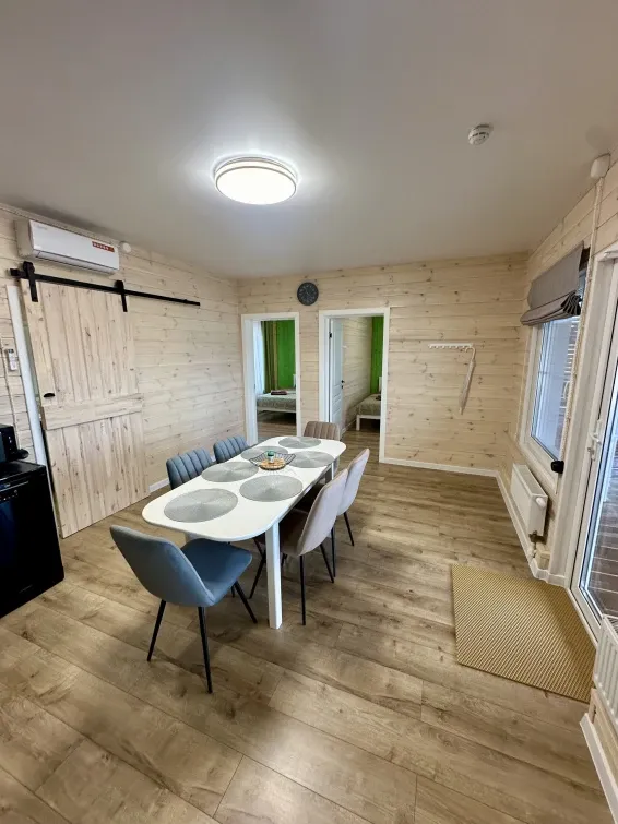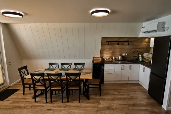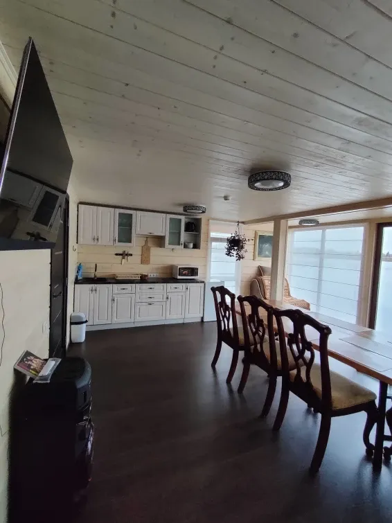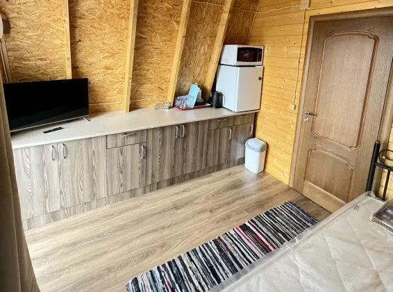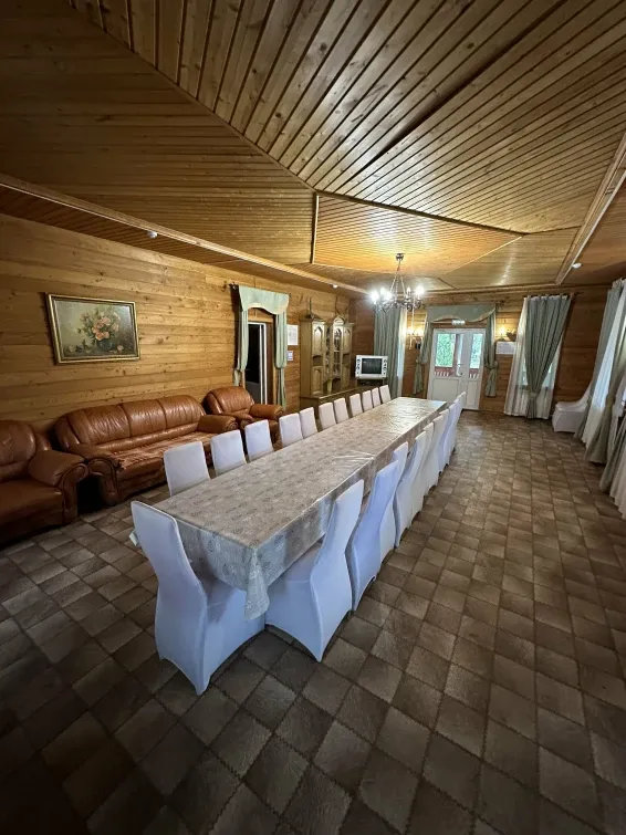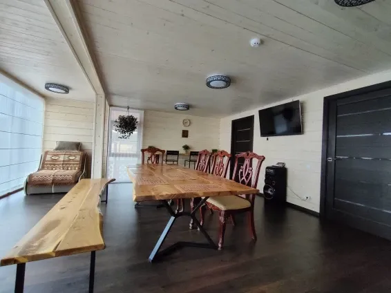 - зал с зоной отдыха: 2 -х местный диван (с возможностью размещения гостей на ночь) ; телевизор; колонка Алиса; вайфай. Обеденный стол на 8 человек