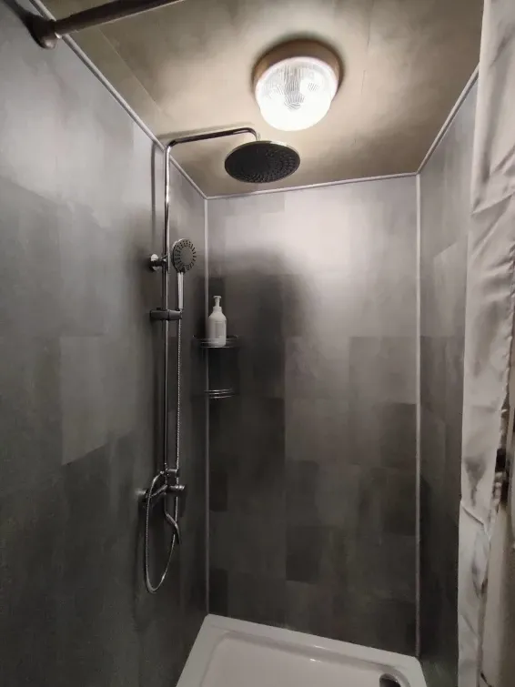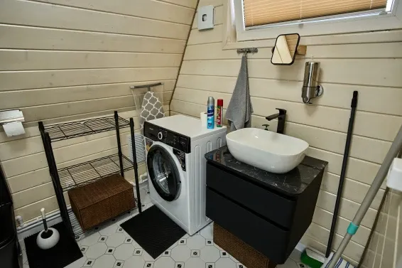 - Ванная комната: душевая кабина, туалет, стиральная машина, фен.