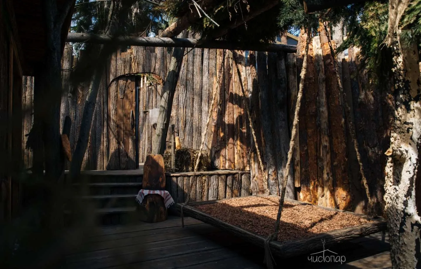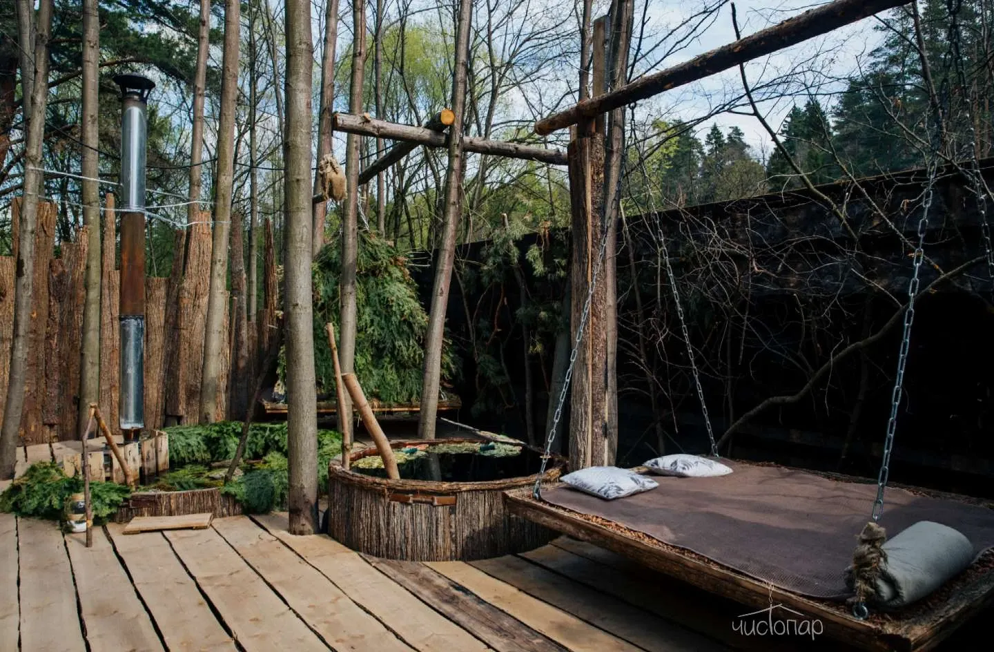 Возрождение. Укачивание под медитативную музыку. Вас укачивают на свежем воздухе под медитативную музыку на качелях, которые застелены ароматной цедрой кедровой шишки. Пребывая в состоянии банной эйфории, вы обретёте единство тела и духа. И возвратитесь в реальный мир с обновлённой душой, новой энергией и новыми ощущениями