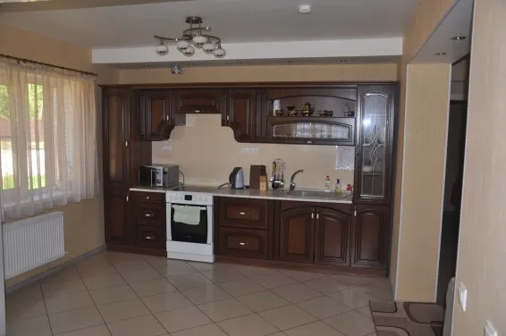 - Просторная кухня-столовая, где вы сможете наслаждаться семейными обедами и дружескими встречами. В этой зоне расположен удобный диван, на котором комфортно разместятся двое, создавая атмосферу уюта и тепла.