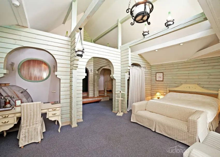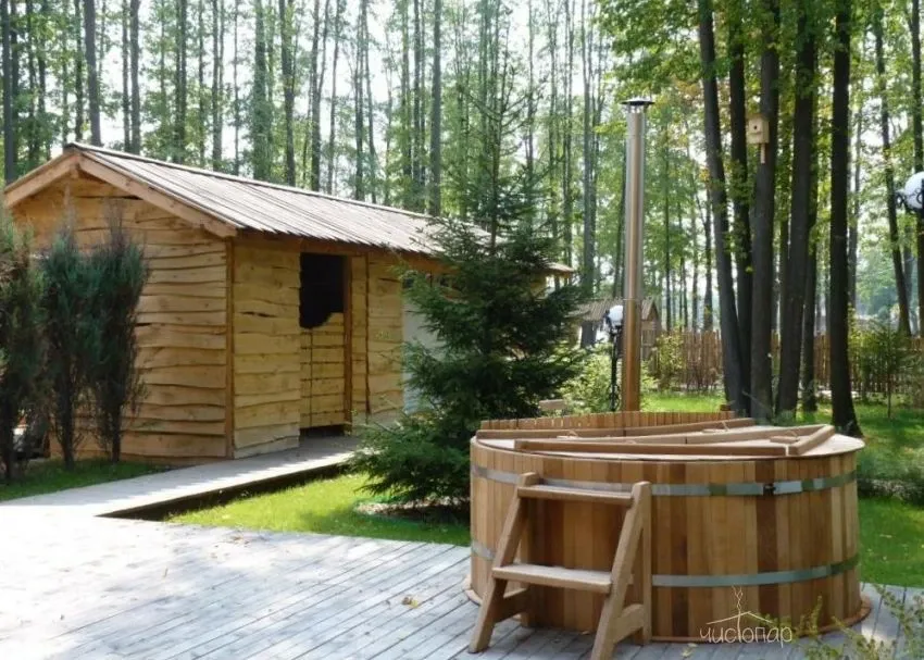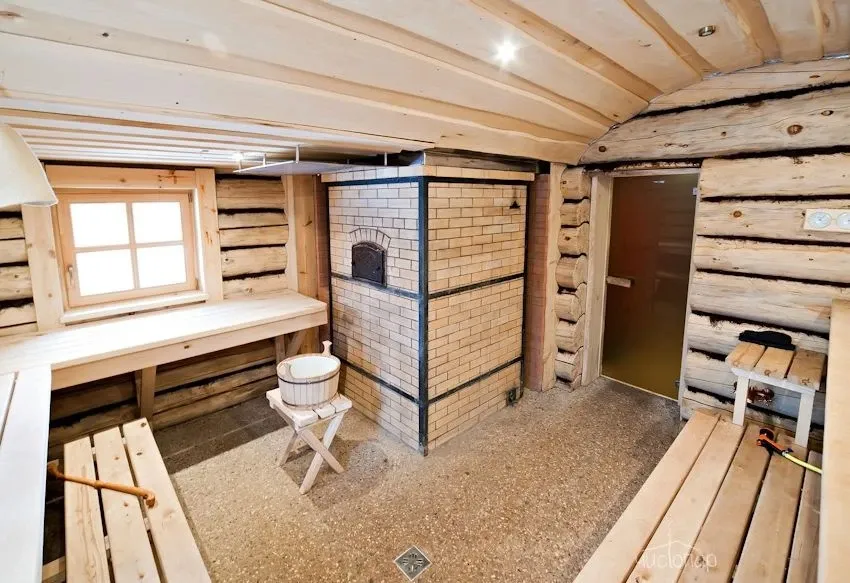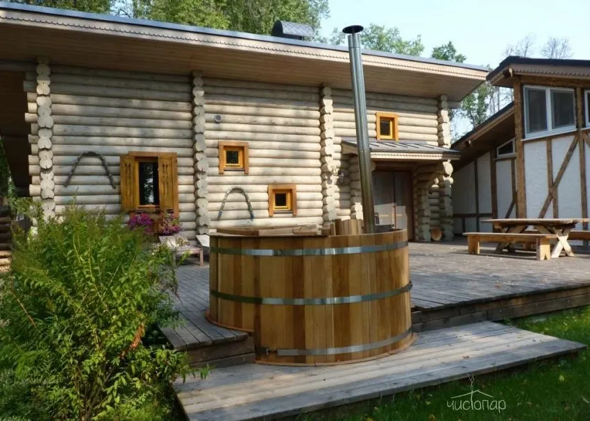 «Карельская» подойдет для небольших компаний — до четырех человек. Она построена из архангельской сосны. Там есть помещение для отдыха, раздевалки, зона для моечных процедур, парилка на дровах и купель на открытой веранде.