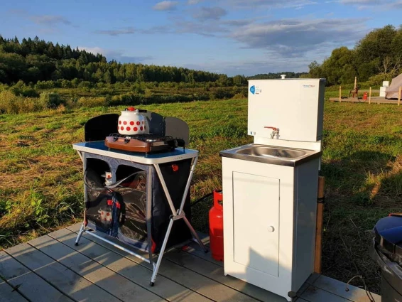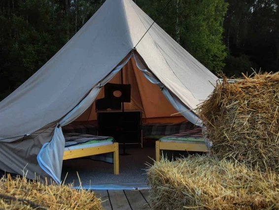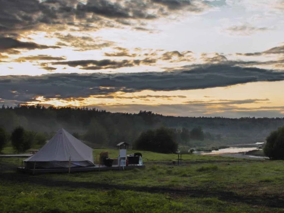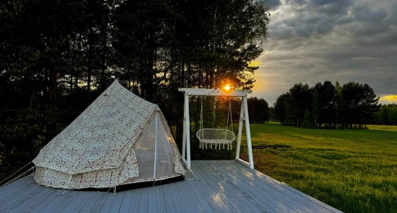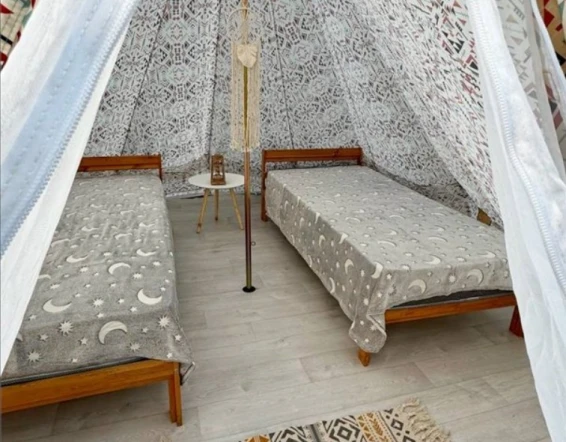 Шатёр «Дыхание леса». Это сочетание комфорта и природы. Рассчитан на отдых вдвоем. Шатер со всеми удобствами: две кровати, чистое и наглаженное постельное белье, санузел с туалетом и душем (водицу нагревает солнышко), электричество, мангал, газовая плитка, набор посуды, уютная беседка, зона с кострищем, качели из пинтереста, деревянный настил и теплые пледики, возможность питаться нашими натуральными фермерскими продуктами.