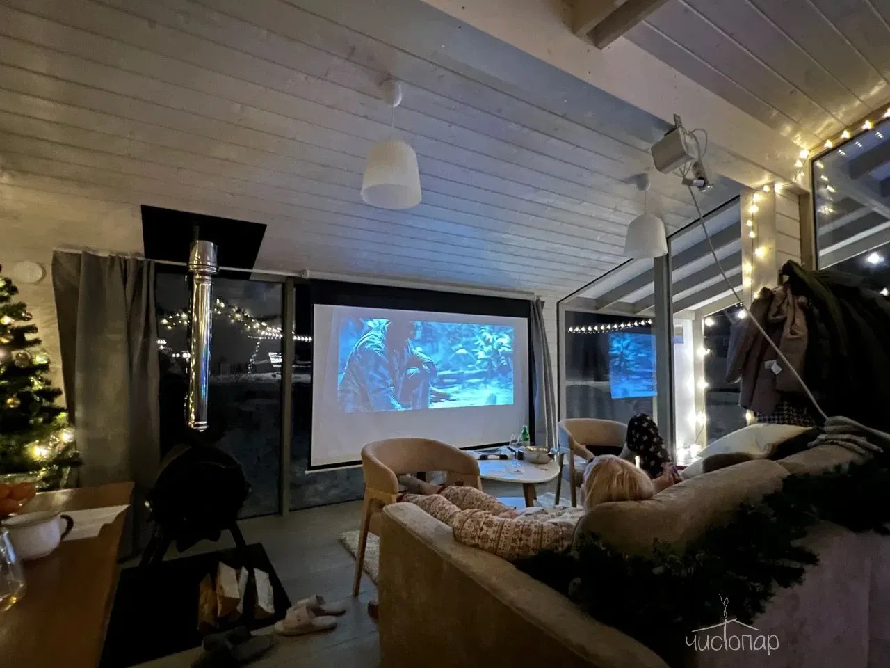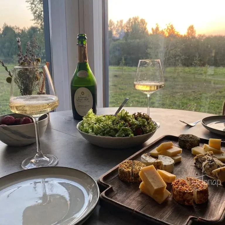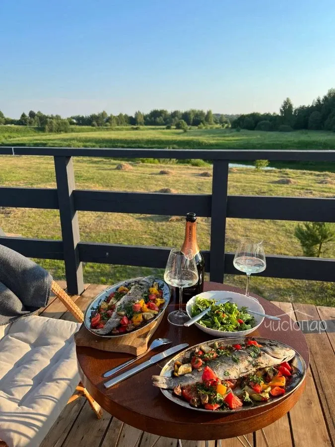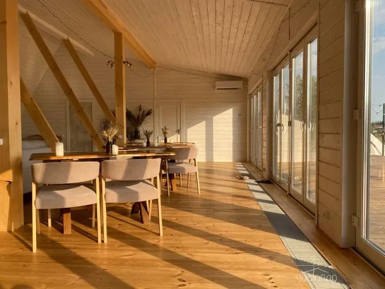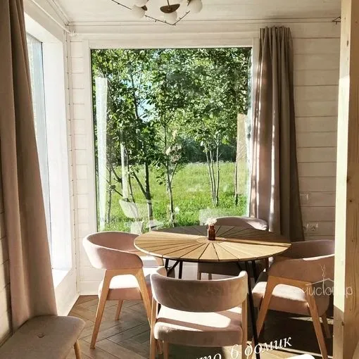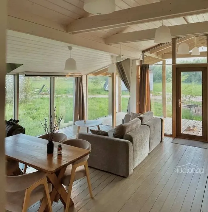 Сквозь большие панорамные окна можно любоваться лесами и полями даже в непогоду, уютно устроившись у камина, с чашкой горячего вкусного чая и за просмотром новинок кино на проекторе.