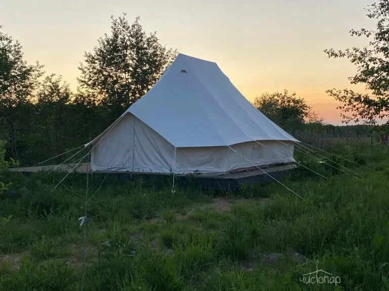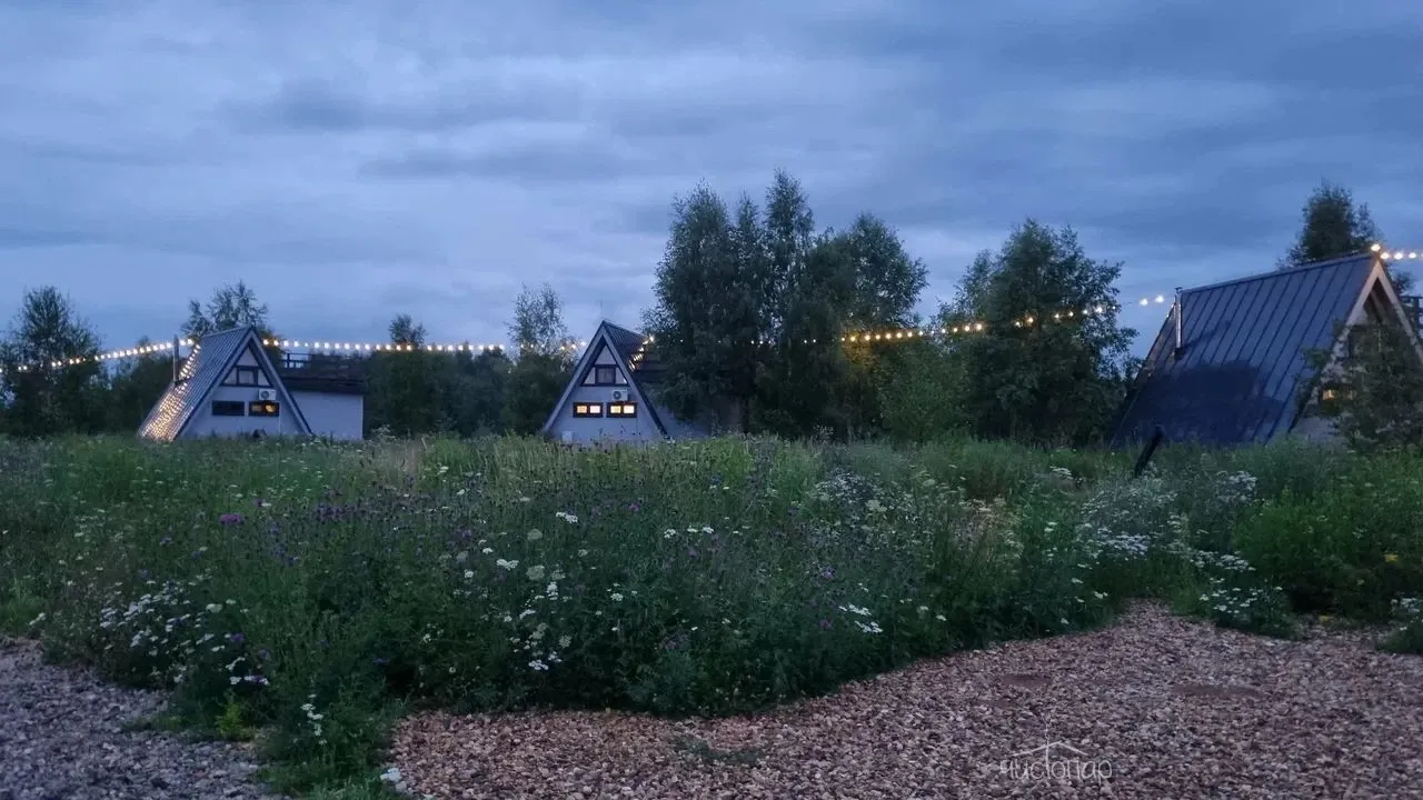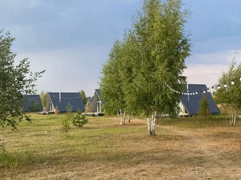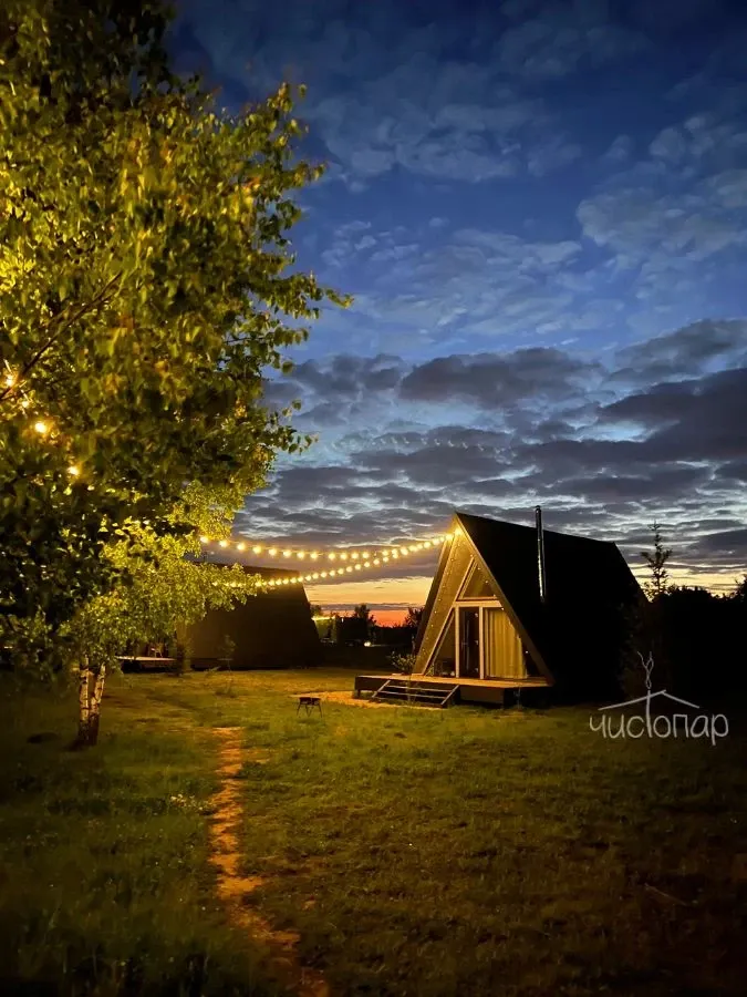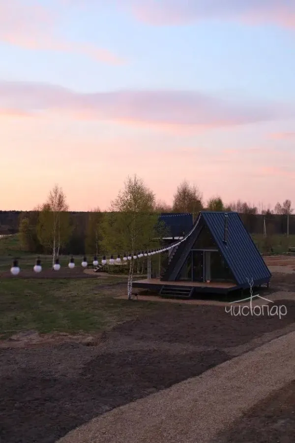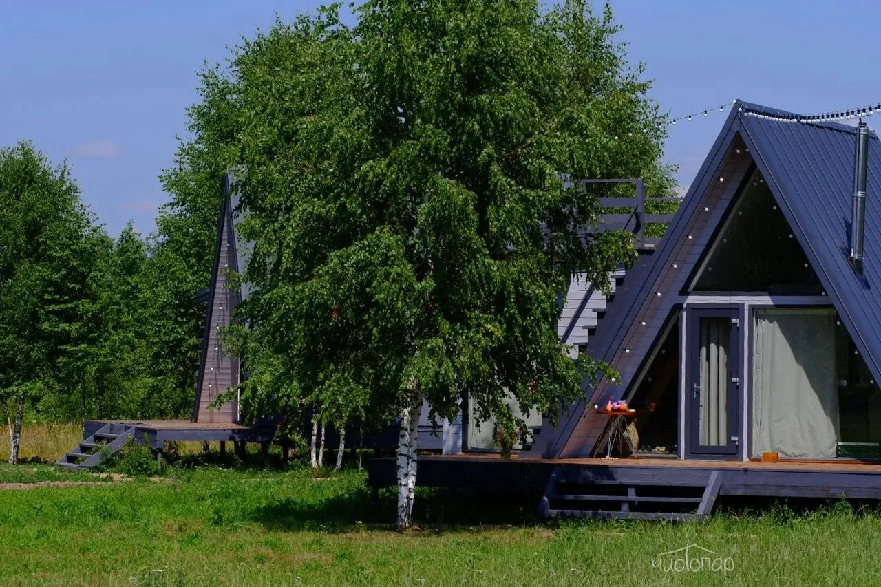 Здесь можно арендовать палатку или атмосферный домик в виде буквы А. Последний оборудован кухней с утварью и техникой, есть туалет с душевой и, конечно же, удобные кровати. Тем, кто любит порелаксировать, например, заняться йогой или почитать, подойдёт терраса.