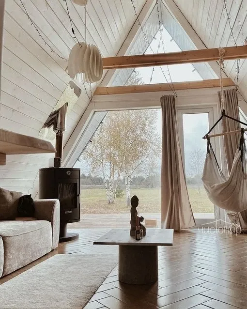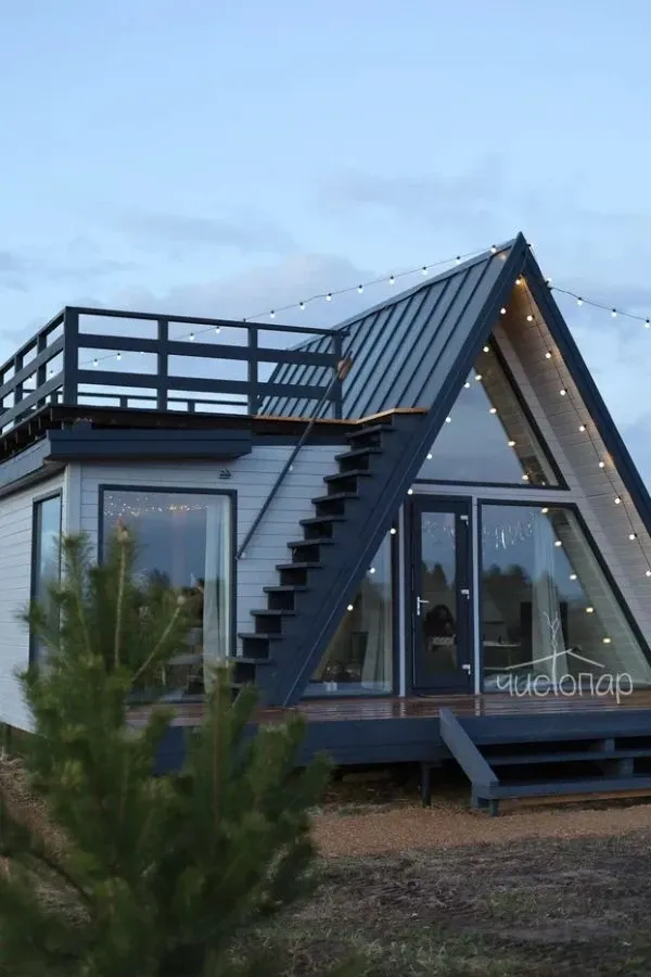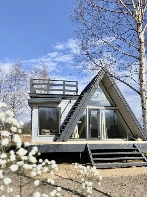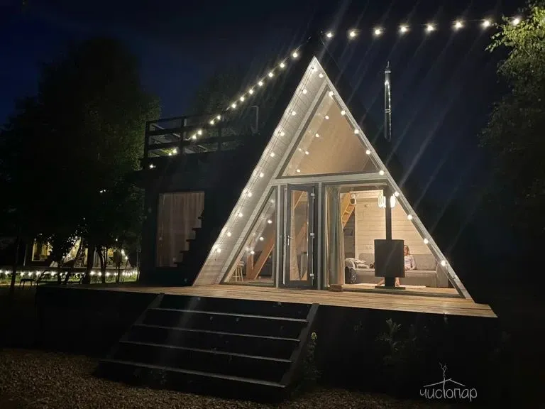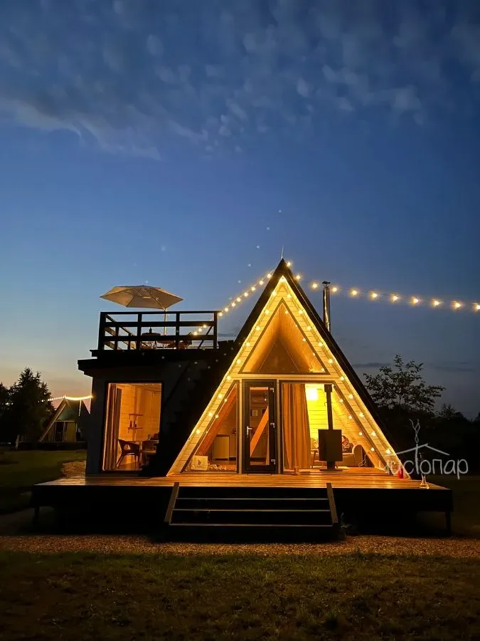 ДОМИК SPECIALУникальный домик Aframe с дополнительной панорамной обеденной зоной, верандой на крыше, 2 диванами и камином.