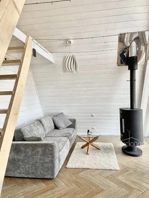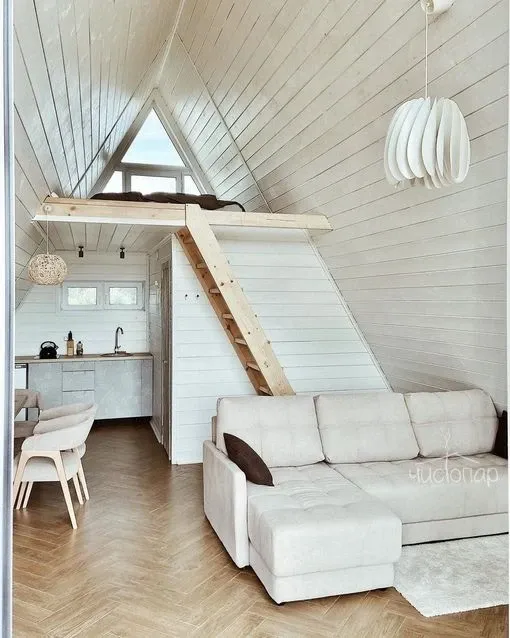 Домик состоит из 2х этажей, объединенных общим пространством, наверху располагается спальня, а внизу гостиная, обеденная зона, 2 дивана - кровати, ванная и кухня.
