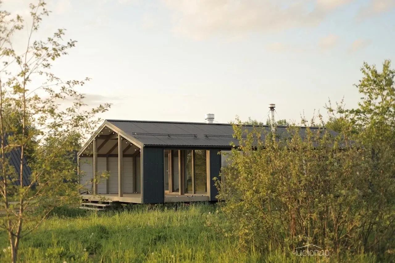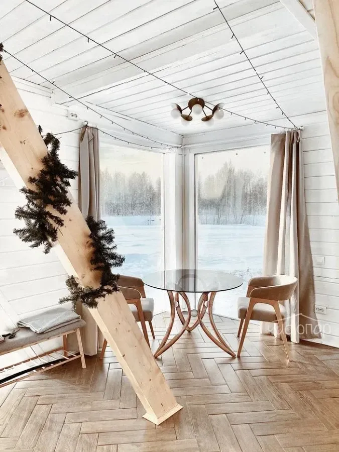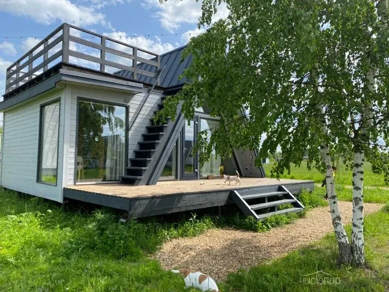 Отличительной особенностью домика является веранда на крыше, откуда открывается восхитительный вид на реку, а также панорамная обеденная зона и дополнительный мягкий уголок.
