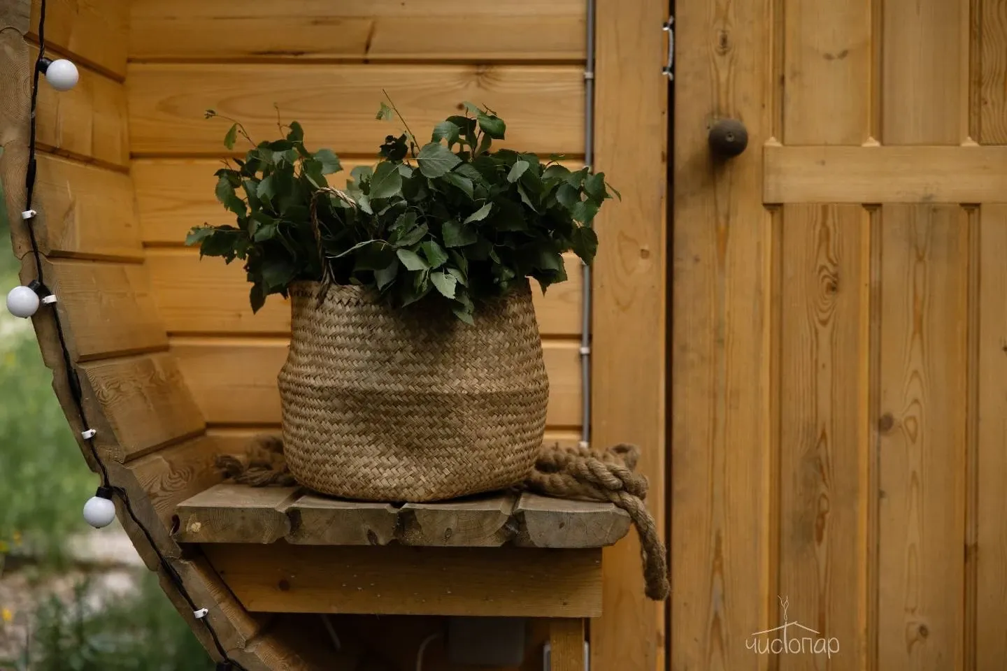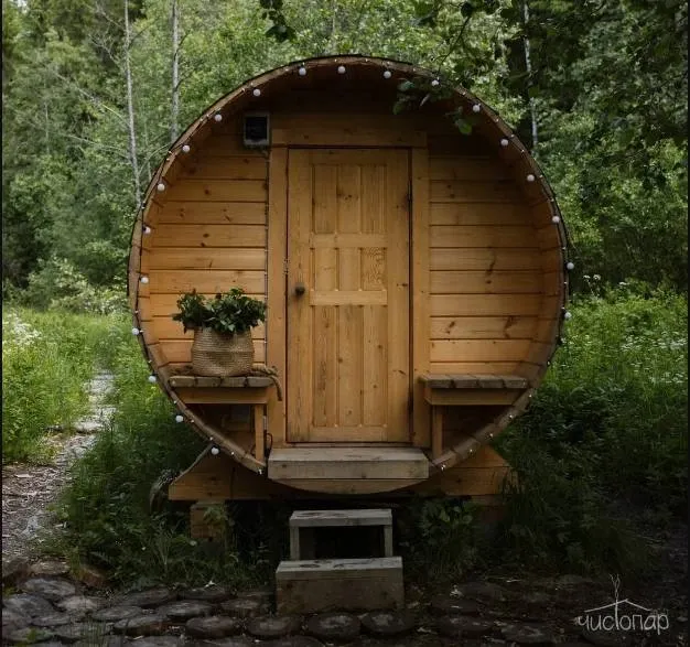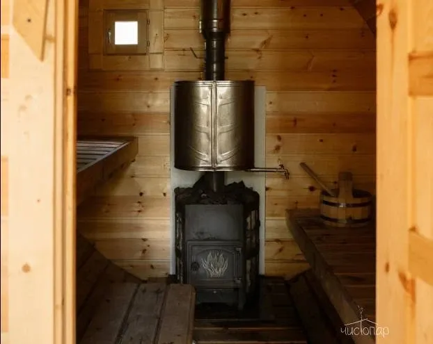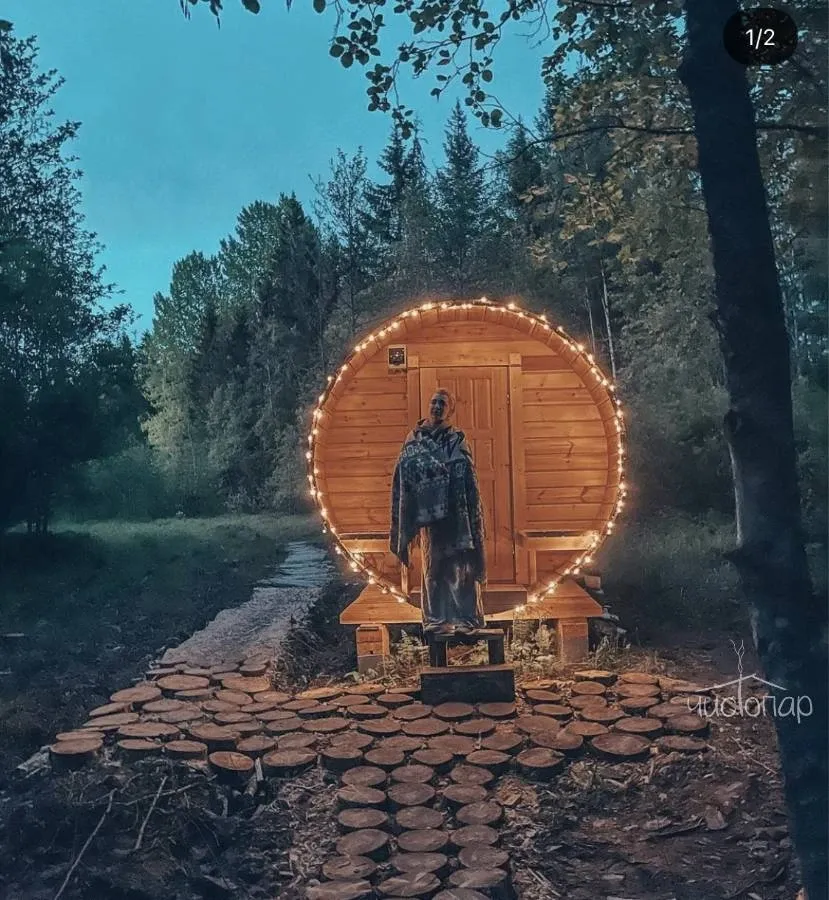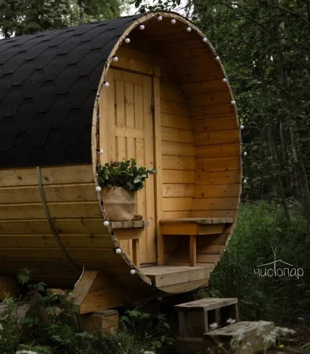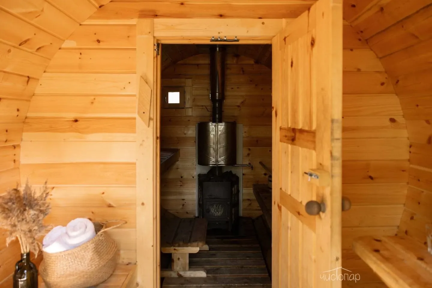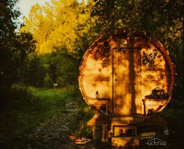 • Баня-бочка на озере. Расположена прямо на берегу, с видом на озеро. Рядом с сауной мостки для захода в воду.