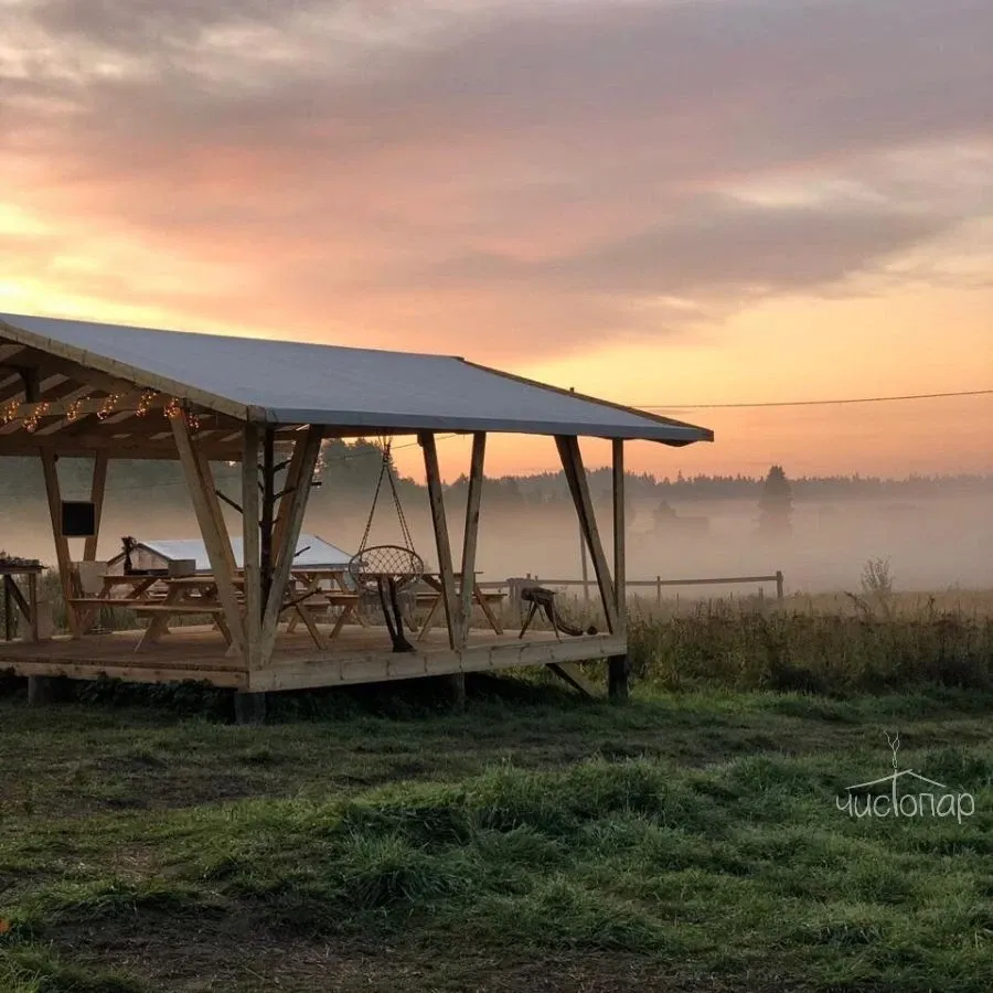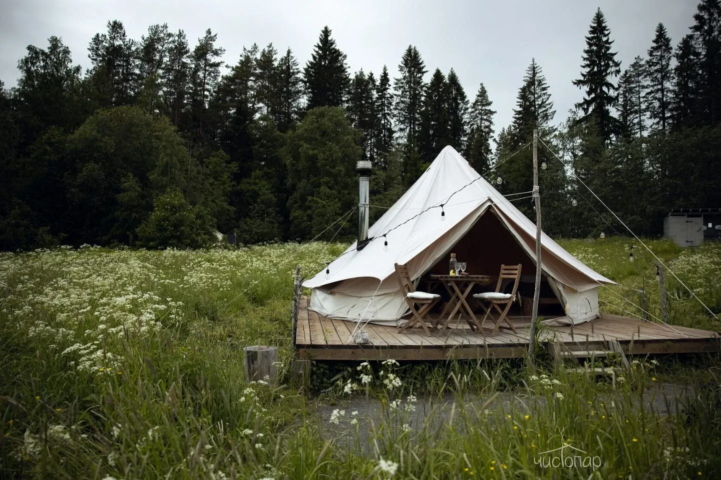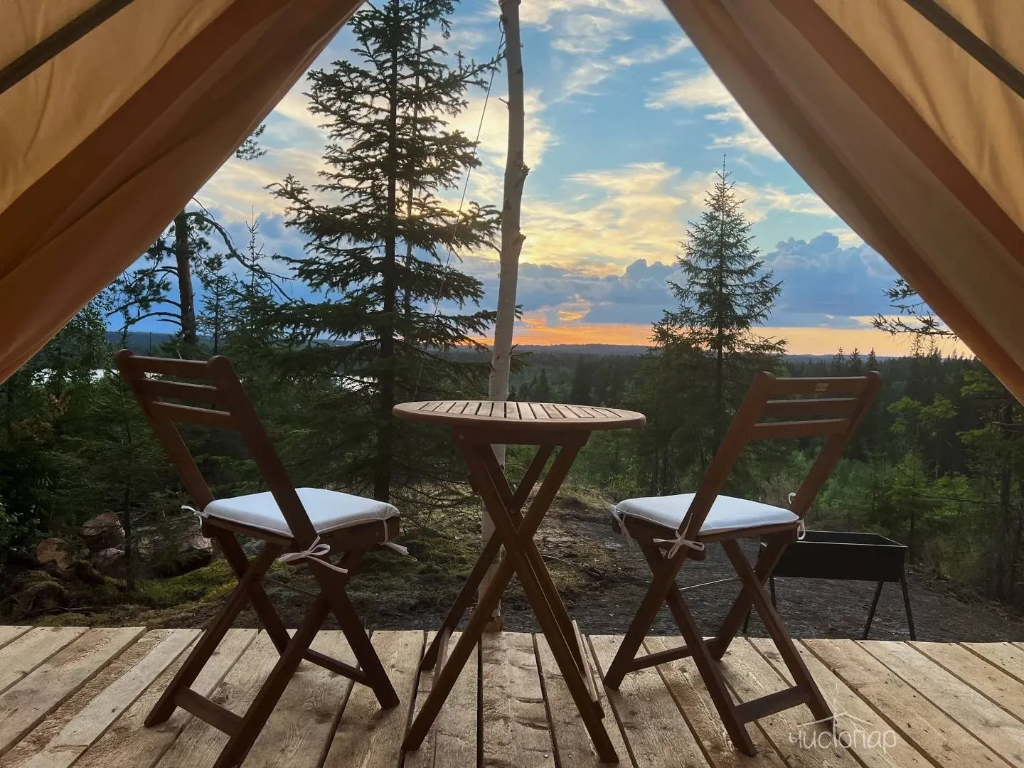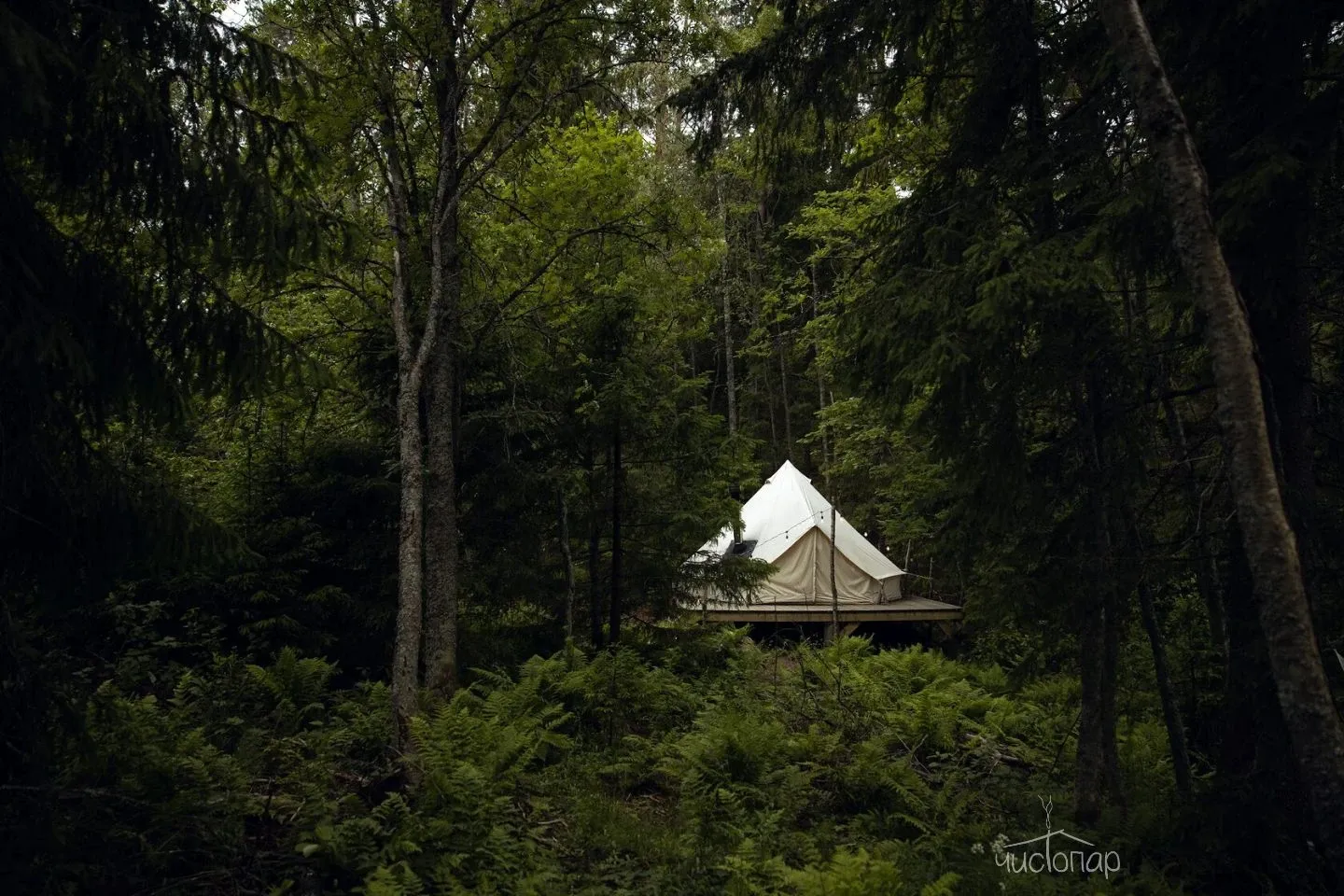 Хюгге Кэмп - это уютный глэмпинг с шатрами на поляне и в лесу, с видом на скалы и закат над озером.