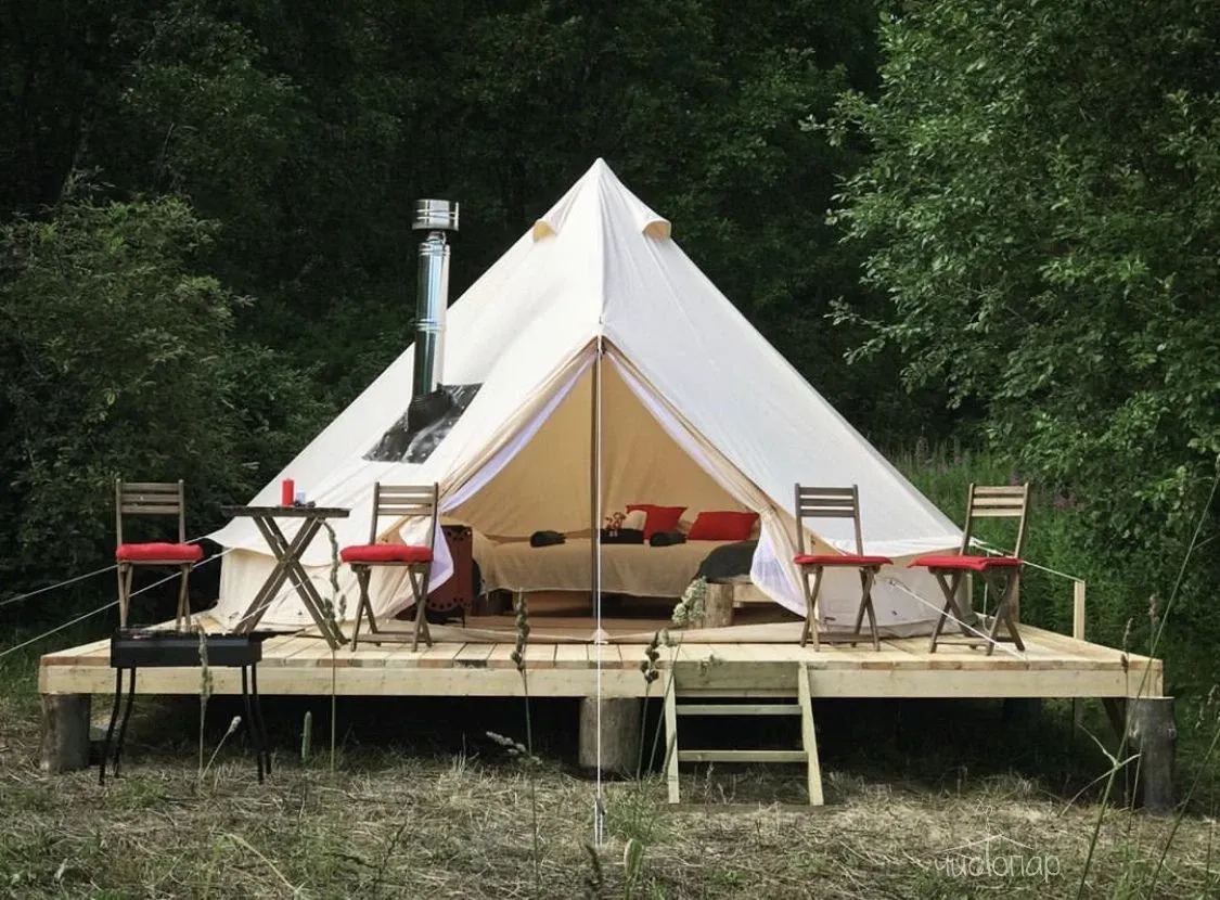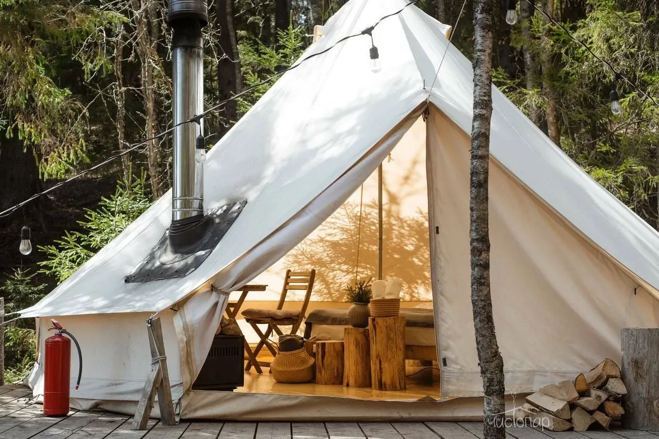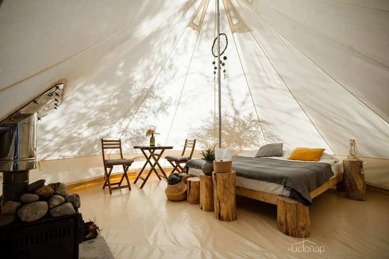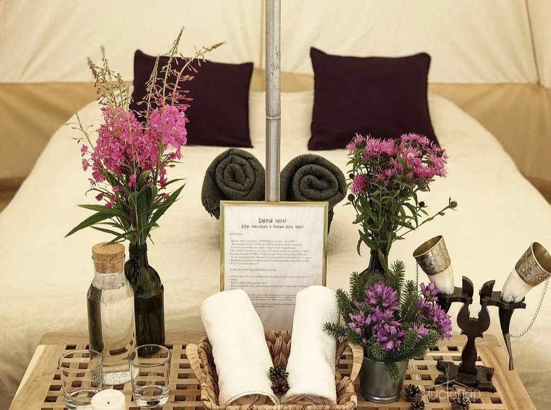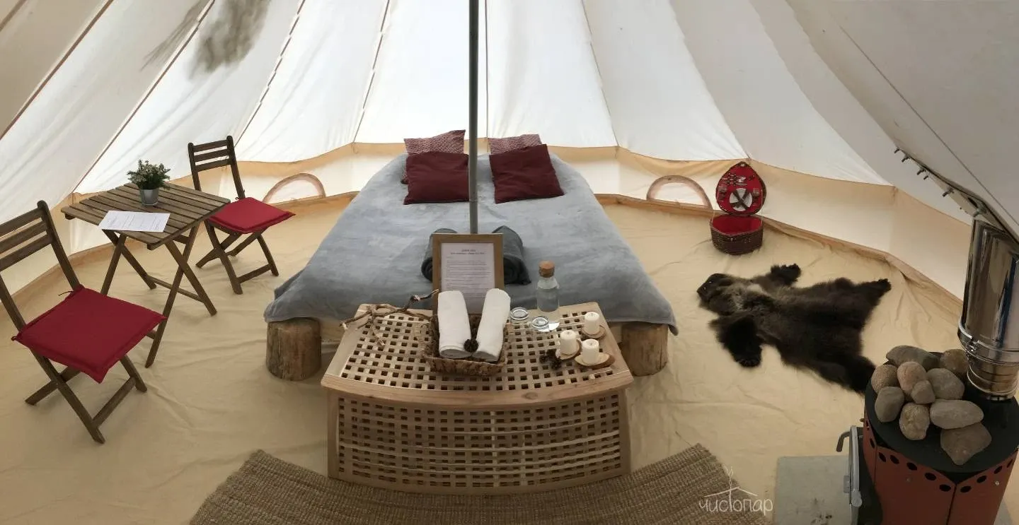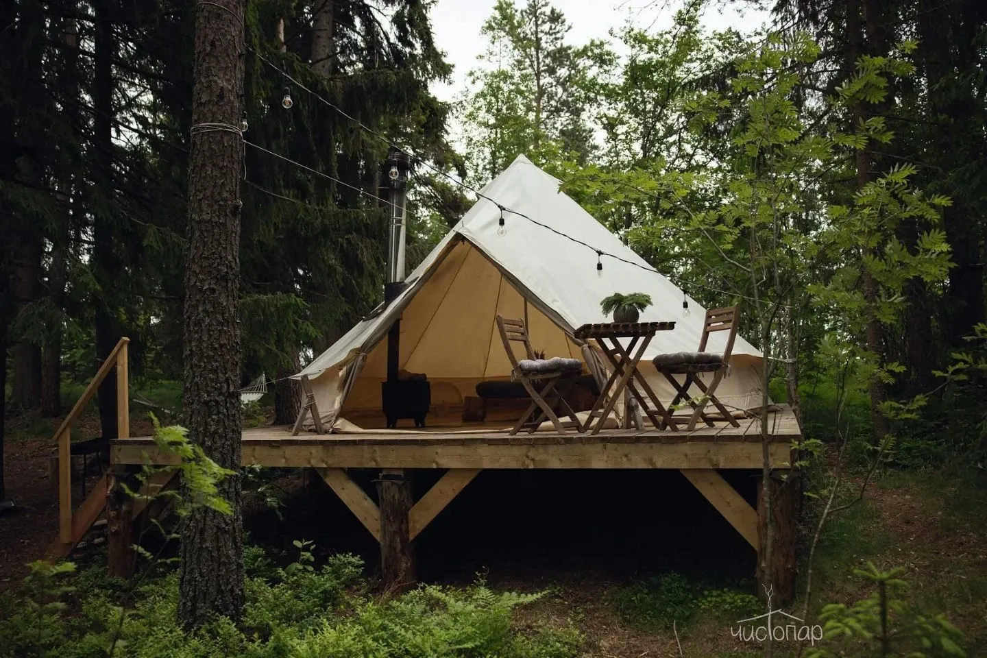 • Шатры. В глэмпинге всего 6 шатров. Они расположены в 50 метров друг от друга. Общая вместимость лагеря — 15 человек.