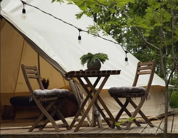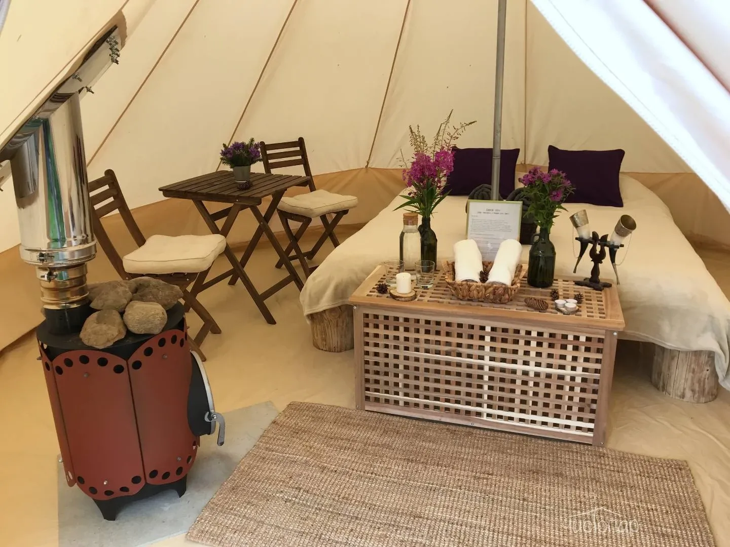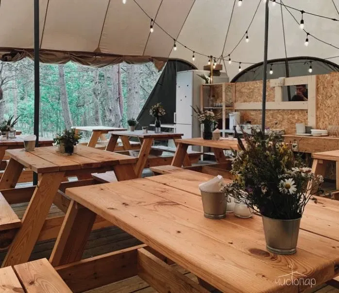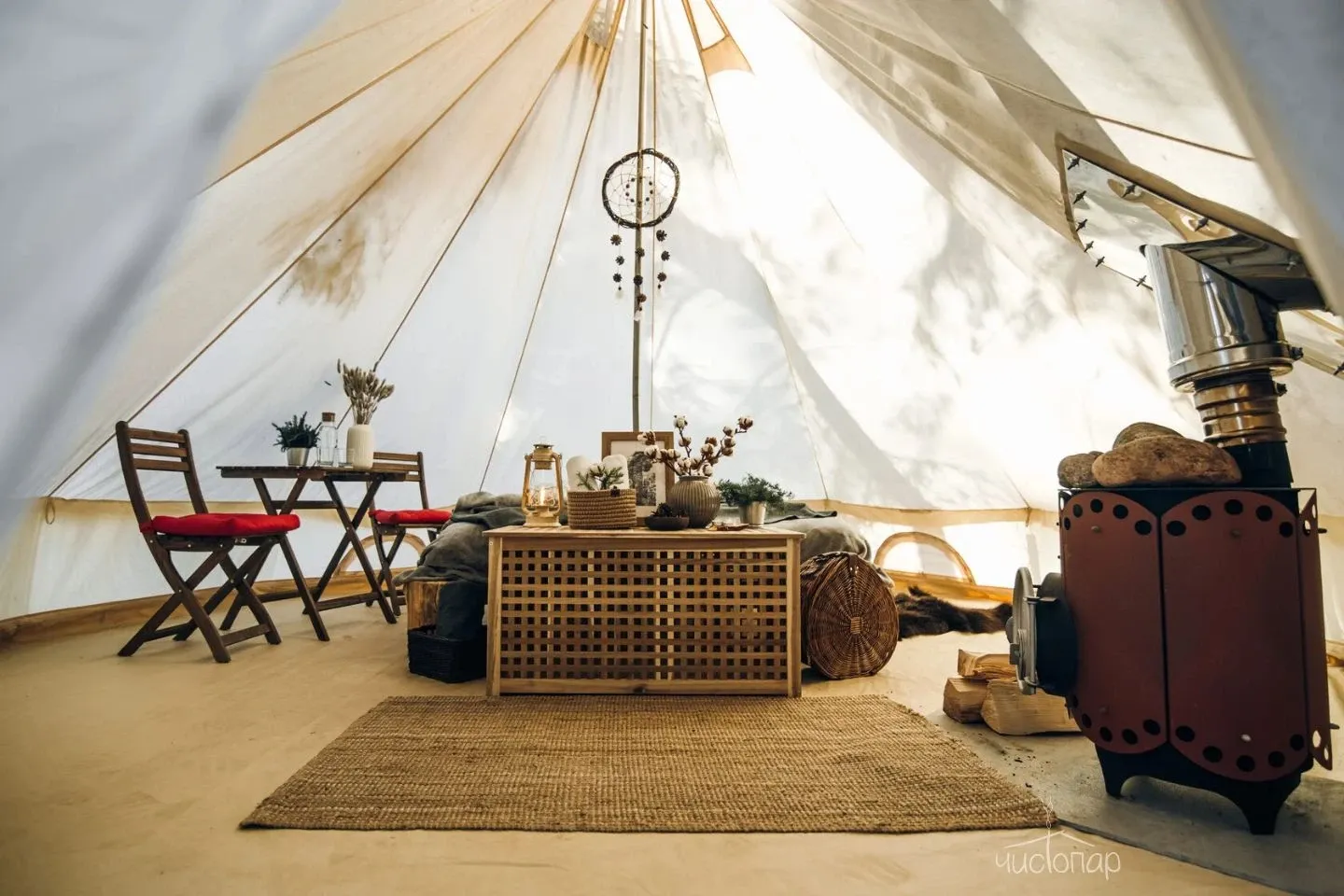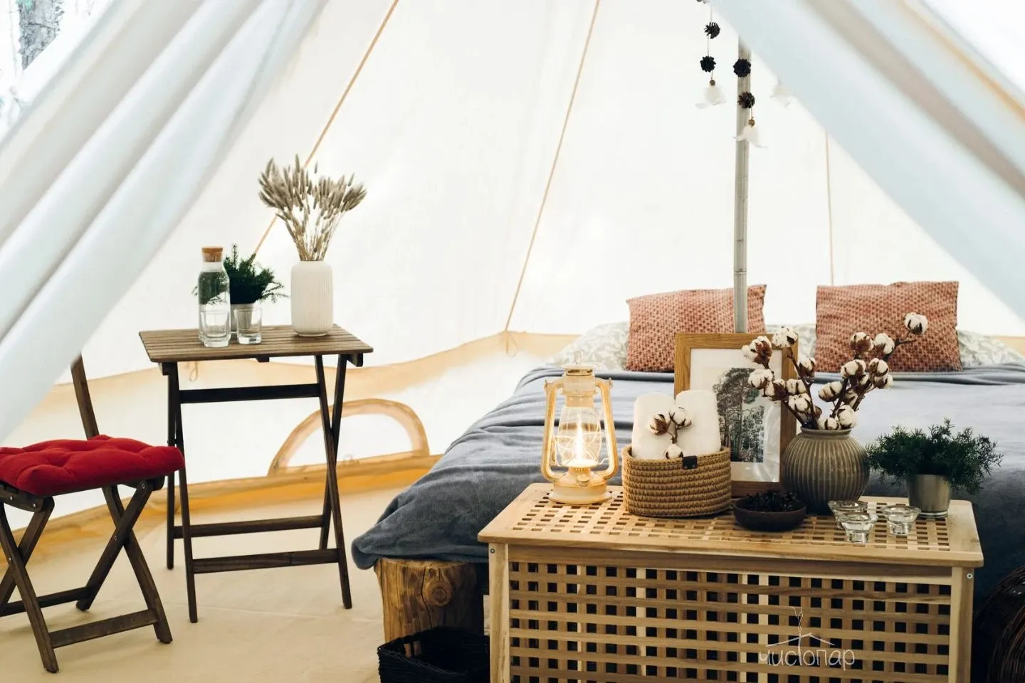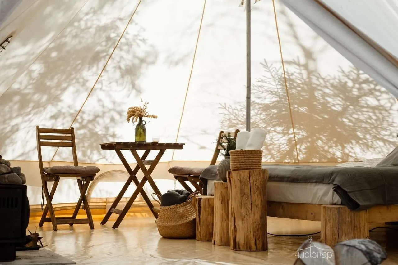 • Шатры. В глэмпинге всего 6 шатров. Они расположены в 50 метров друг от друга. Общая вместимость лагеря — 15 человек.