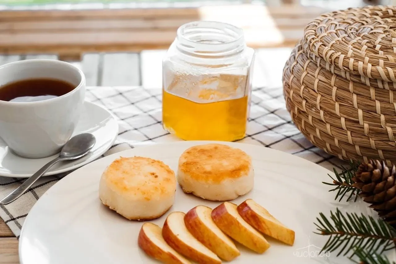 • Веранда с общей кухней. Веранда для завтраков со столами, скамейками и общей мини-кухней.