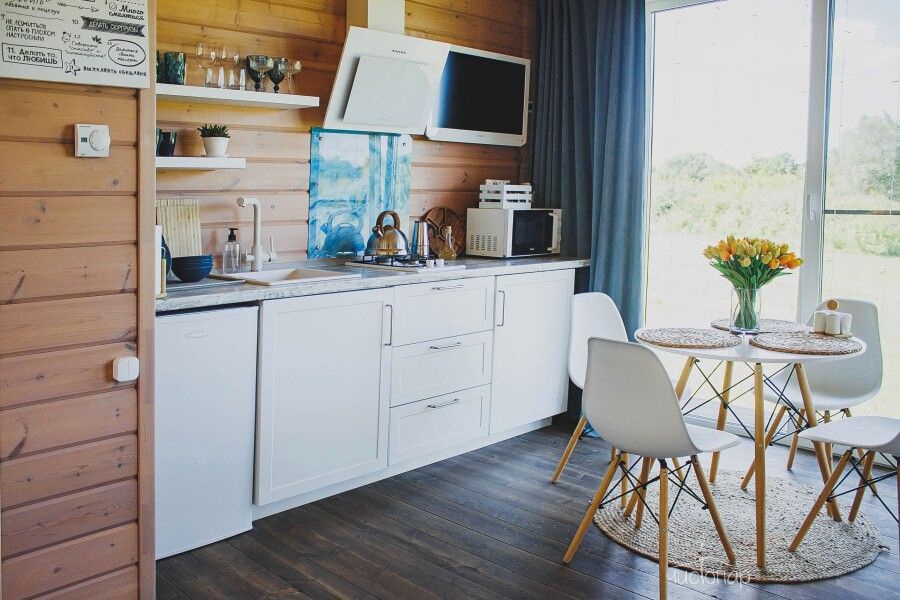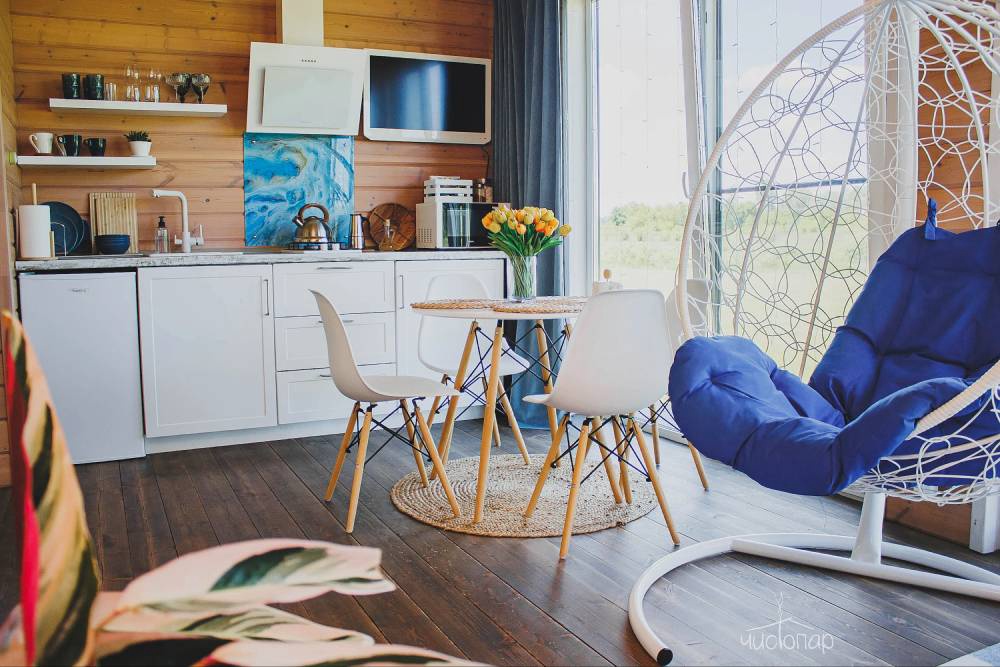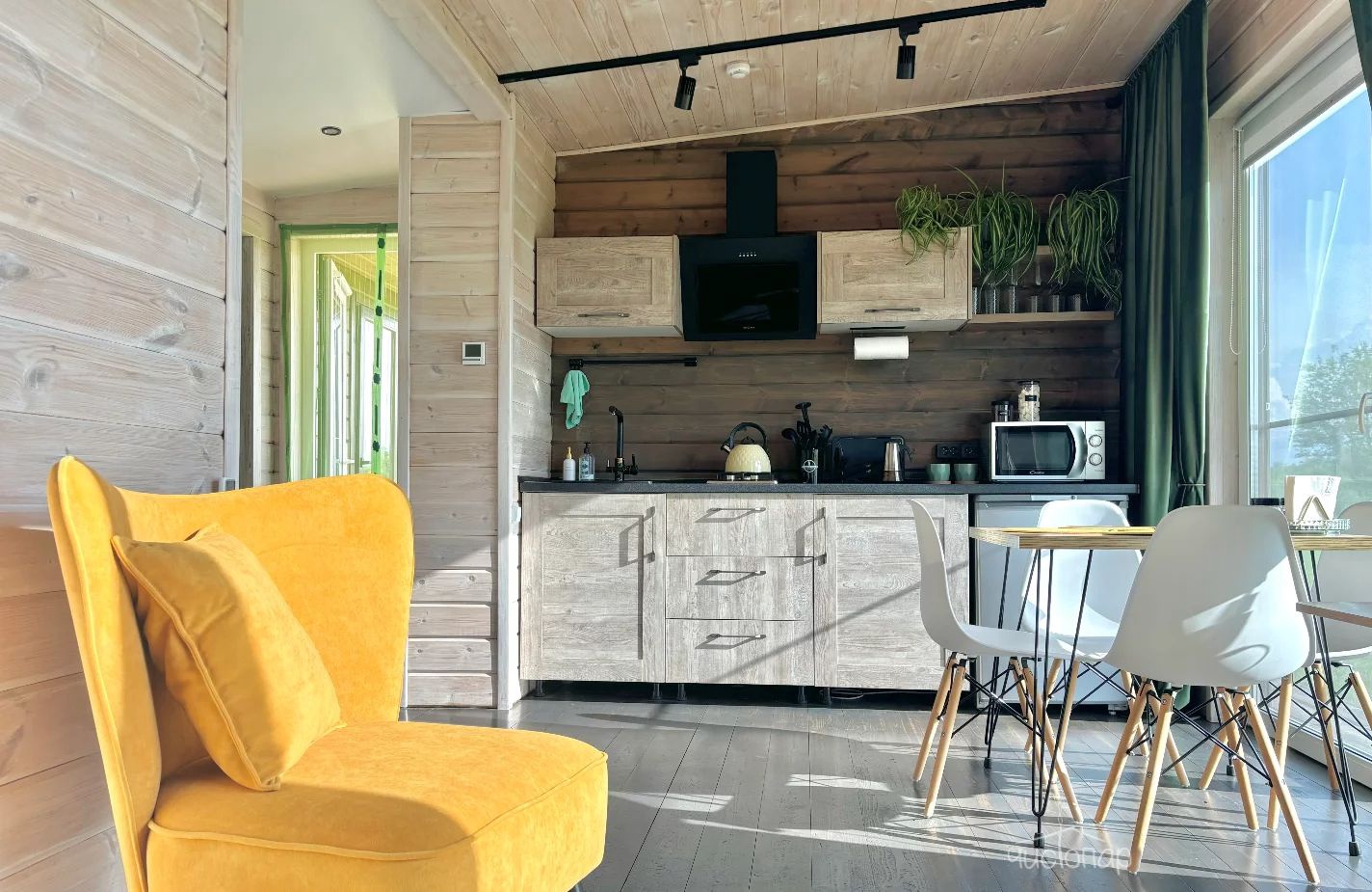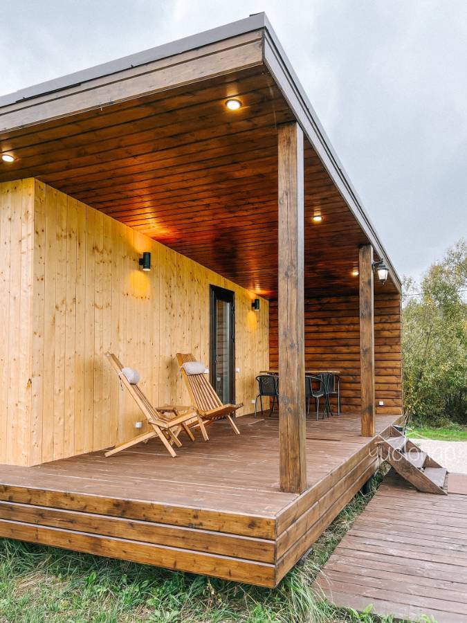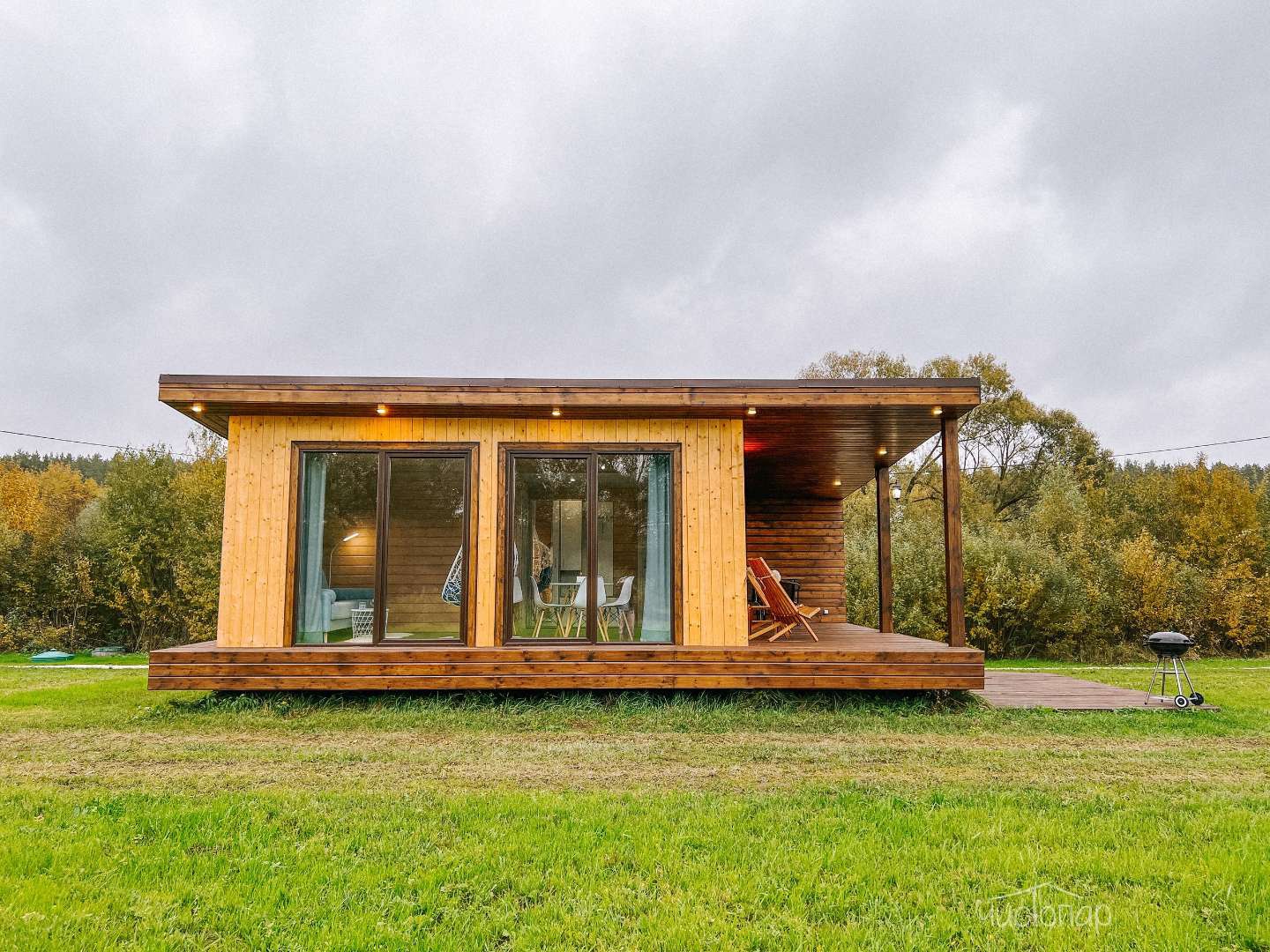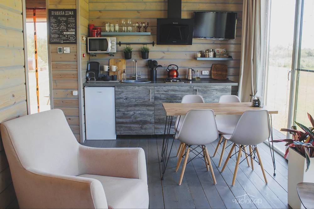 Для проживания предоставлены 4 домика с панорамными окнами, площадью 50 кв.м каждый. Каждый домик имеет спальню, кухню-гостиную, ванную комнату, прихожую и крытую веранду, что позволяет разместить до 4 человек.