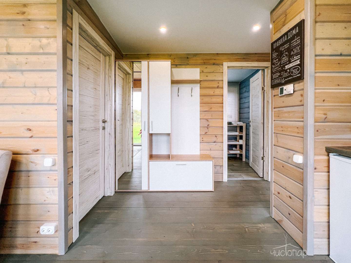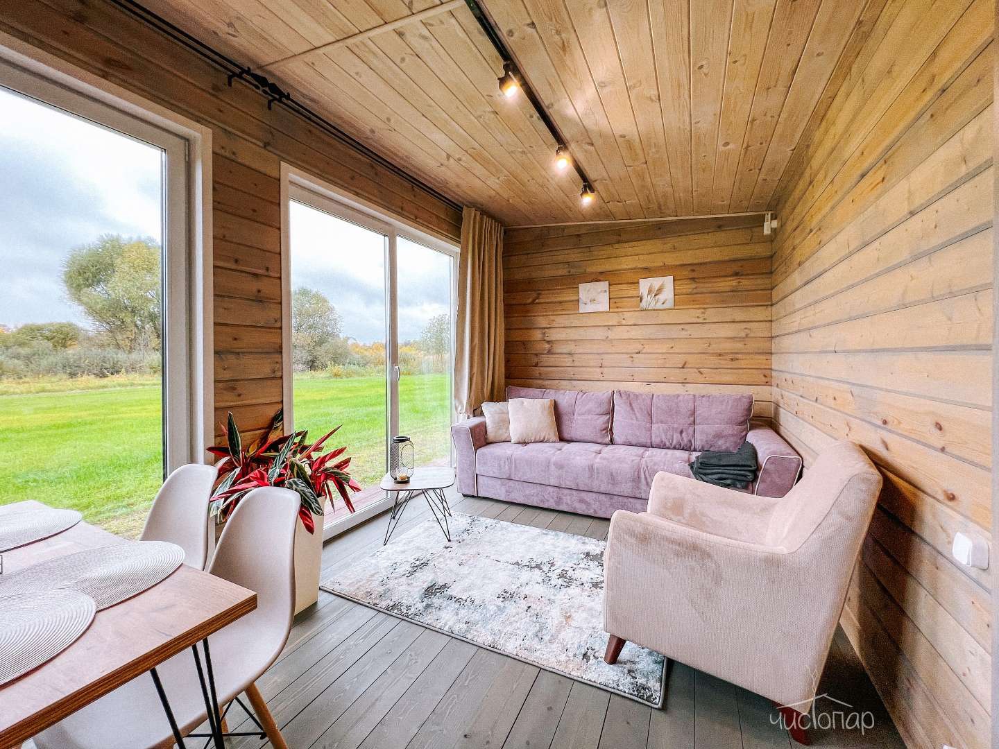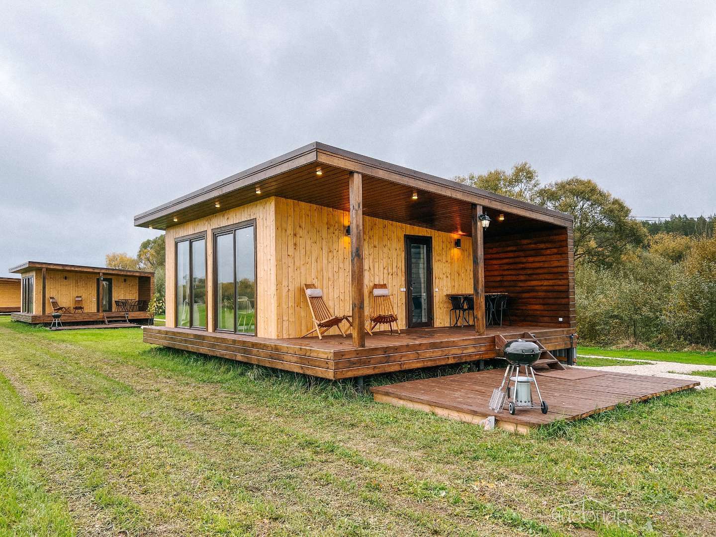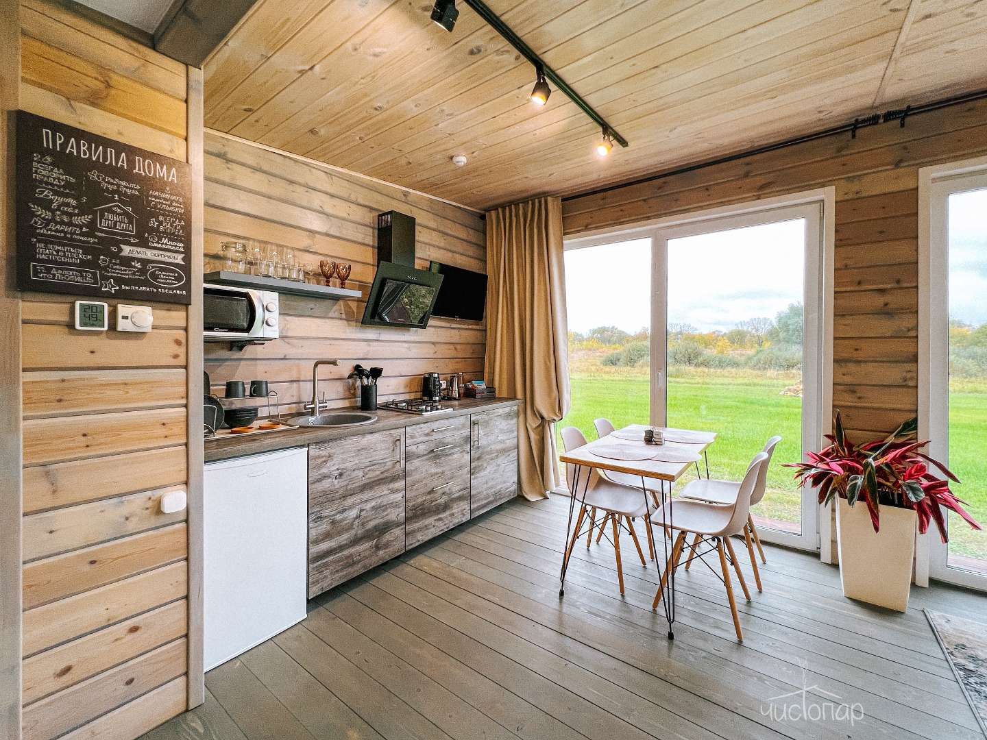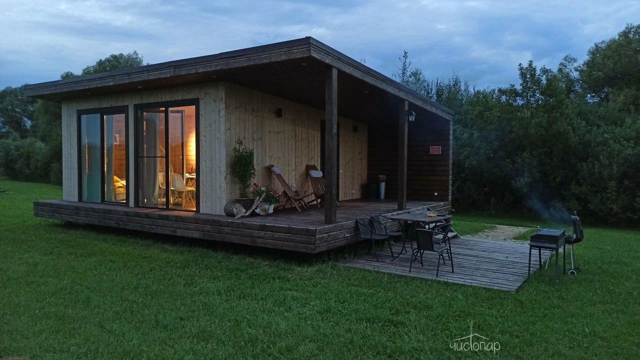 Для проживания предоставлены 4 домика с панорамными окнами, площадью 50 кв.м каждый. Каждый домик имеет спальню, кухню-гостиную, ванную комнату, прихожую и крытую веранду, что позволяет разместить до 4 человек.