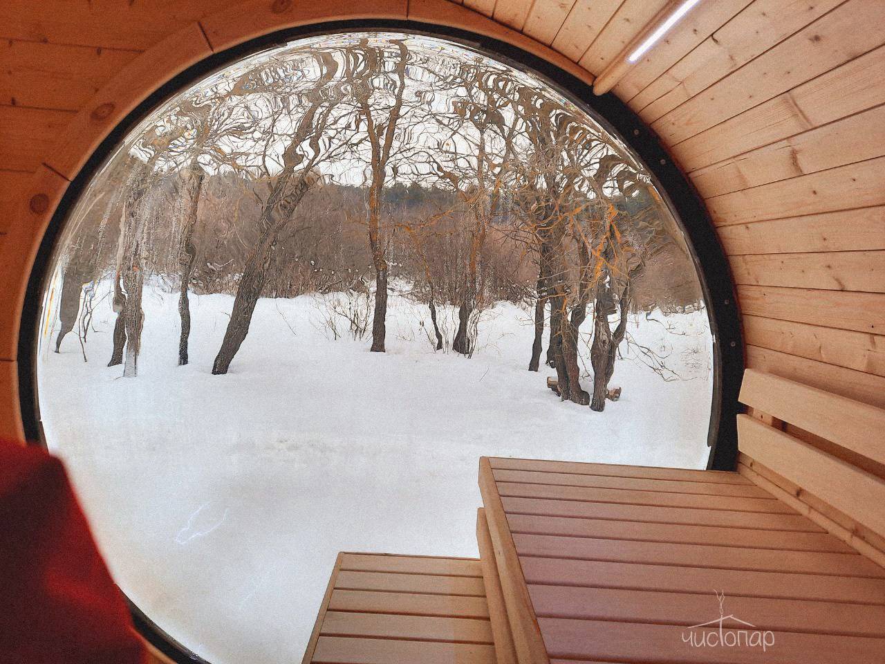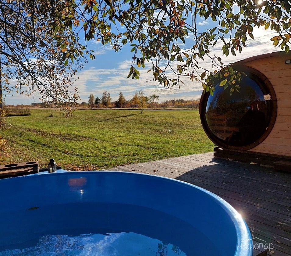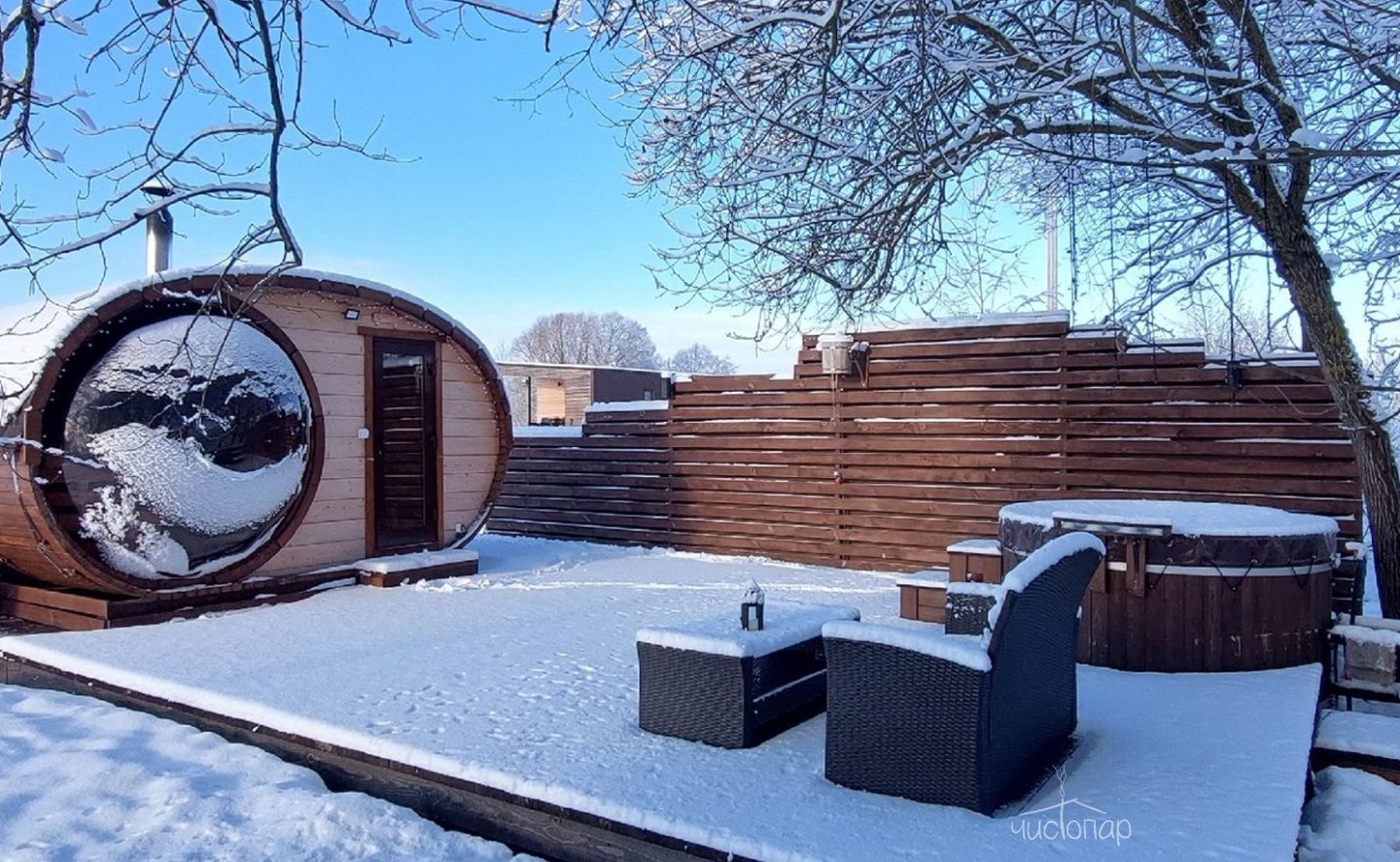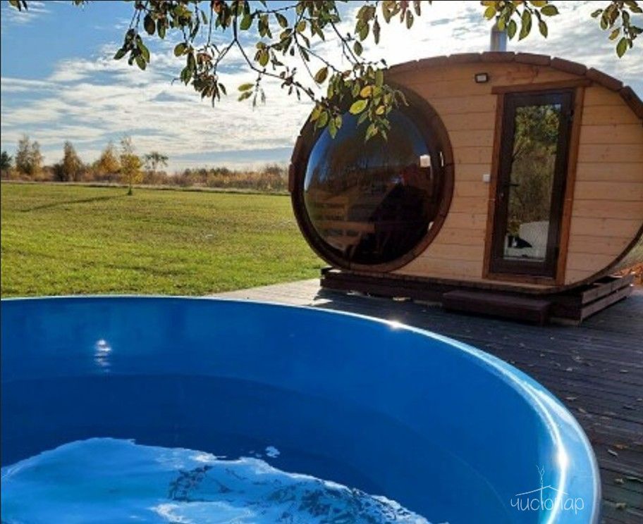 На территории эко-фермы есть зона релакса с русской дровяной баней и купелью, бодряще холодной или расслабляюще горячей. Баня с панорамным окном. Предоставляются эфирные масла, разные виды чая и домашнее варенье. Большая купель и обливное ведро с ледяной водой.