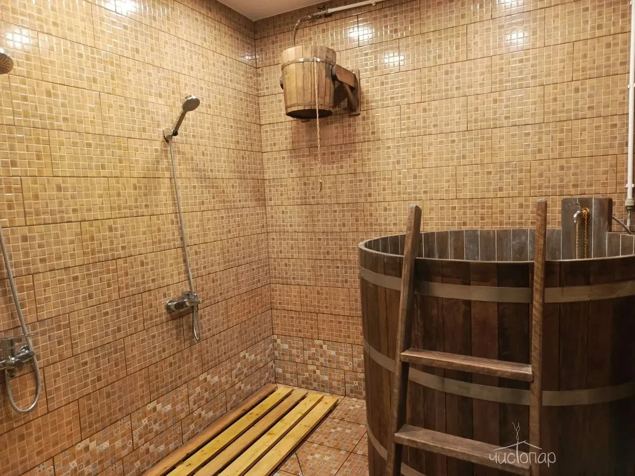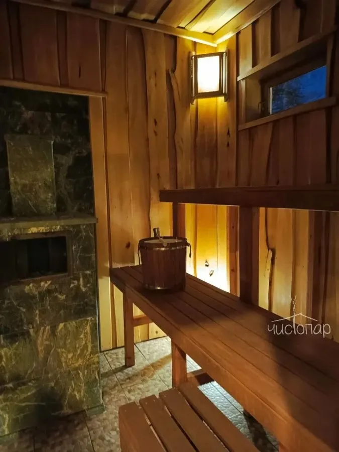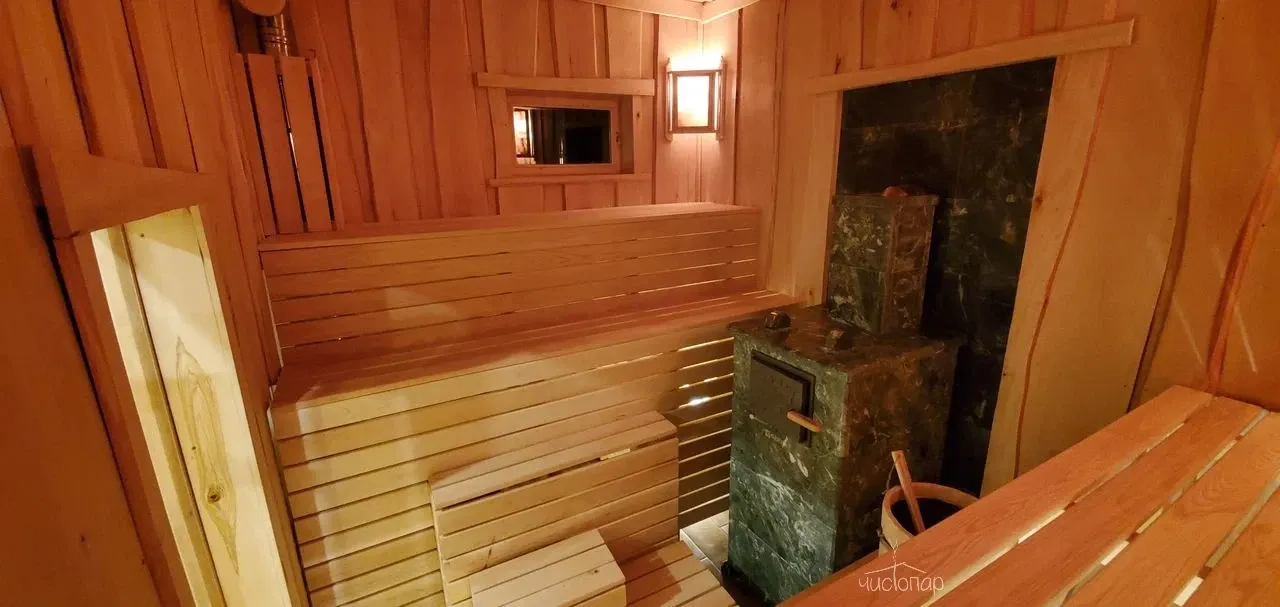 - Русскую баню с современной чугунной печью облицованной змеевиком и наполненной малахитовыми камнями, которая позволяет варить мелкодисперсионный пар. Высота парной от 245 до 290 см, что позволяет работать со всем парным пирогом. Данную печь практически невозможно залить, это позволяет создать как режим настоящей русской бани, так и режим финской сауны.