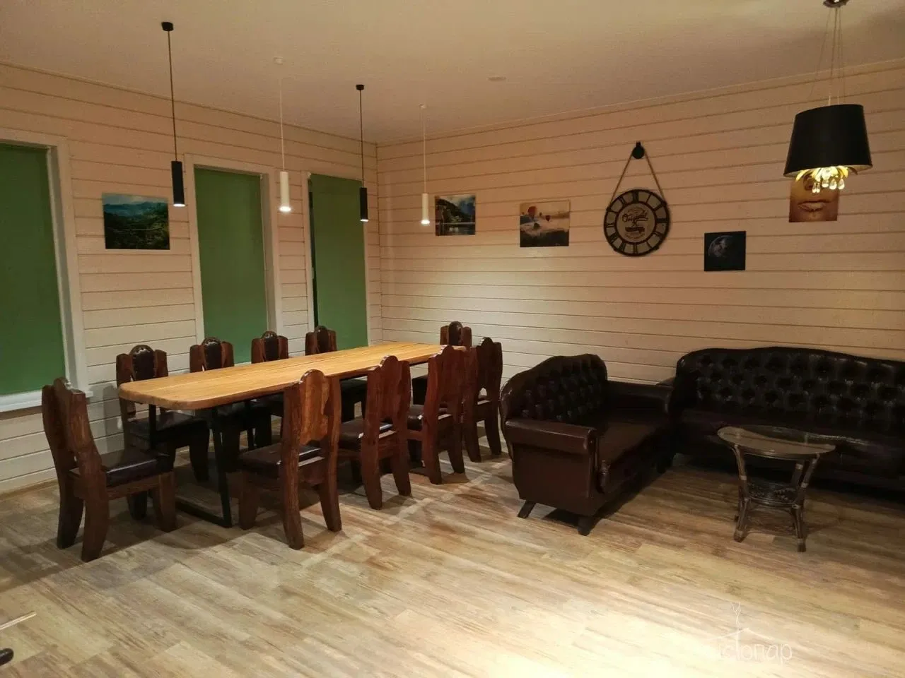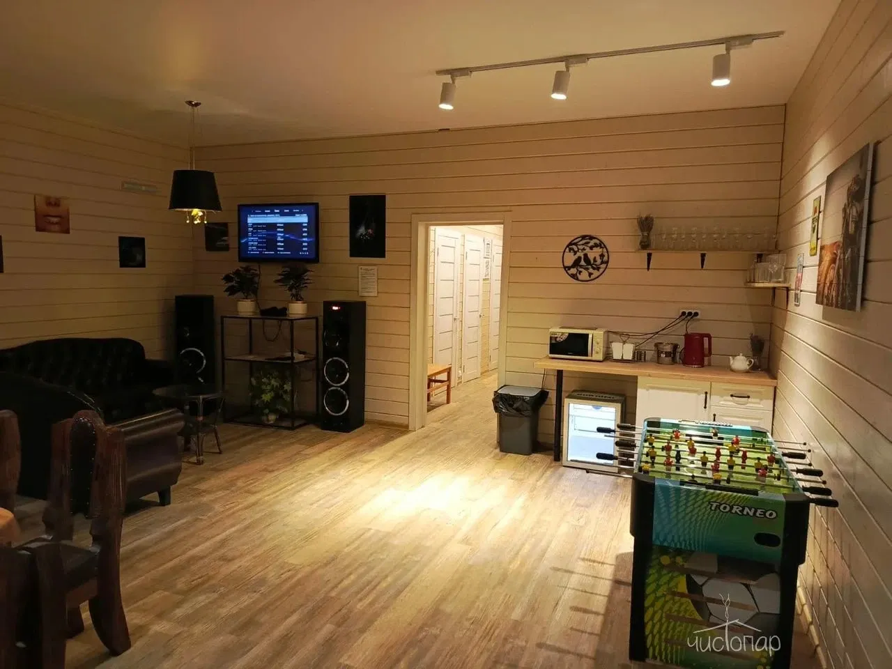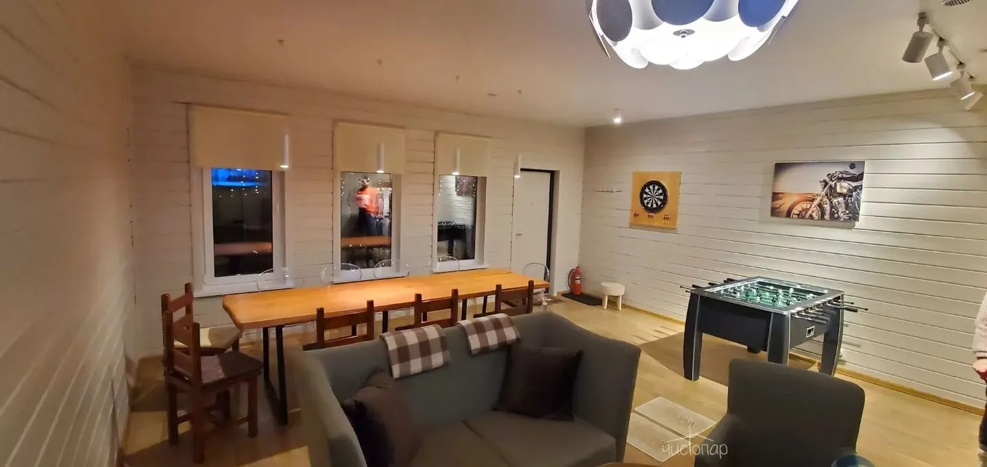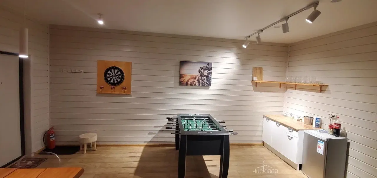 - Комфортный зал отдыха, оснащенный профессиональным караоке AST, уютными диванами, большим столом ручной работы, настольным футболом и дартсом.