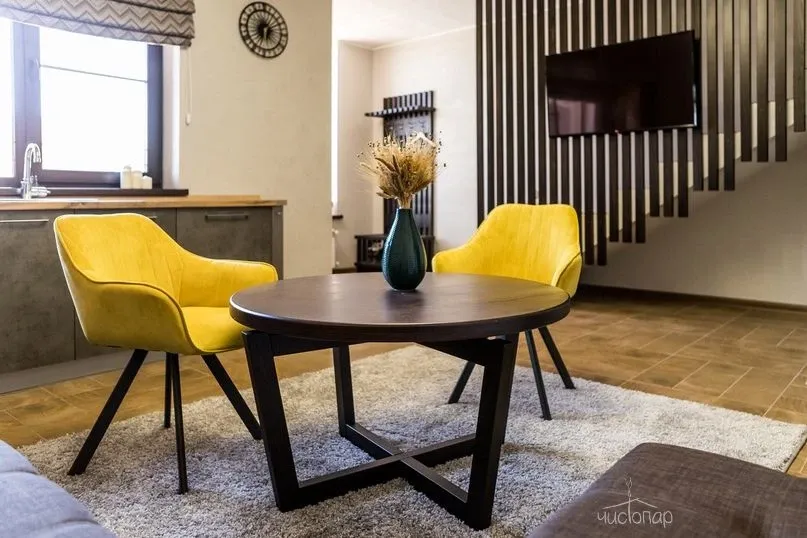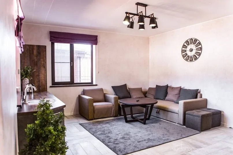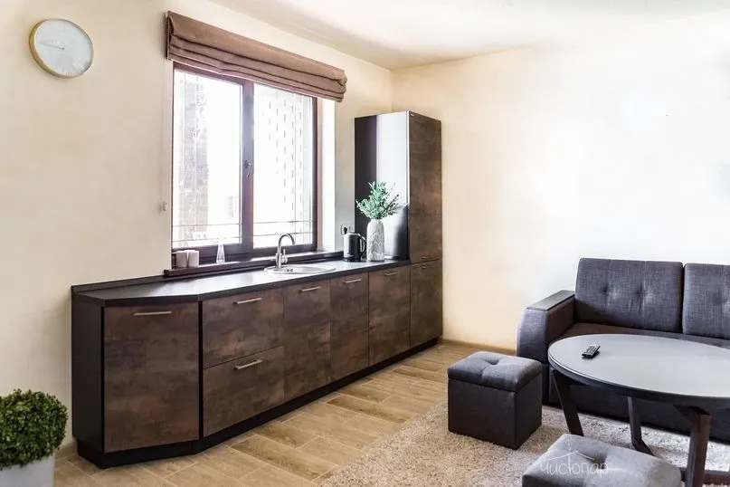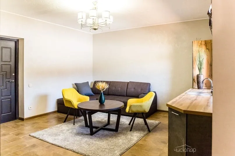 Двухэтажные апартаменты с кухней-гостиной, спальней и двумя санузлами. Общая площадь 50м2.