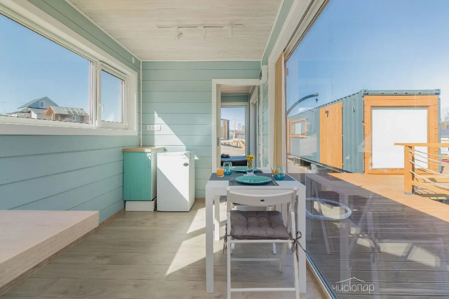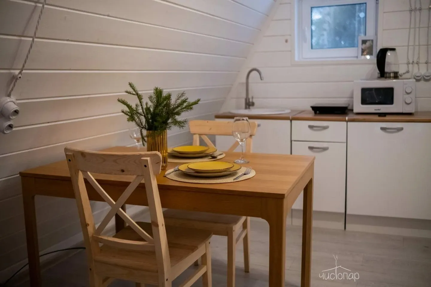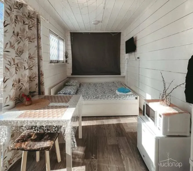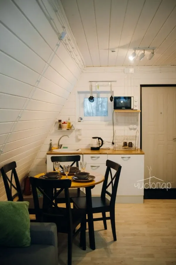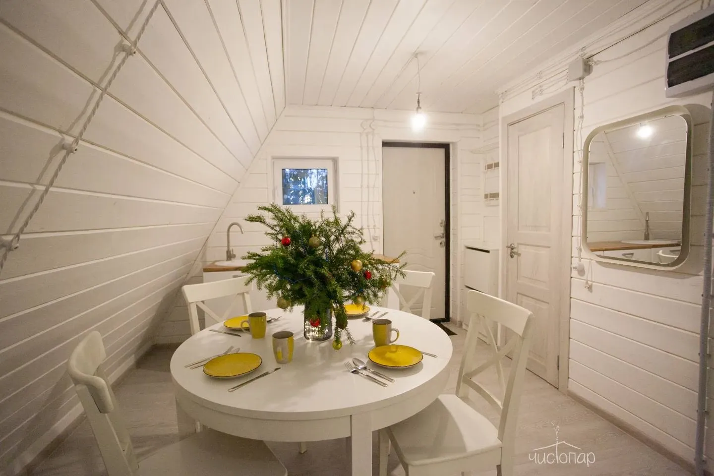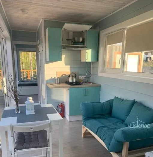 Внутри коттеджей есть все необходимое для комфортного проживания: душевая комната, туалет, горячая и холодная вода, подогреваемые полы, полностью оборудованная кухня с посудой, плитой, холодильником, чайником, доступом к Wi-Fi, телевизором, а также терраса с мангалом и зоной отдыха.