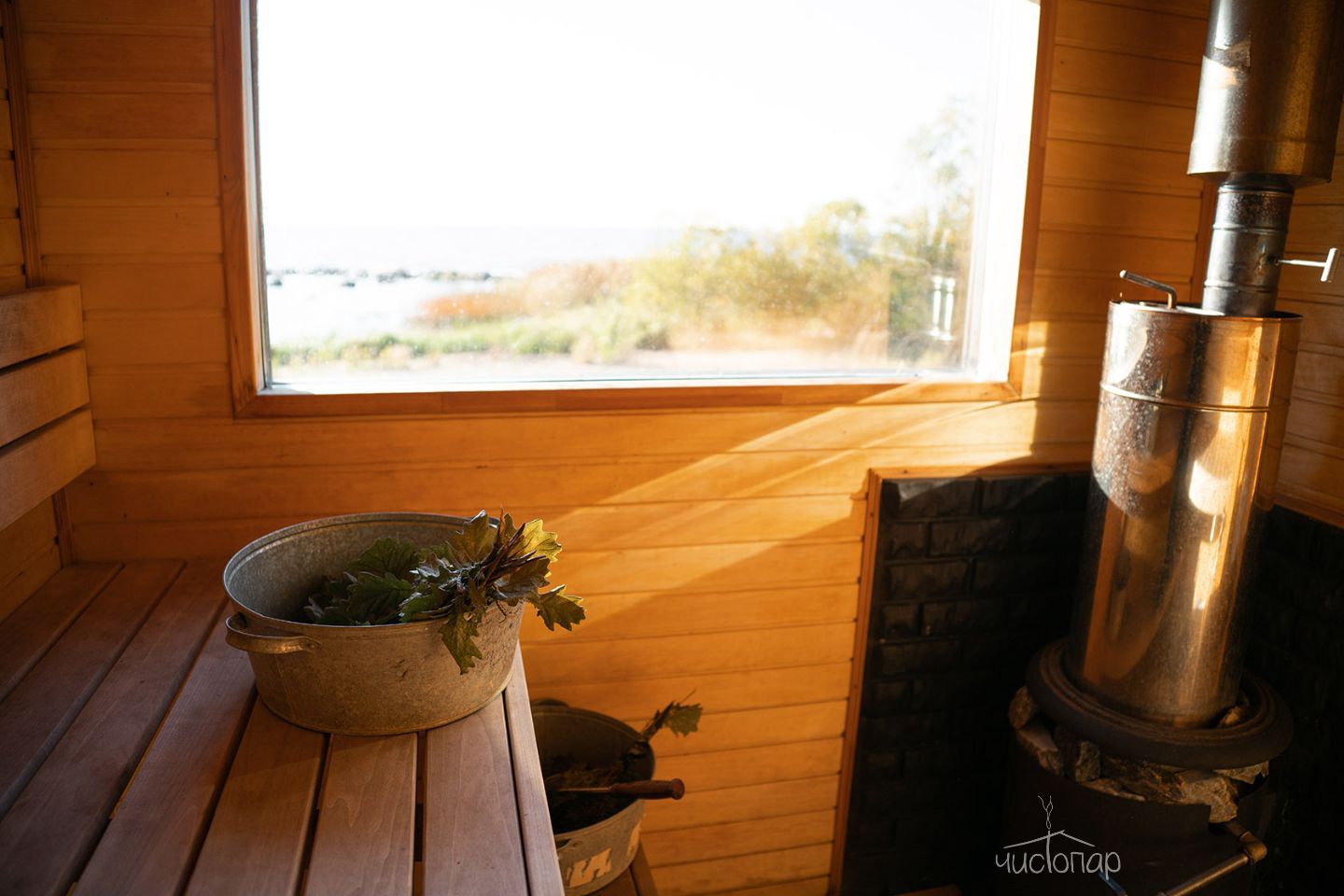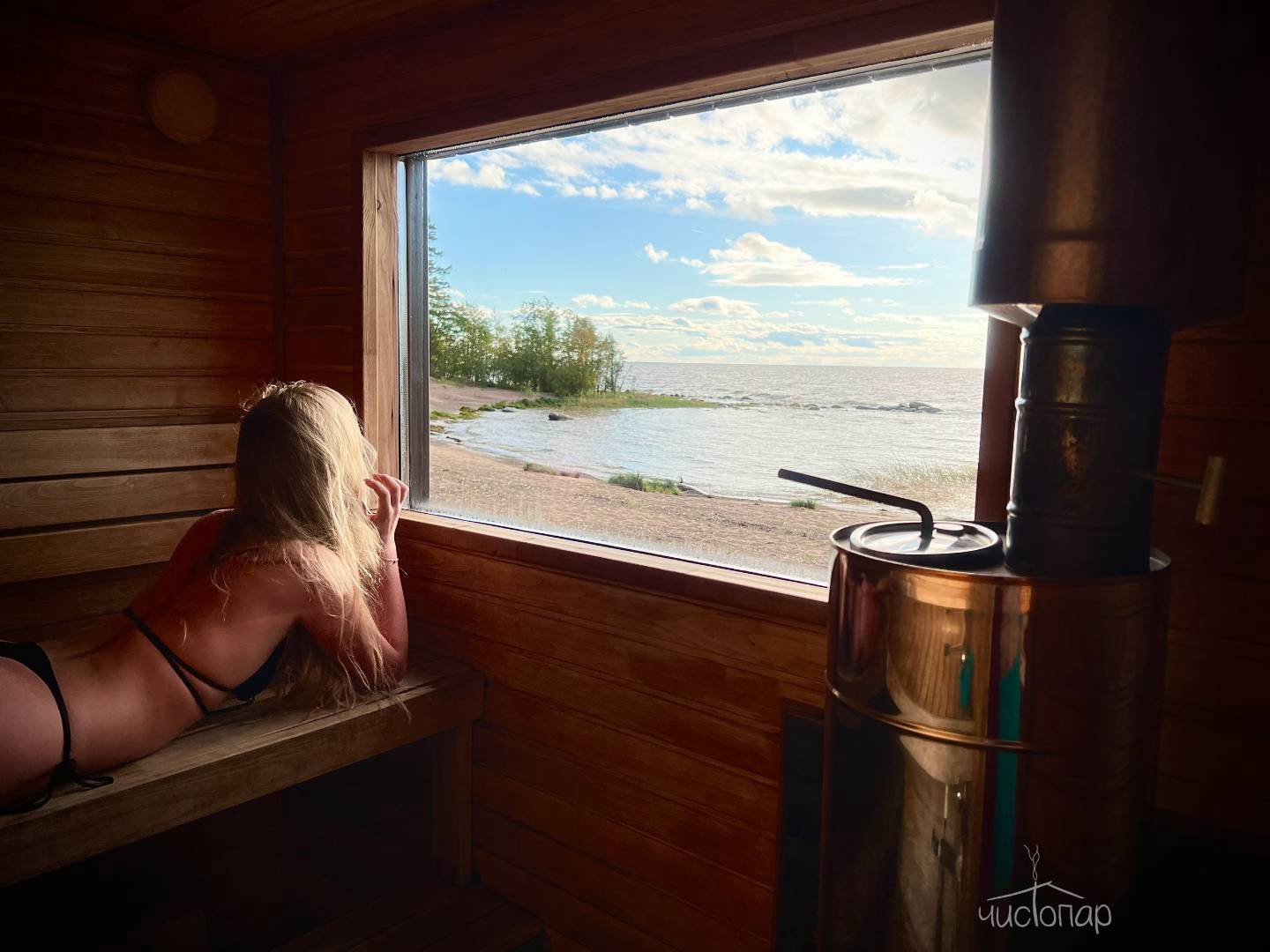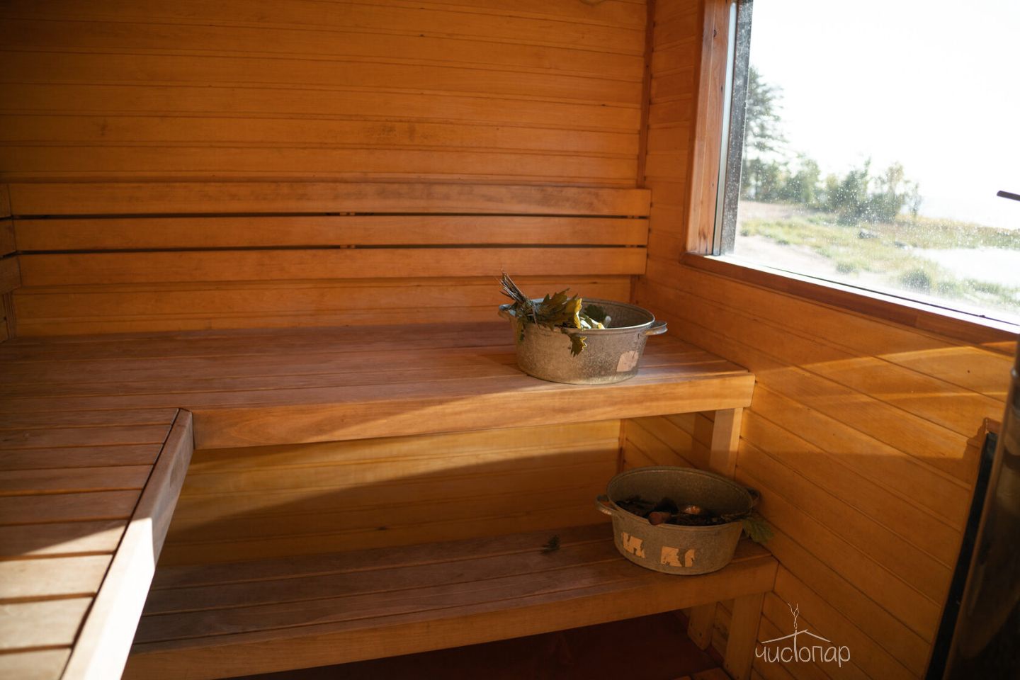 В глэмпинге можно заказать 2 разные бани: паровую или отдельную финскую с купелью. Везде открывается шикарный вид на Ладогу и закат. В банях есть термопот с горячей водой, чай, питьевая вода, полотенца и шапочки для парения. Бани находятся всего в 20 метрах от воды.